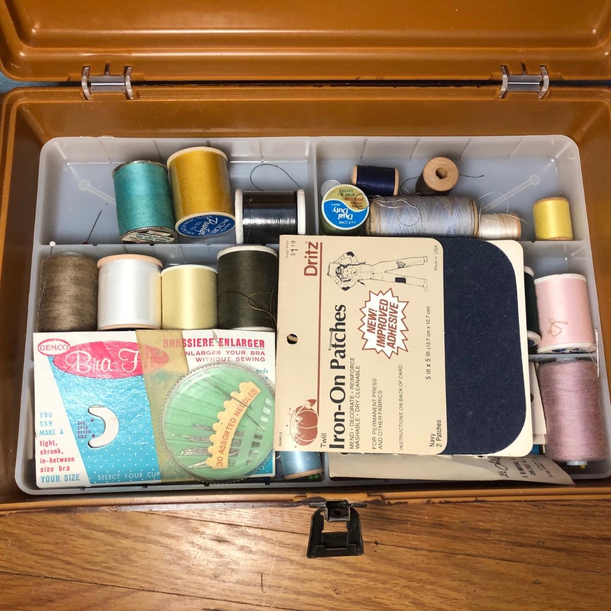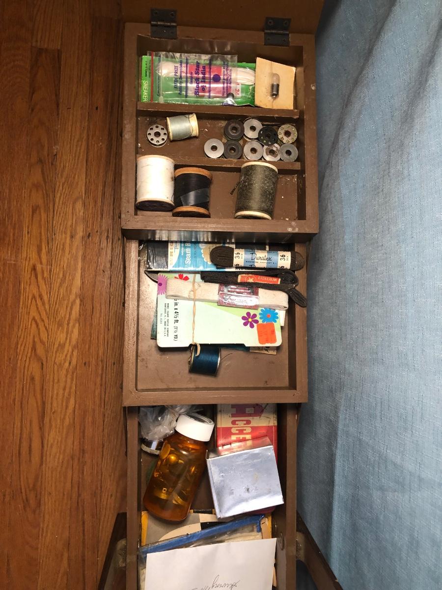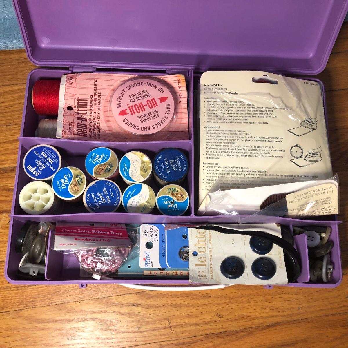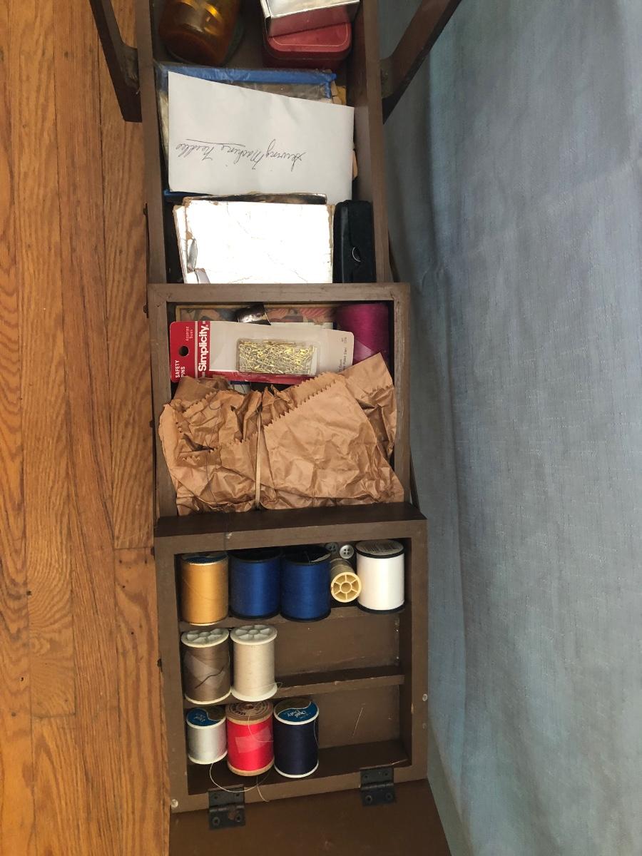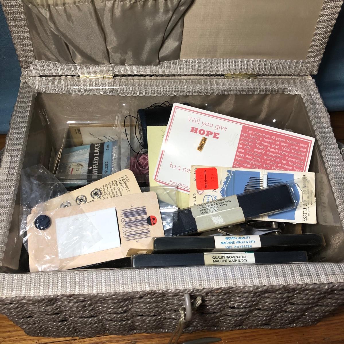 LOT 152M: Vintage Sewing Caddies w/ Supplies & Framed McCall's Poster