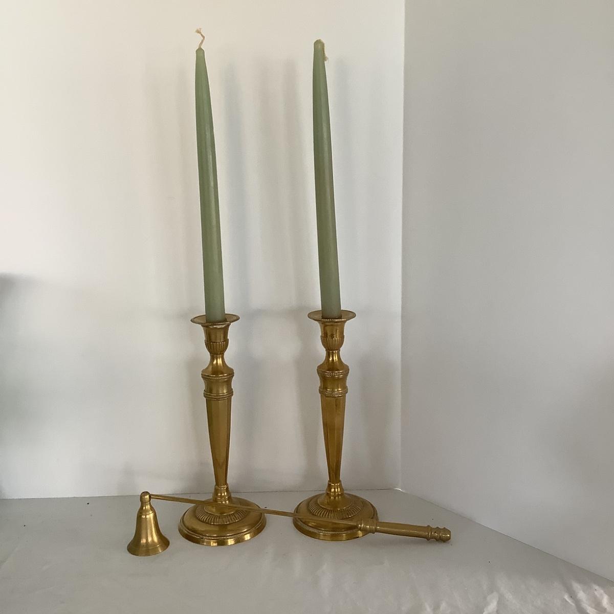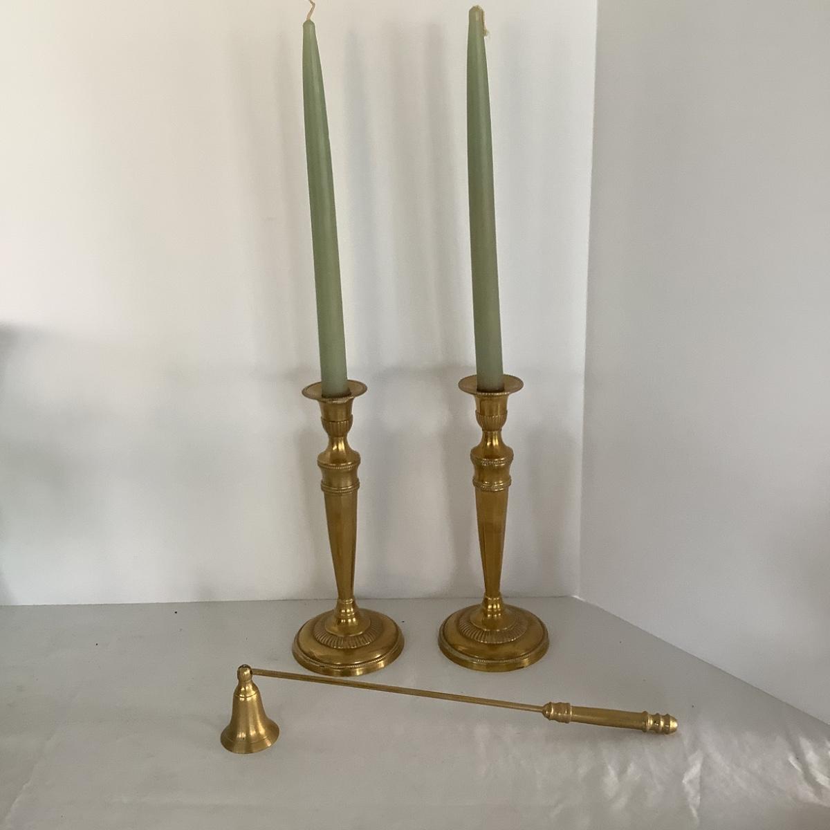 Lot 8644 Pair of Polished Brass Candlesticks & Polished Brass Articulated Candle Snuffer with round Handle