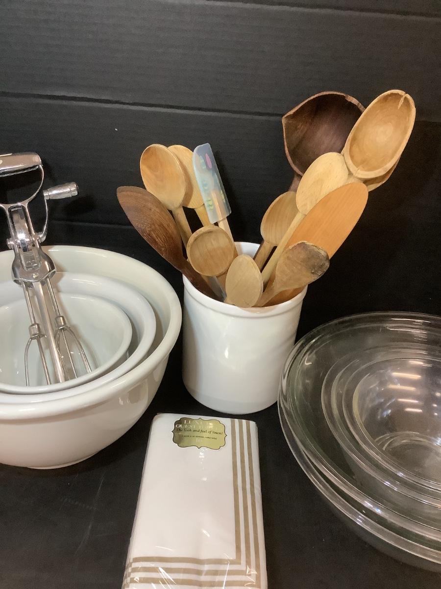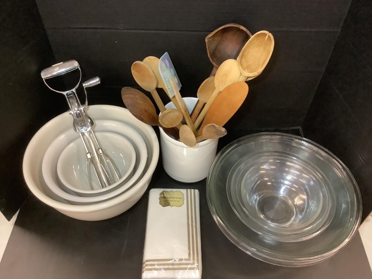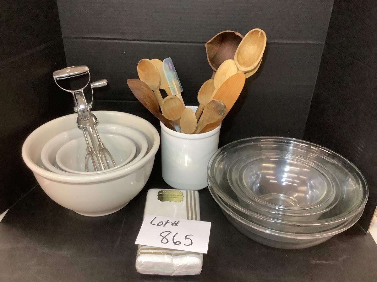 Lot 865. Lot of Mixing Bowls / Wooden Spoons / Pottery Jar