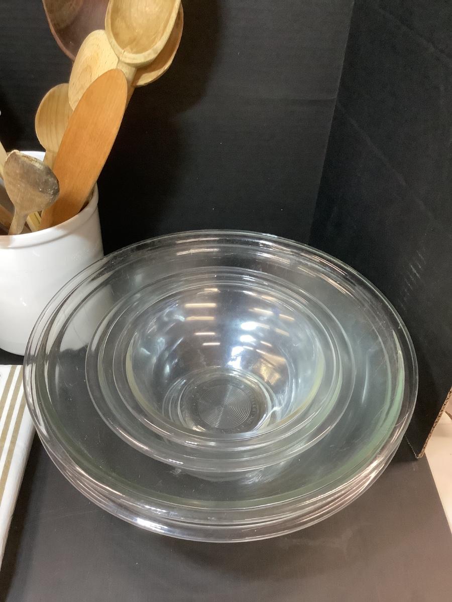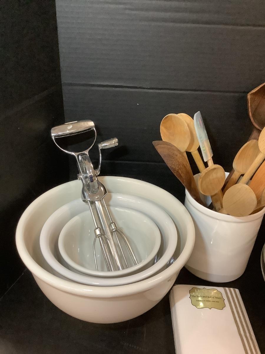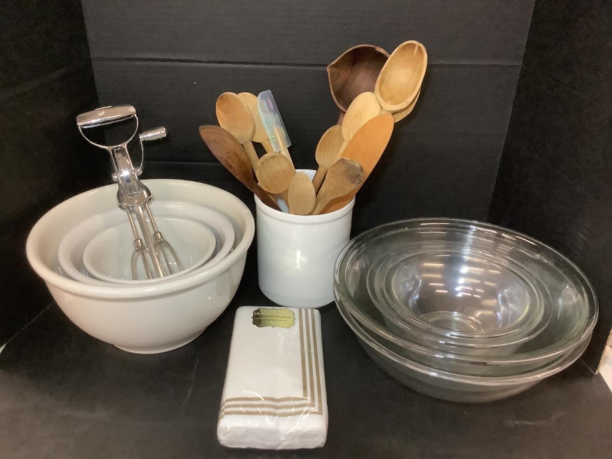 Lot 865. Lot of Mixing Bowls / Wooden Spoons / Pottery Jar