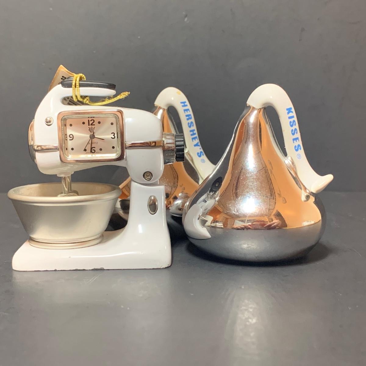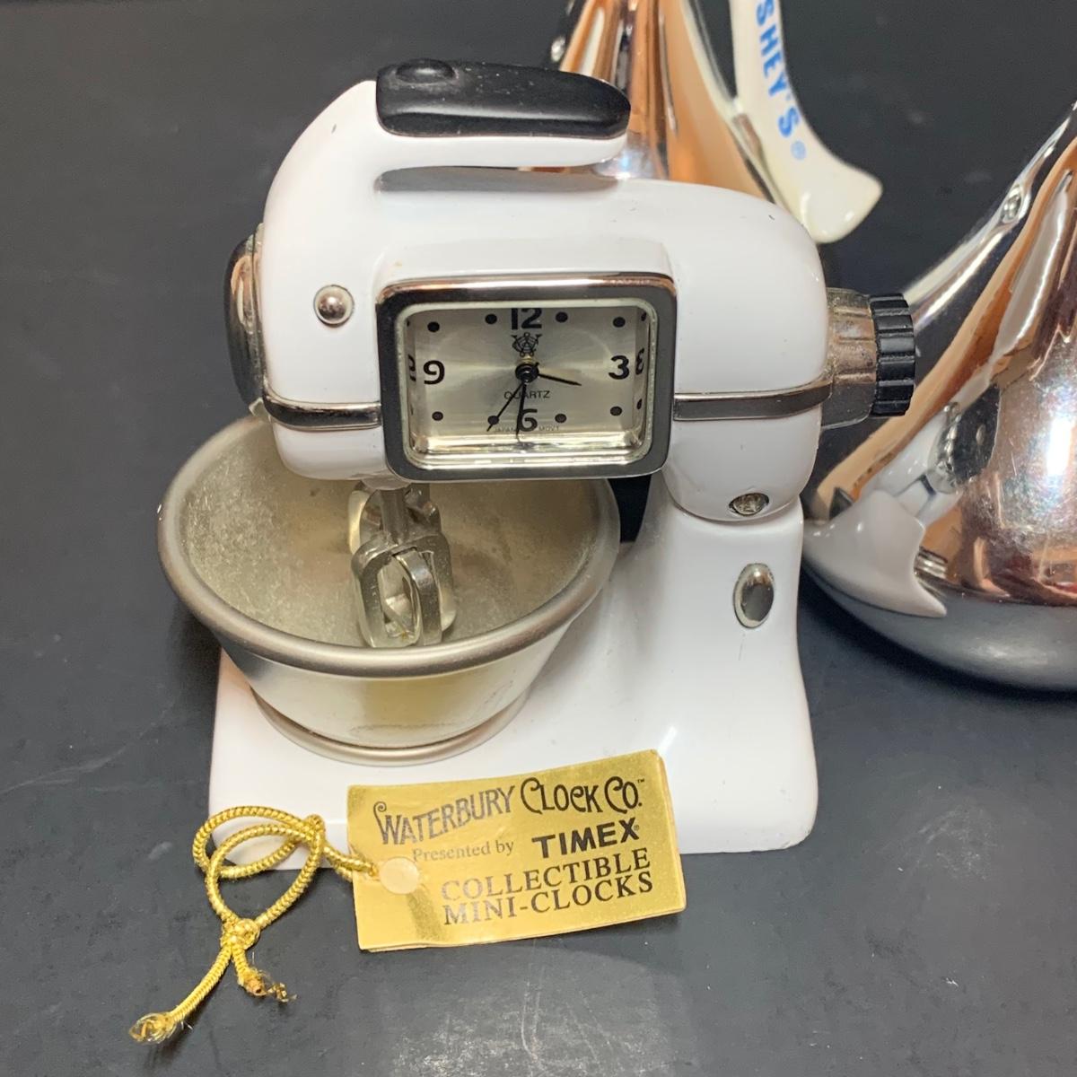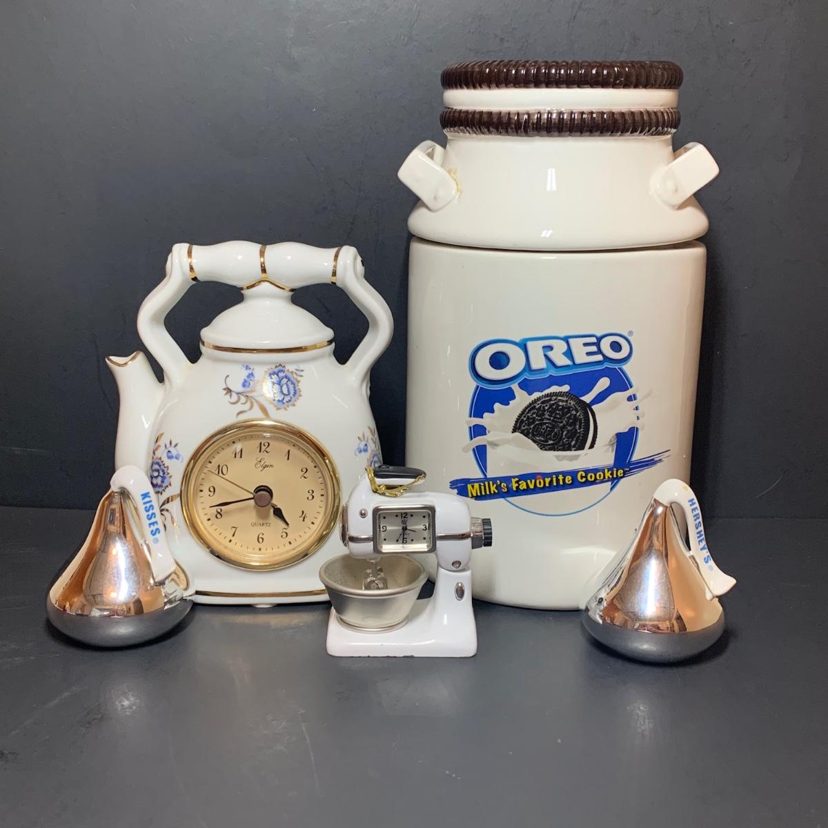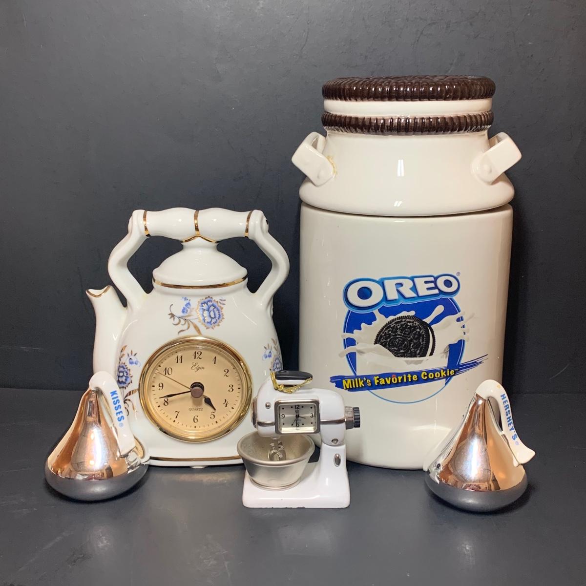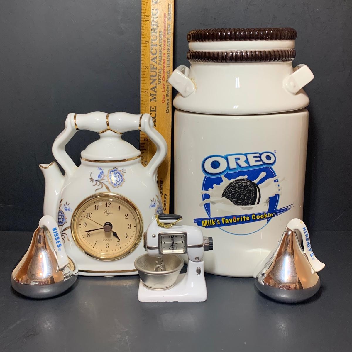 LOT 17: Oreo Milk Can Cookie Jar, Tea Pot Clock, Hershey Salt & Pepper & Waterbury Miniature Mixer Clock