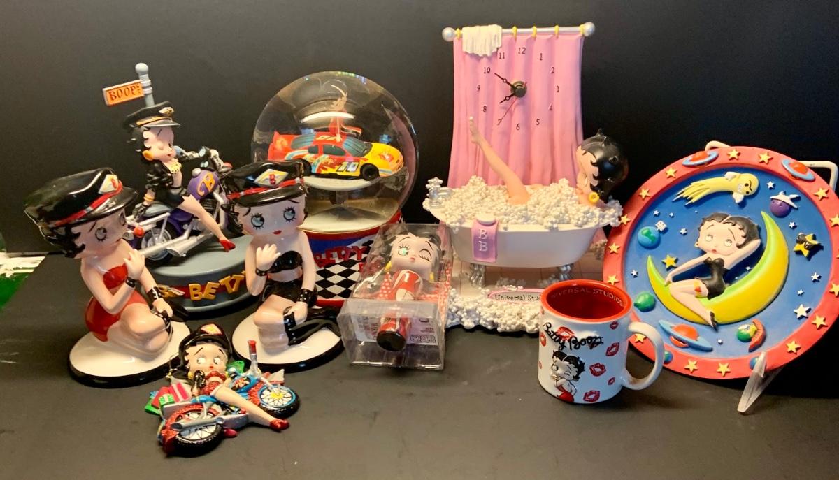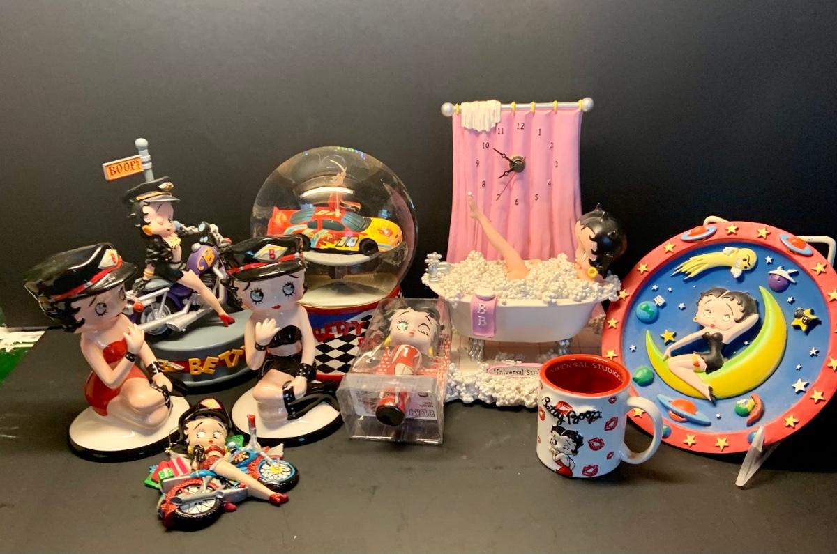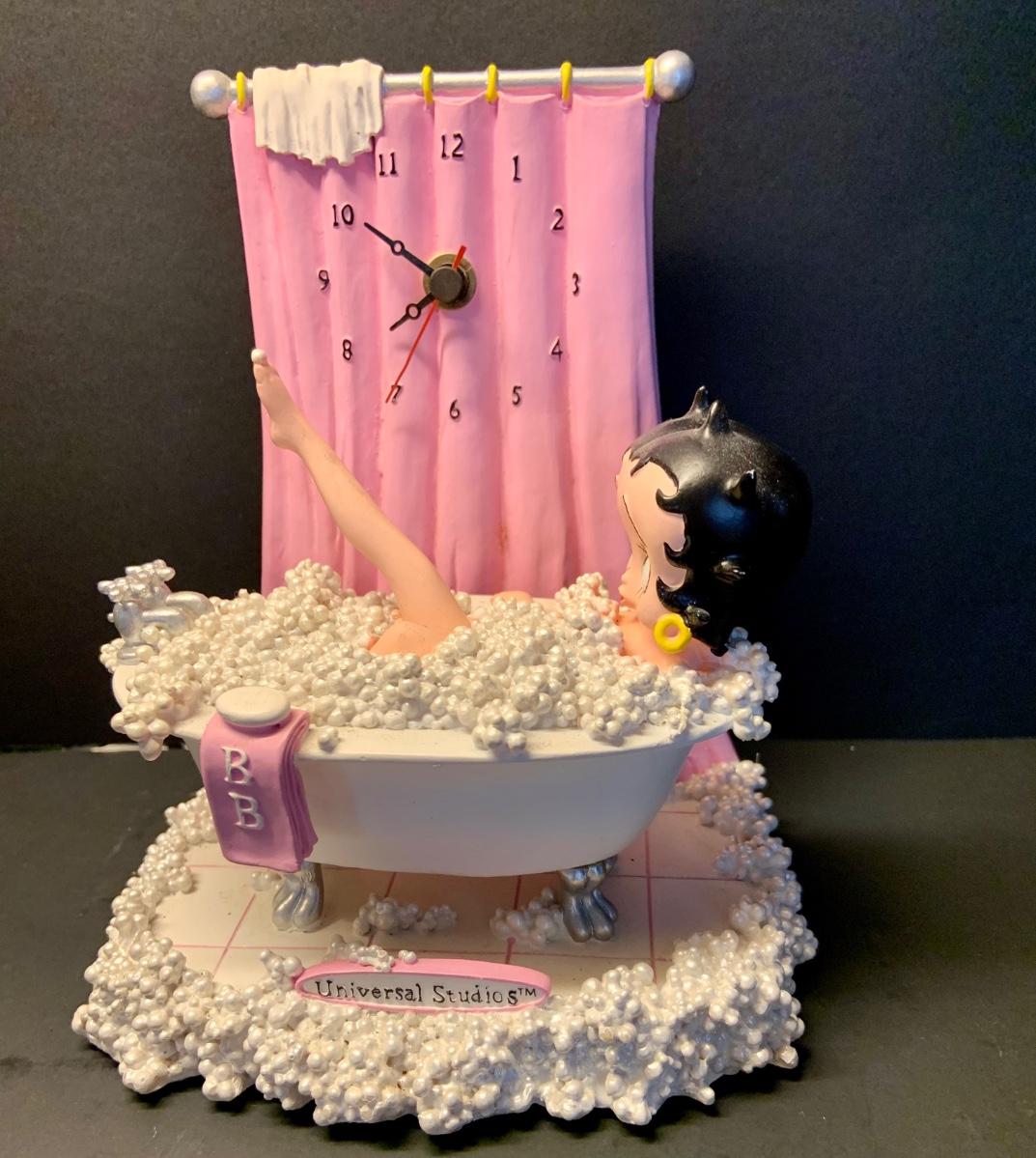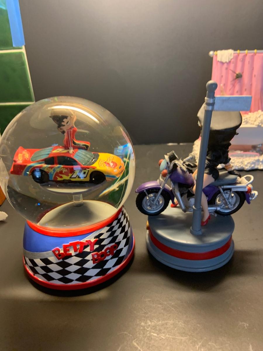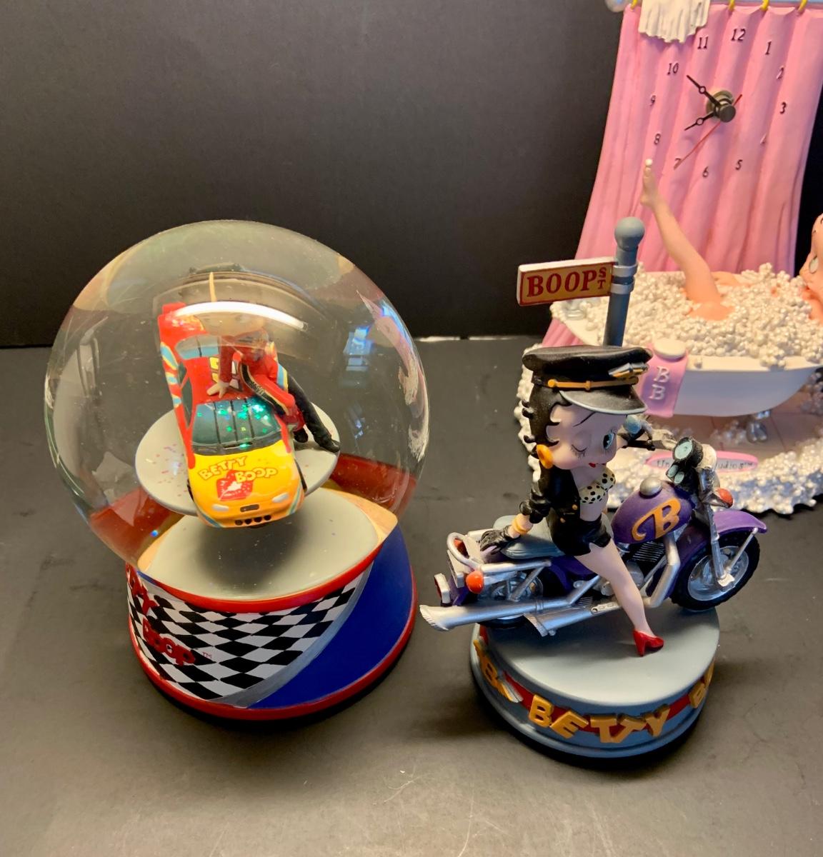 LOT:38G: Betty Boop Universal Studios Bubble Bath Clock, Salt & Pepper Shaker Music Box, Water Globe and More.