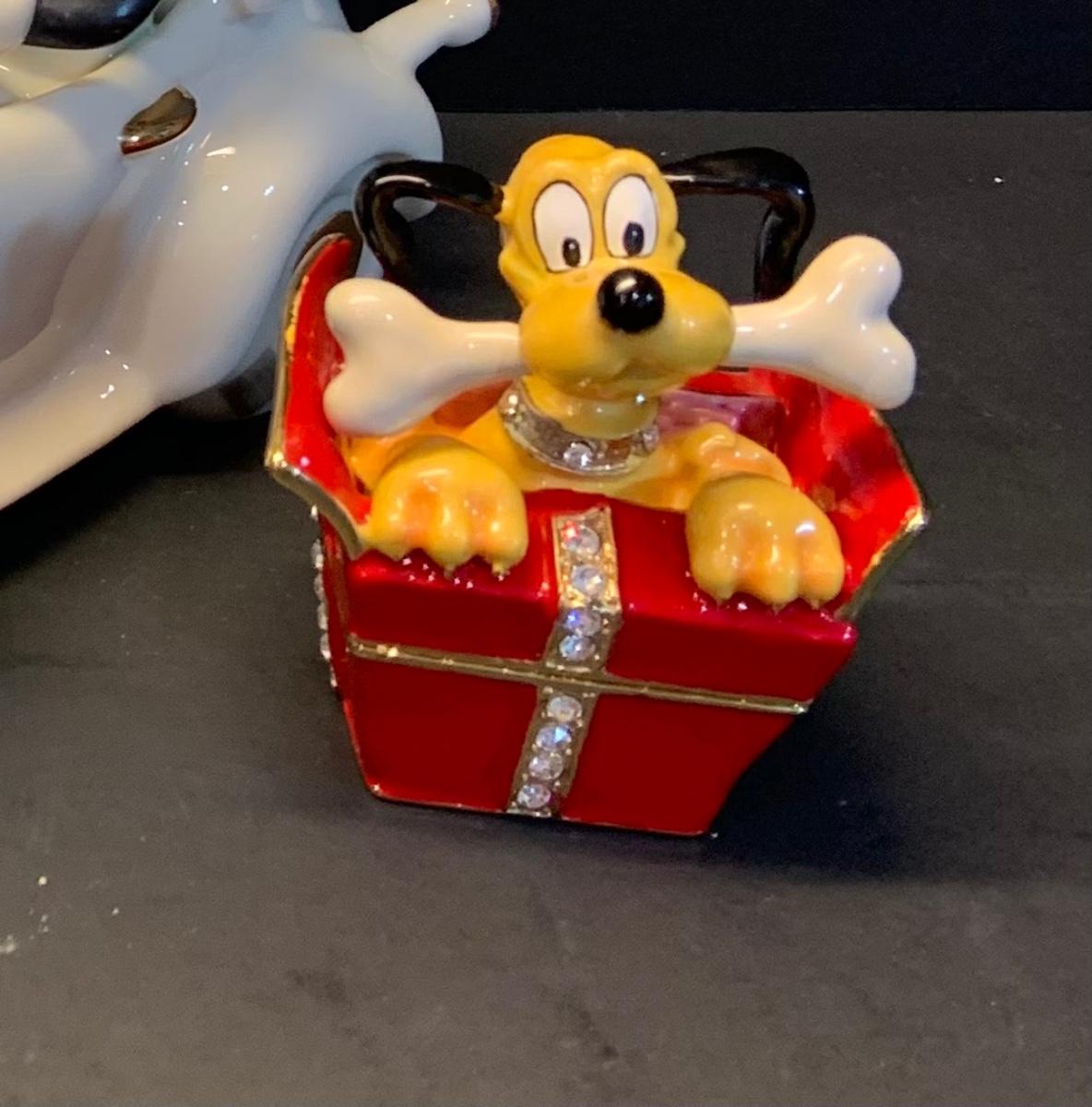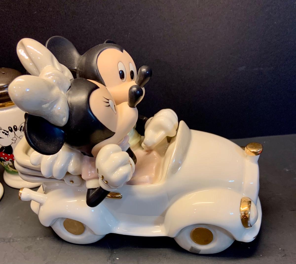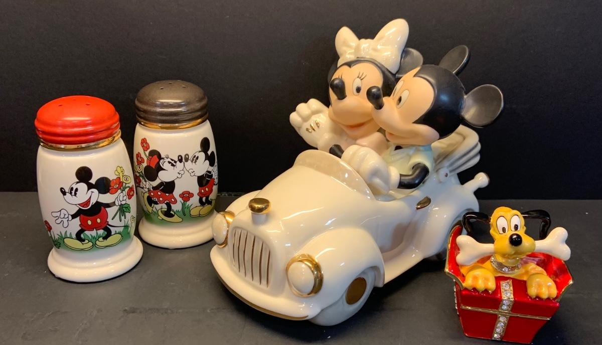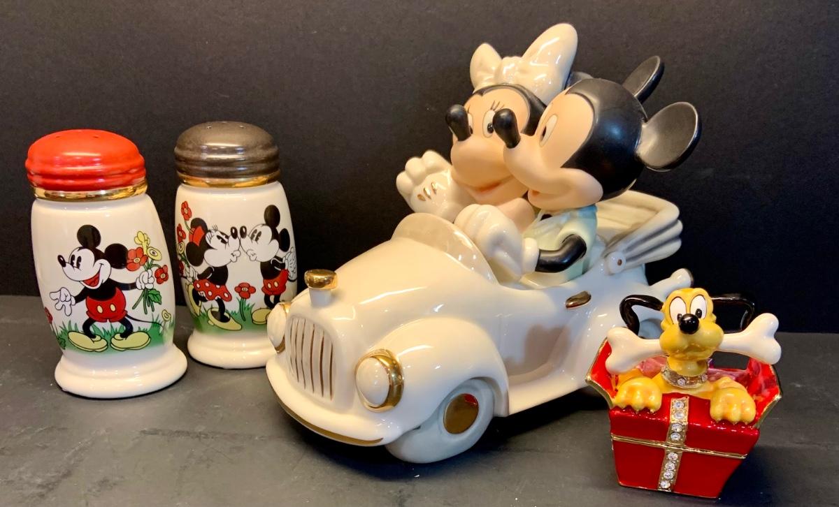 LOT:47G: Lenox - Disney Showcase Mickey's Moonlight Drive Figure, Lenox Mickey and Minnie Salt & Pepper Shakers and a Pluto Enamel Trinket Box