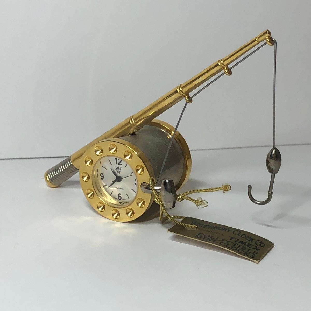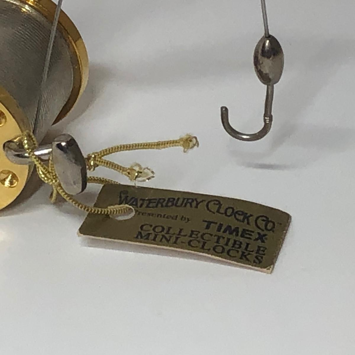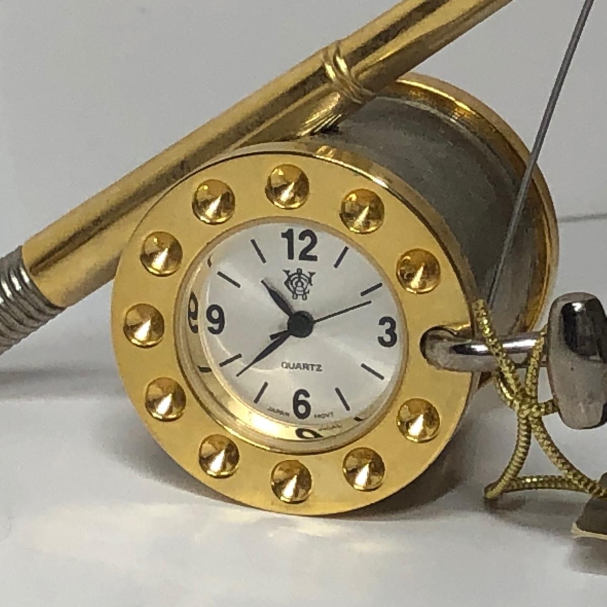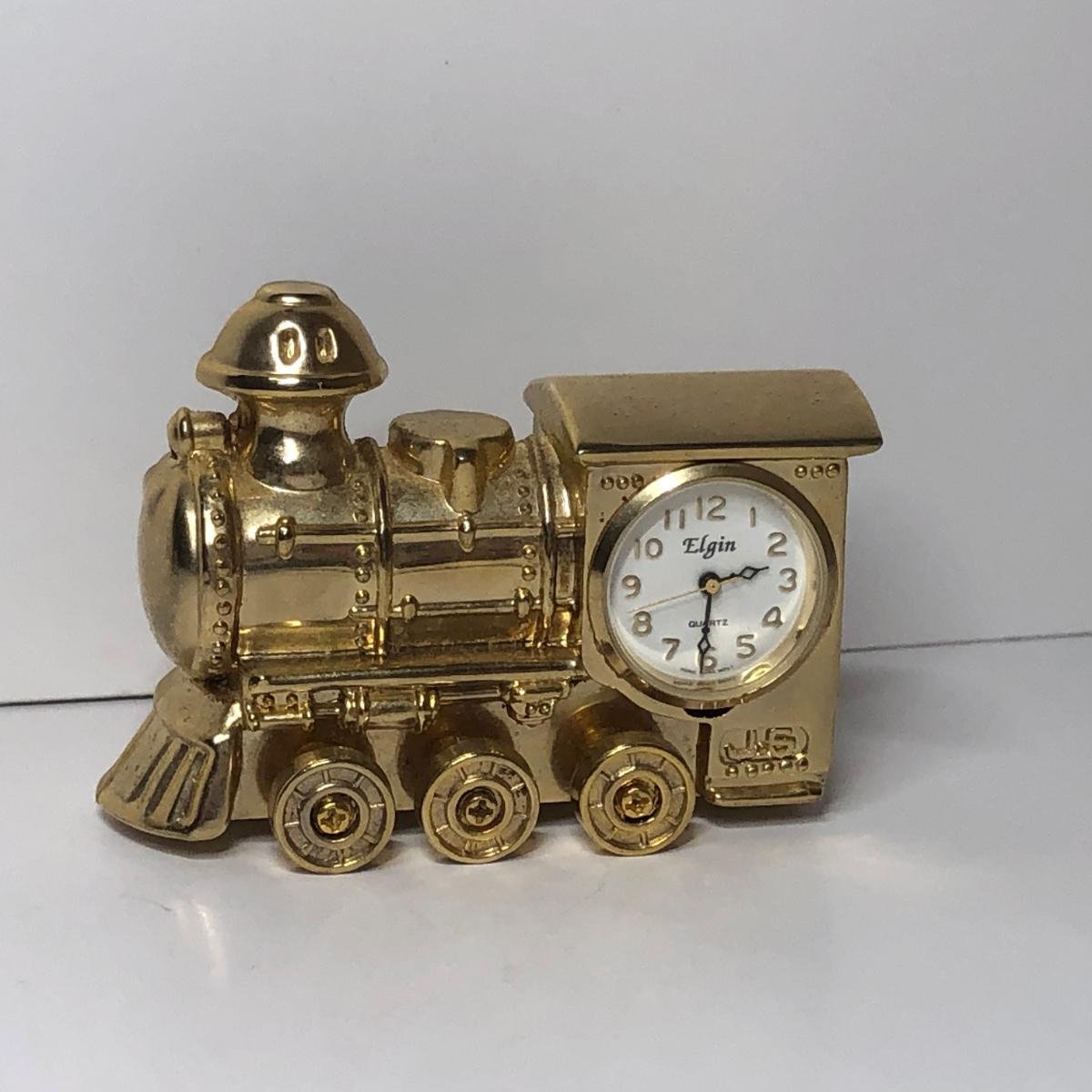 Five gold tone miniature clocks including a fishing pole, turtle, watering can, train and dome clock.