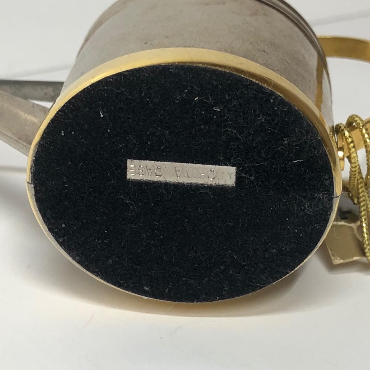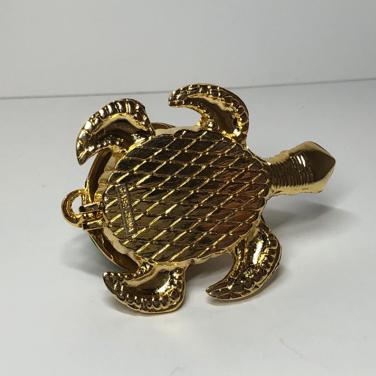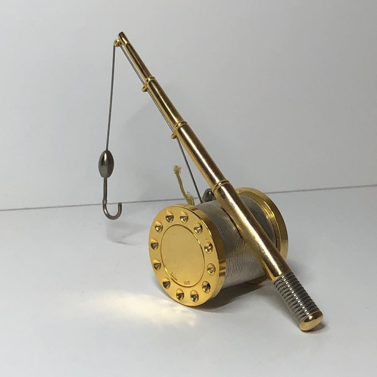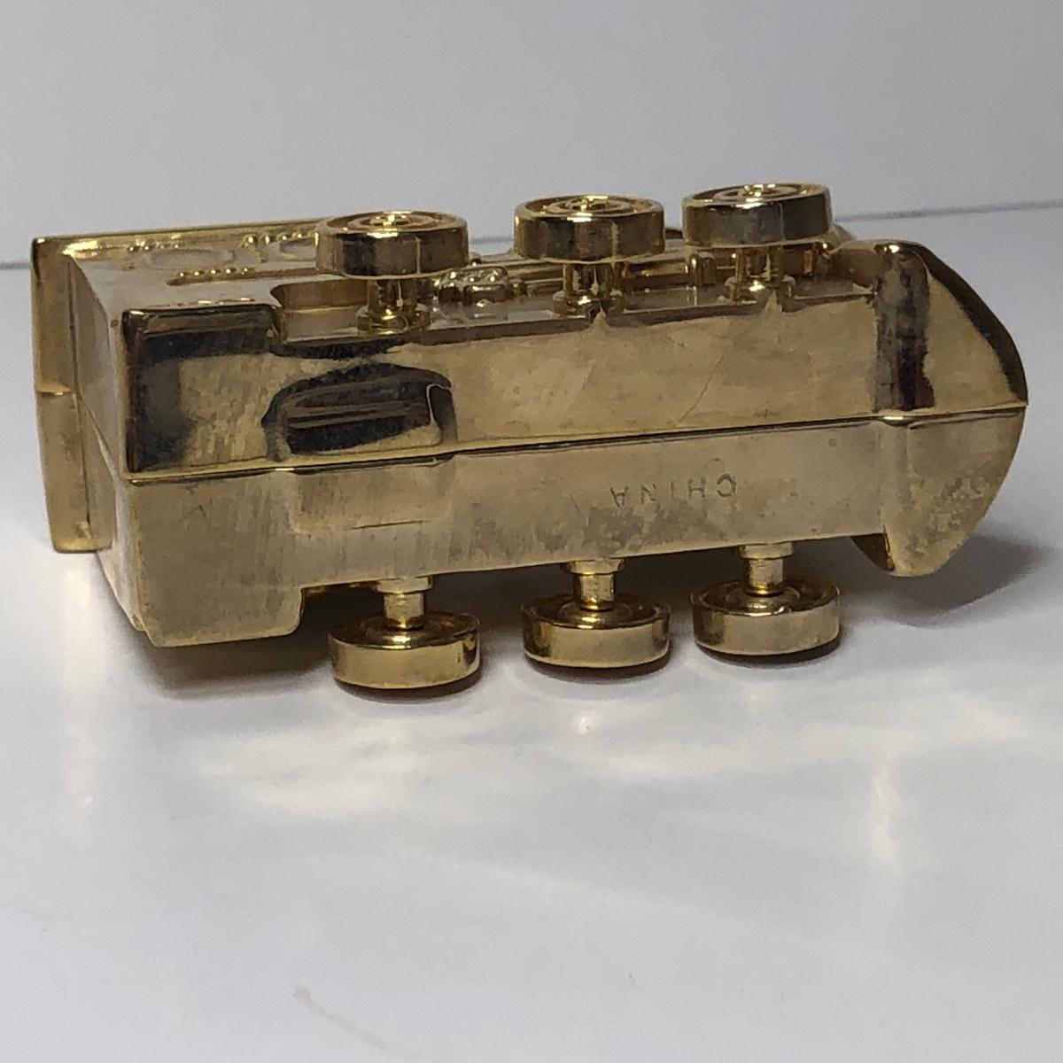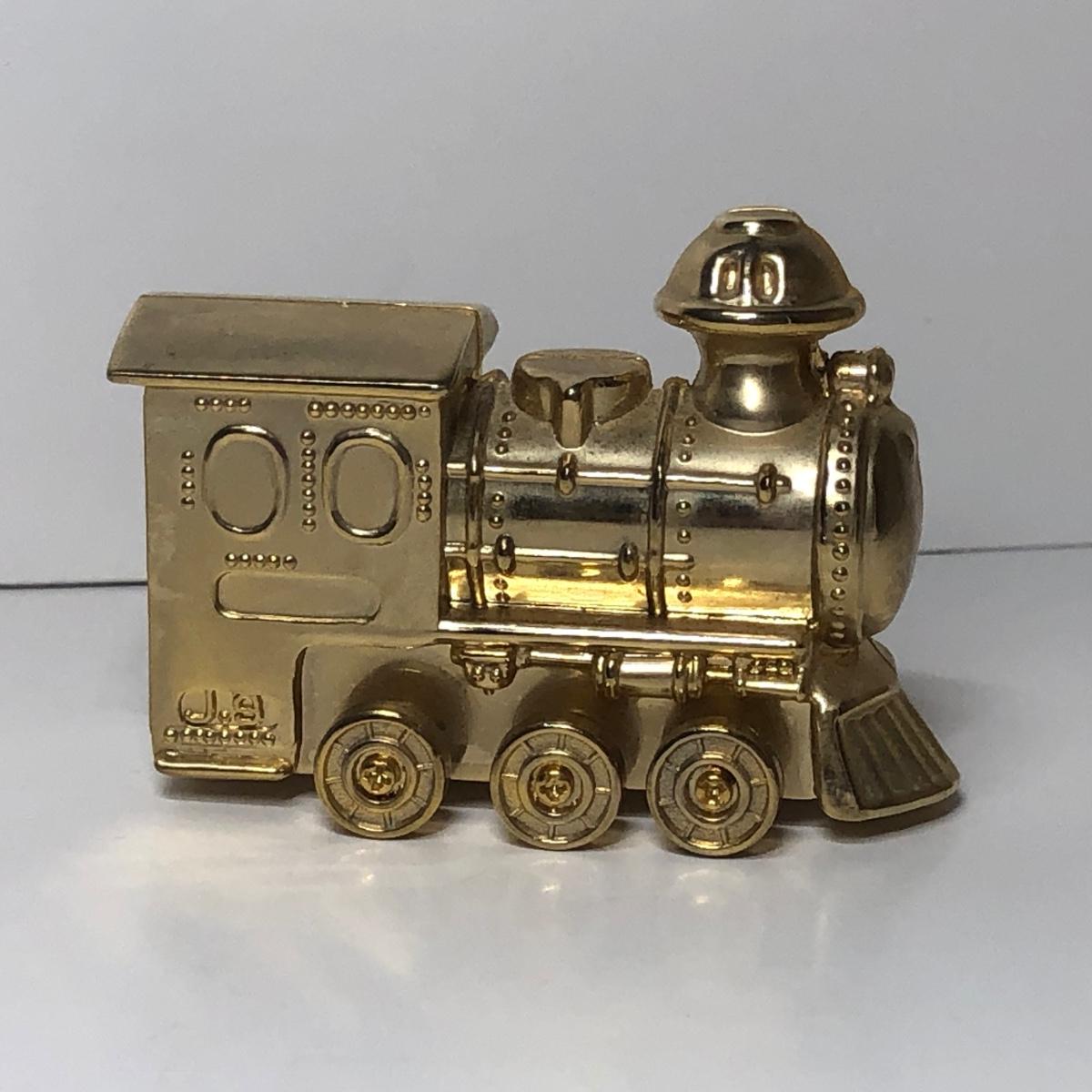 Five gold tone miniature clocks including a fishing pole, turtle, watering can, train and dome clock.