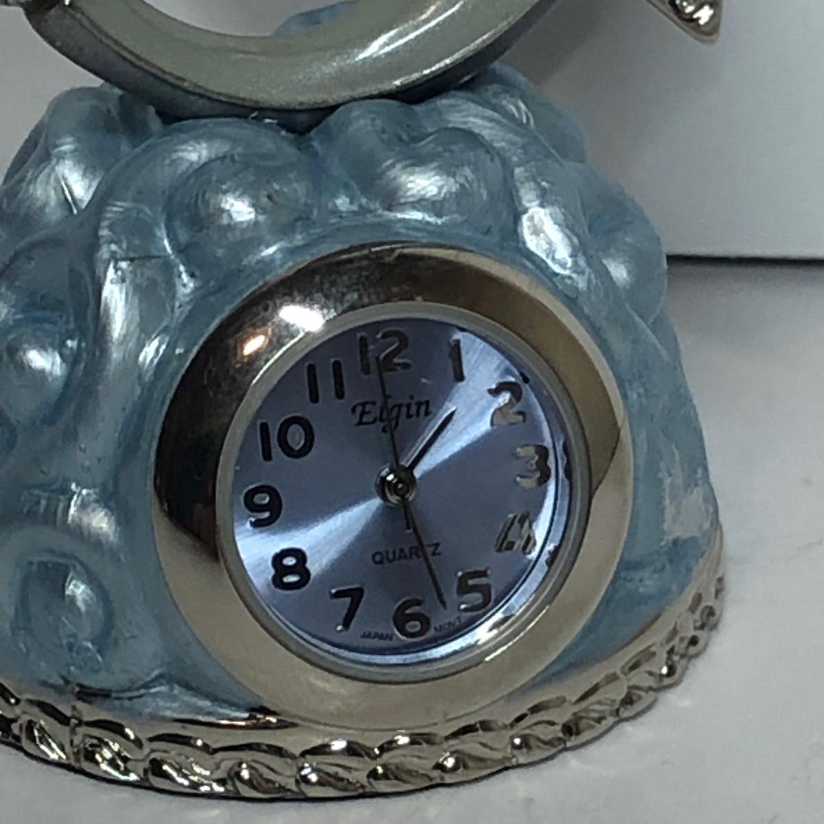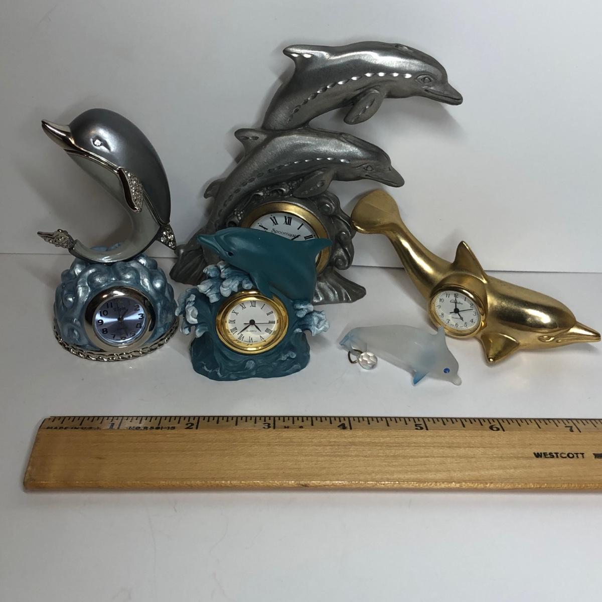 Four miniature clocks and a glass dolphin. One clock is made of pewter.