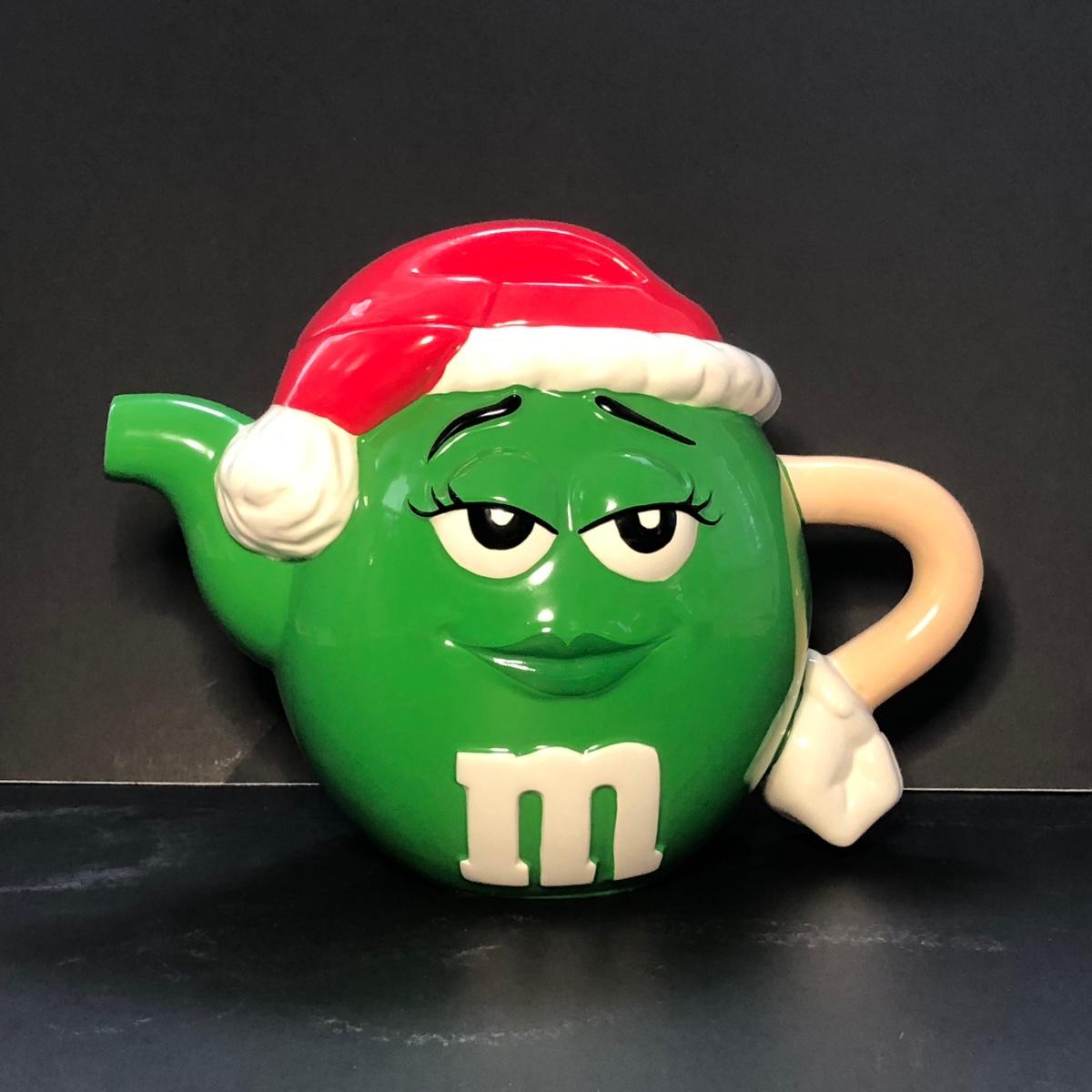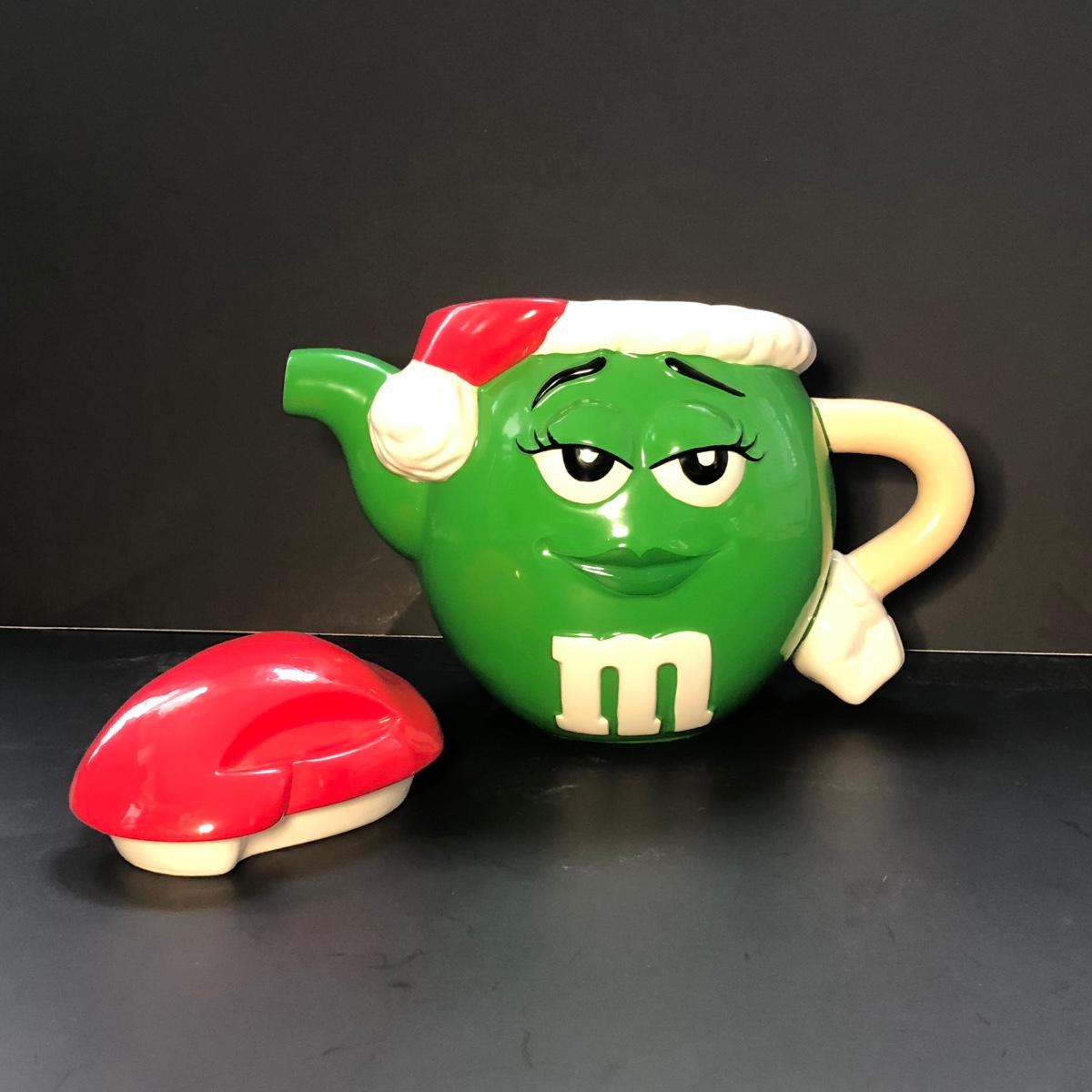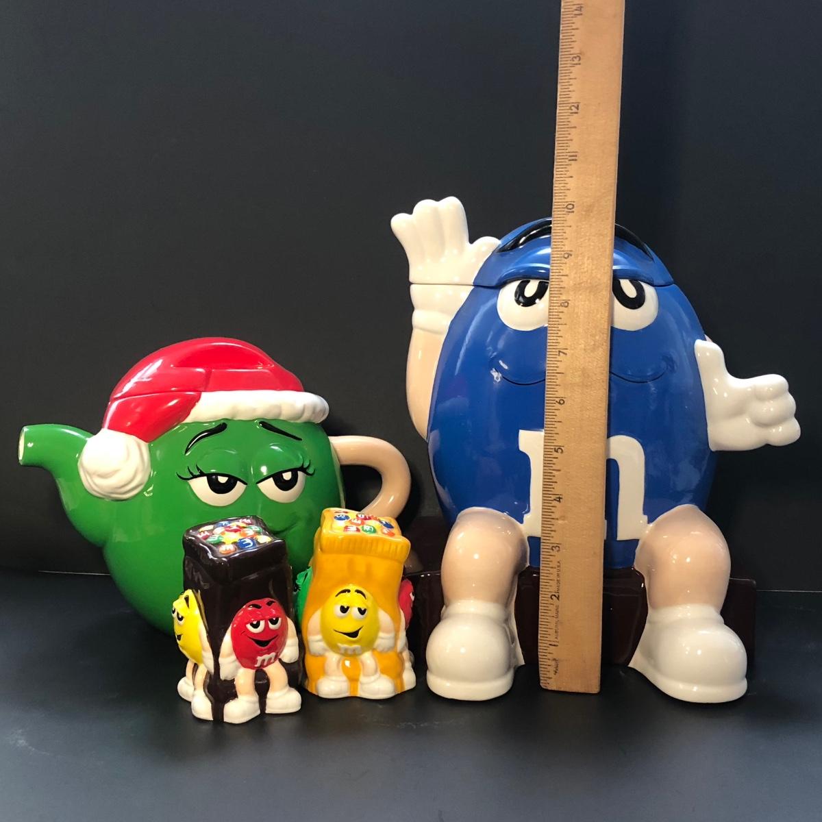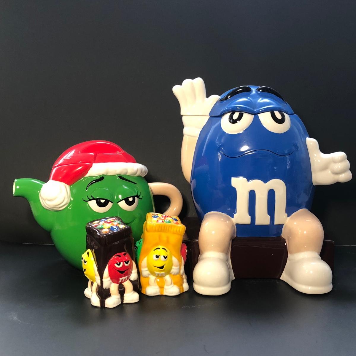 Includes a tea pot of the green M&M with a Santa hat, a cookie jar of the blue M&M, and a pair of S&P with the yellow and red M&M's on them.