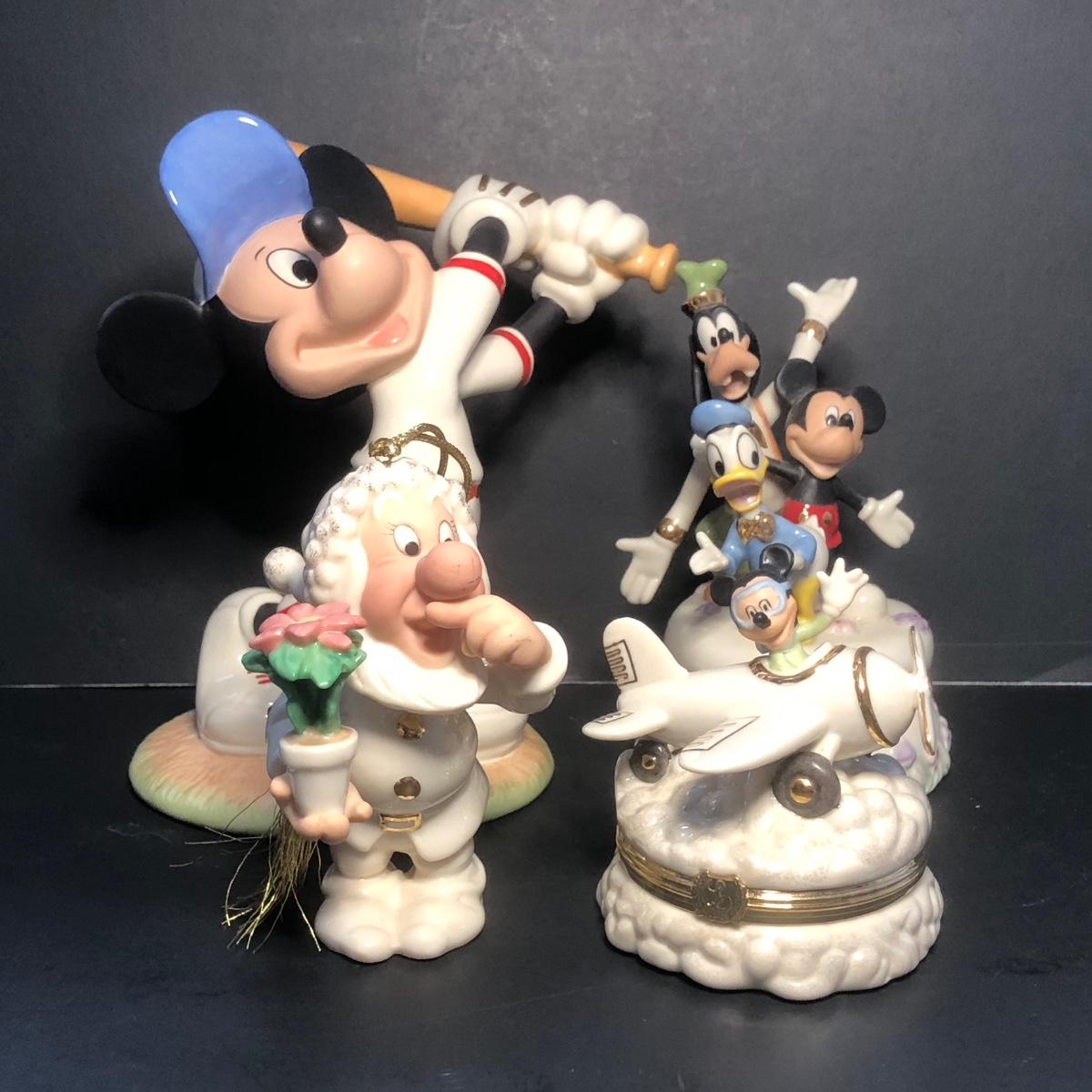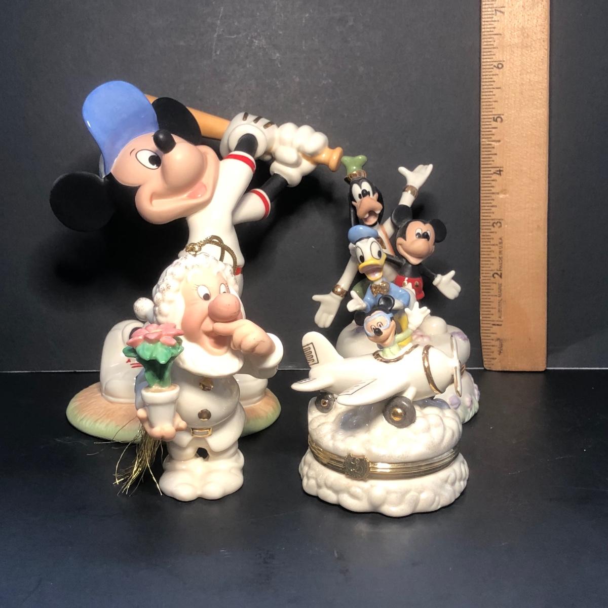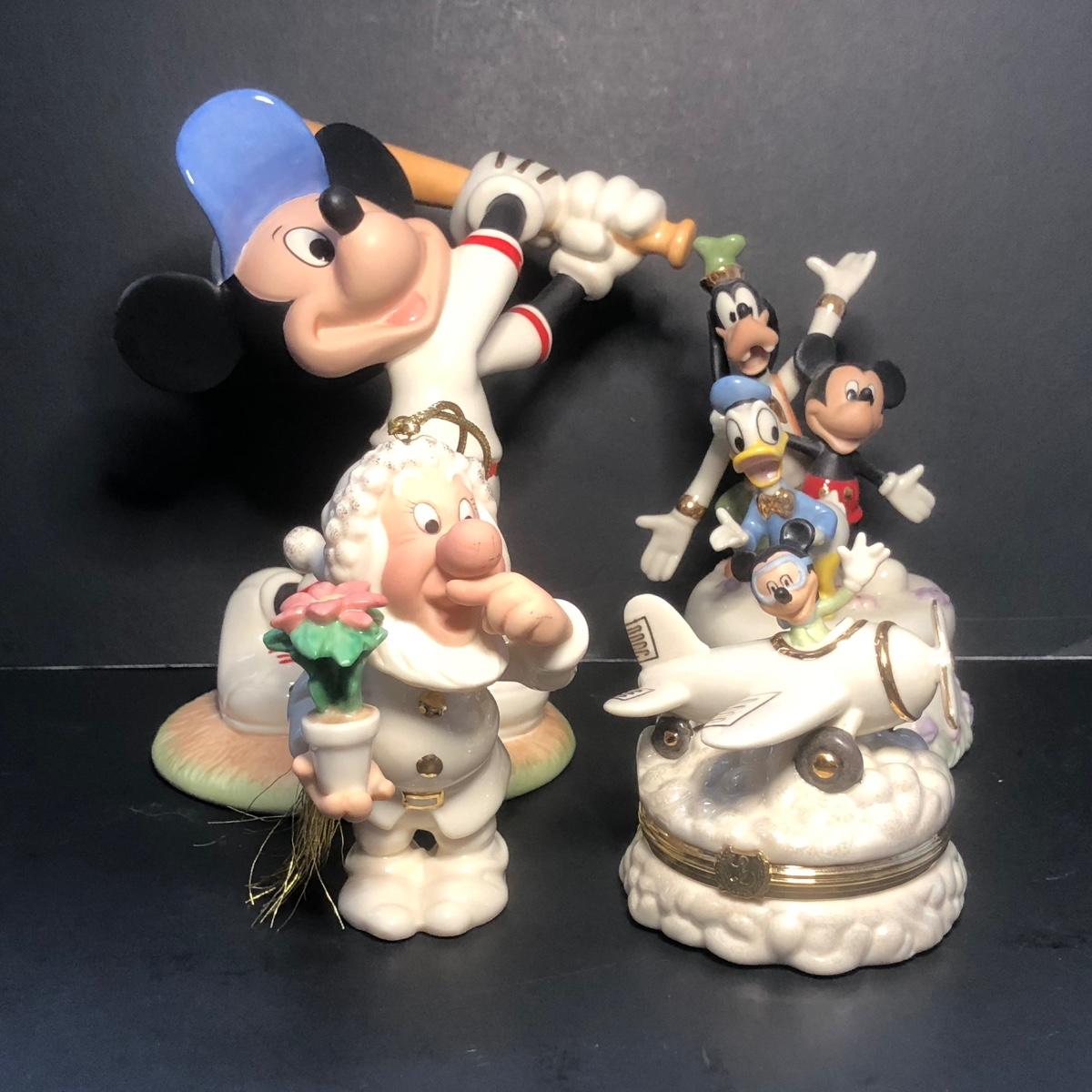 LOT 68M: Lenox Walt Disney - "Mickey Up at Bat," "Mickey & Friends Stamp Treasure Box," "Flying High Treasure Box," & Showcase Collection Sneezy Ornament