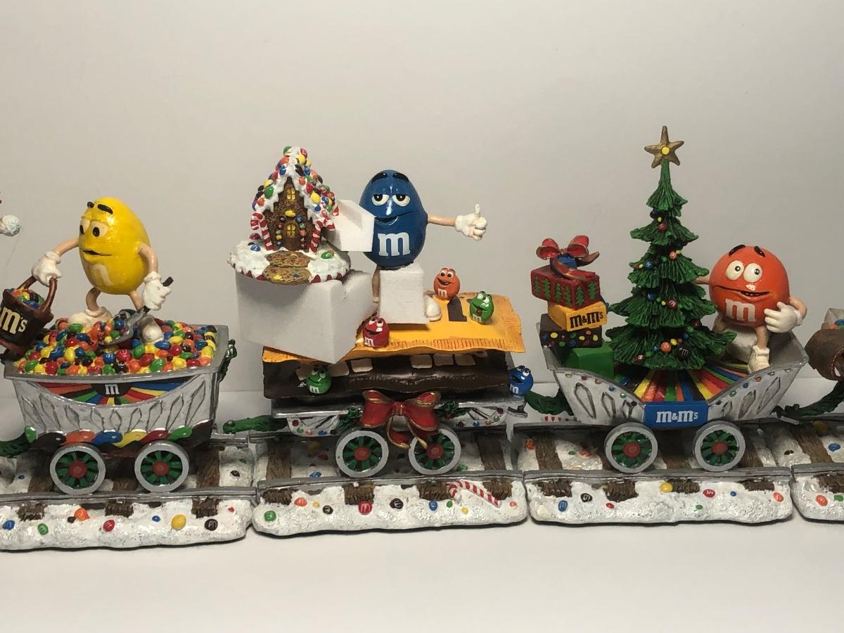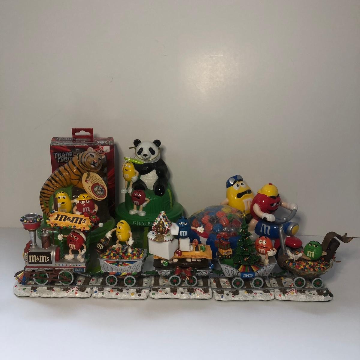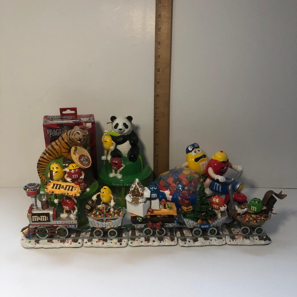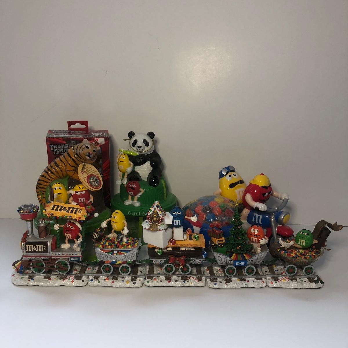 LOT 72M: Danbury Mint M&M's Christmas Train, Motorcycle w/ M&M's in Sidecar, M&M Transformers Ornaments, Tiger & Panda Plastic Containers