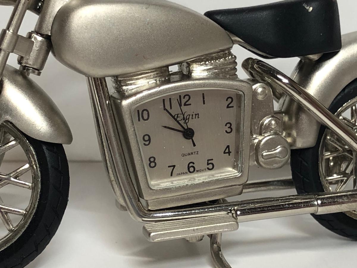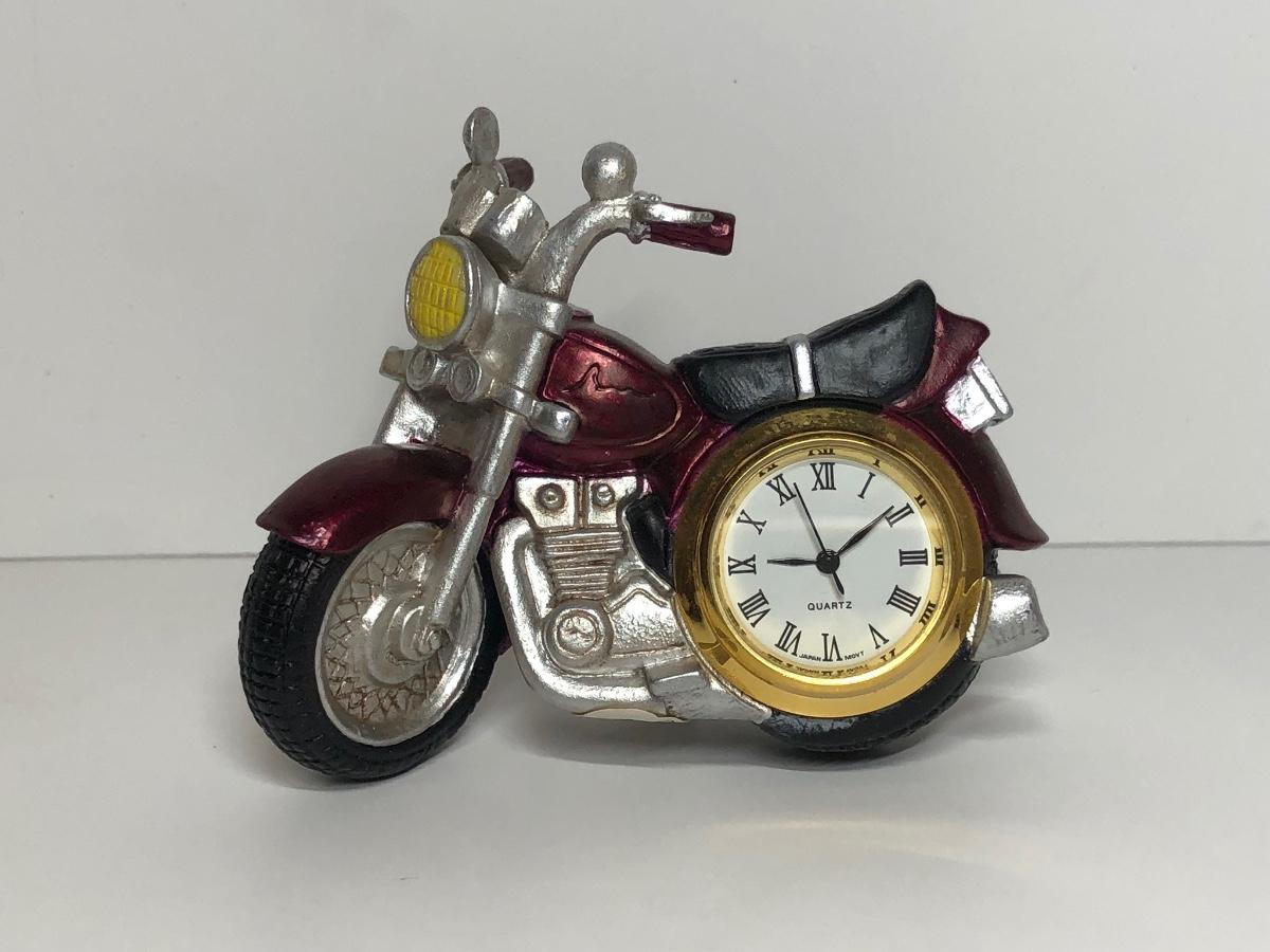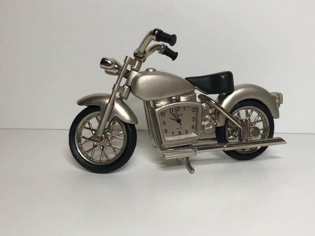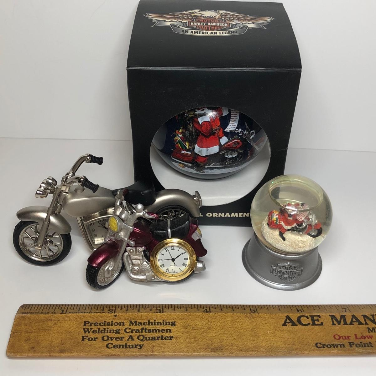 Two miniature motorcycle clocks, a Harley-Davidson water globe and boxed ornament.