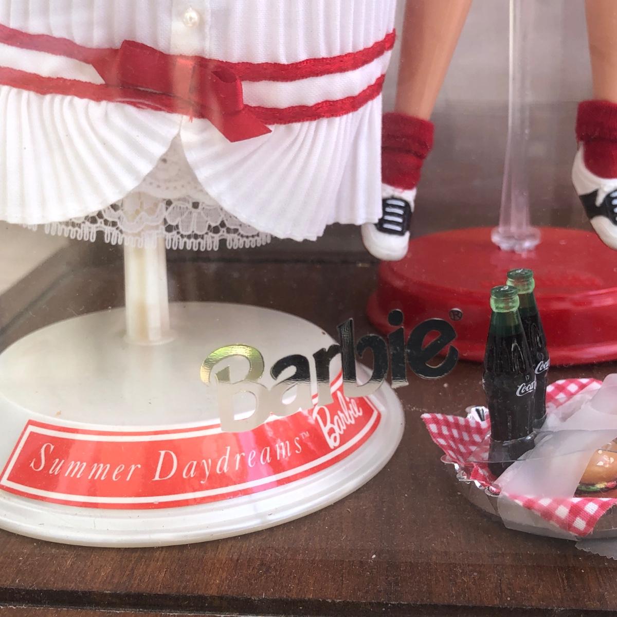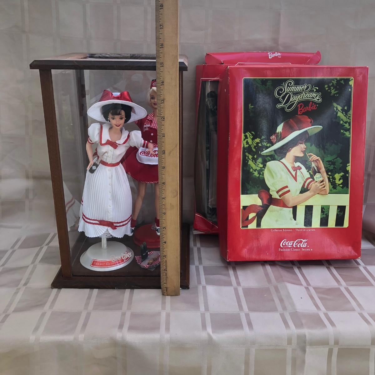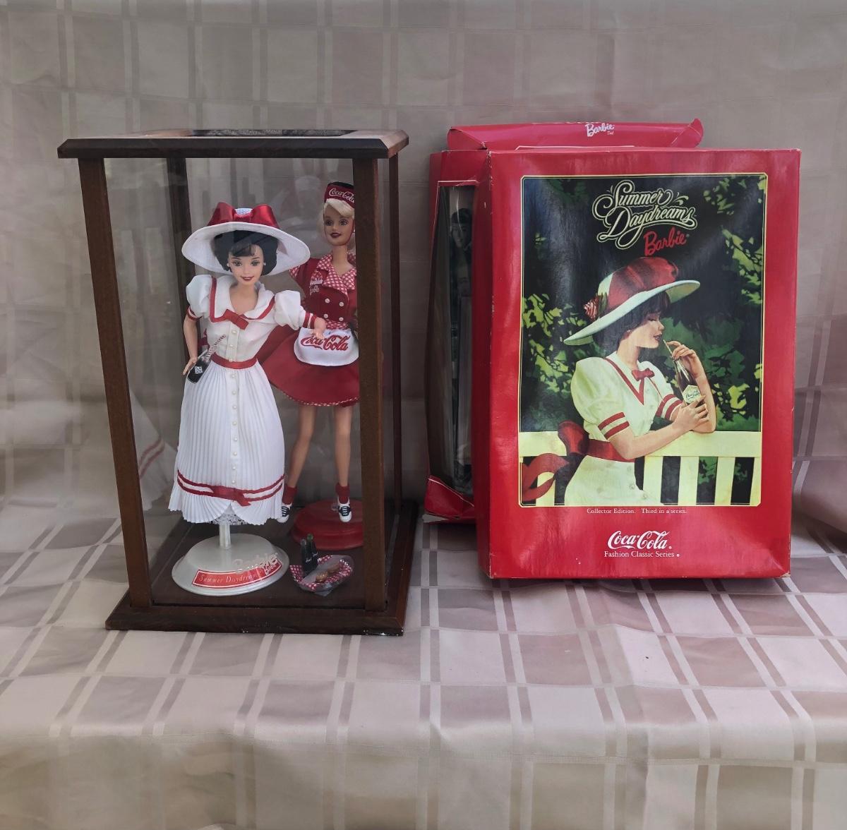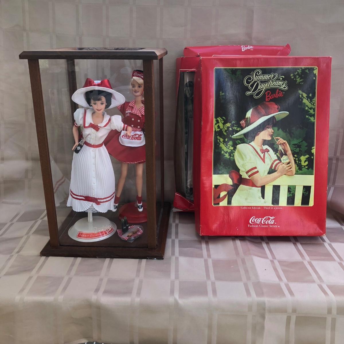 Includes two 11.5 inch dolls, "Barbie" branded display case, accessories, and boxes. Boxes are damaged, see photos. Summer Daydream Barbie has spots on her hat. Accessory tray for Coca-Cola Barbie was taped and does not fit into her ring slot.