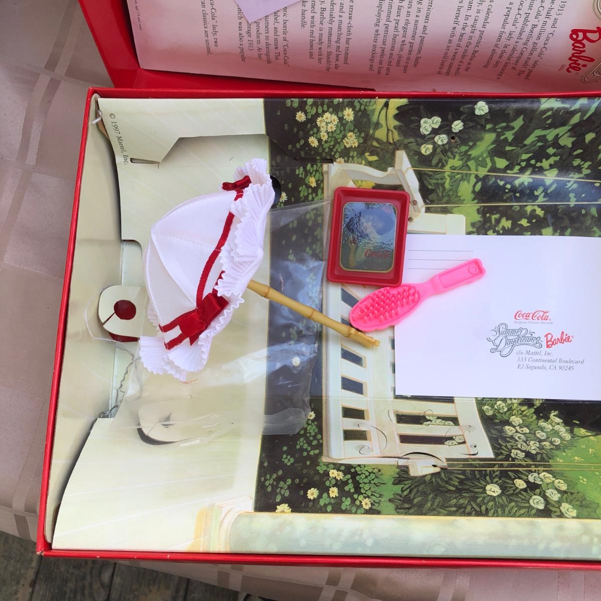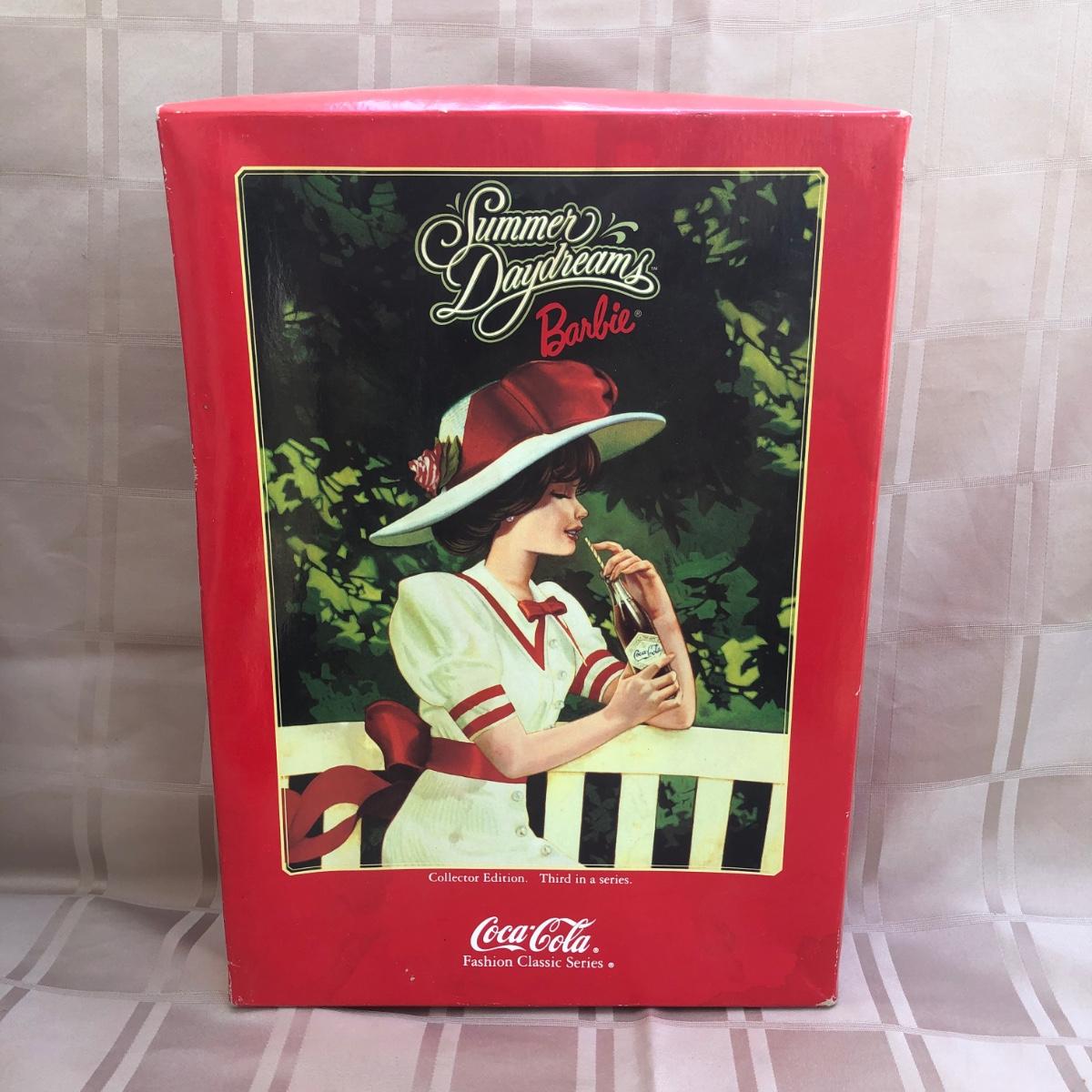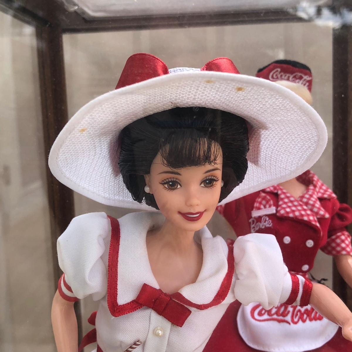 Includes two 11.5 inch dolls, "Barbie" branded display case, accessories, and boxes. Boxes are damaged, see photos. Summer Daydream Barbie has spots on her hat. Accessory tray for Coca-Cola Barbie was taped and does not fit into her ring slot.