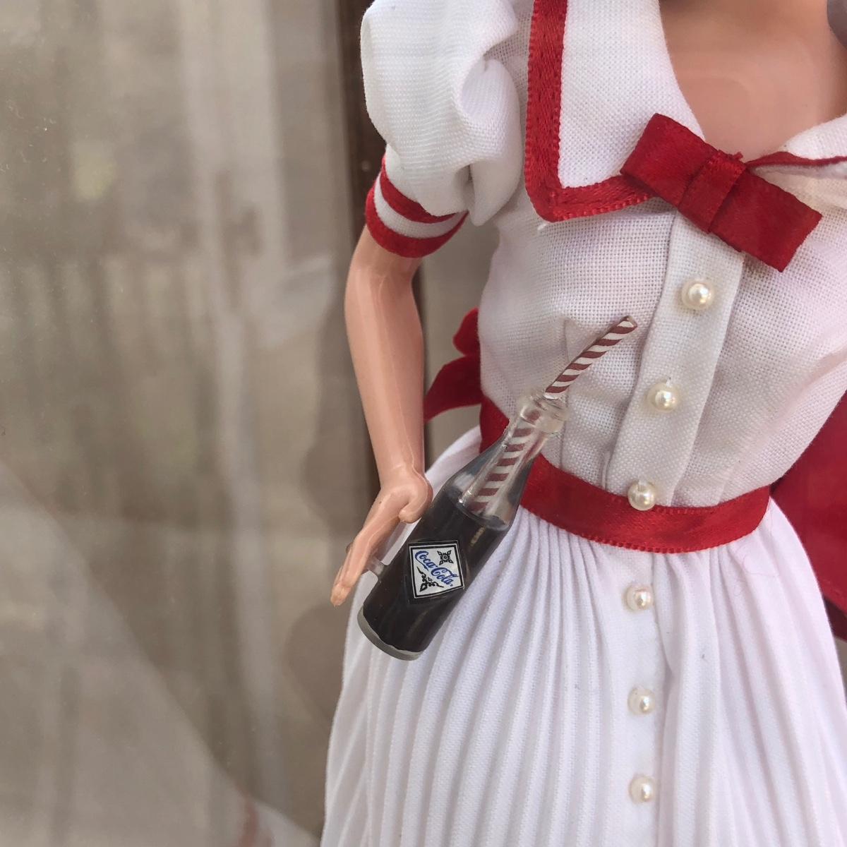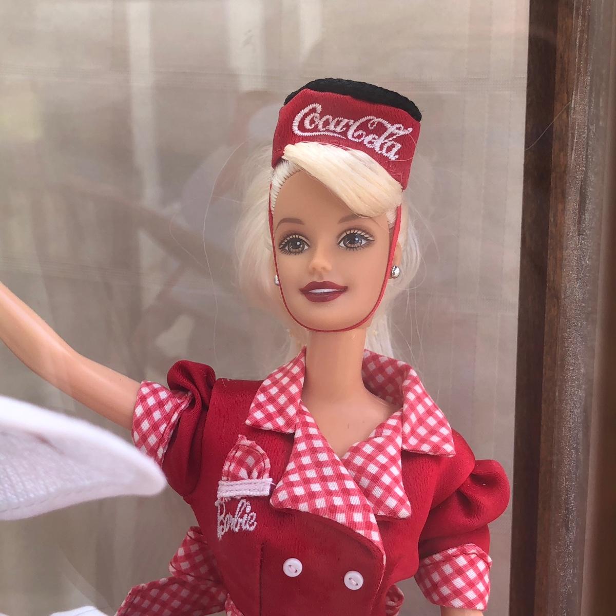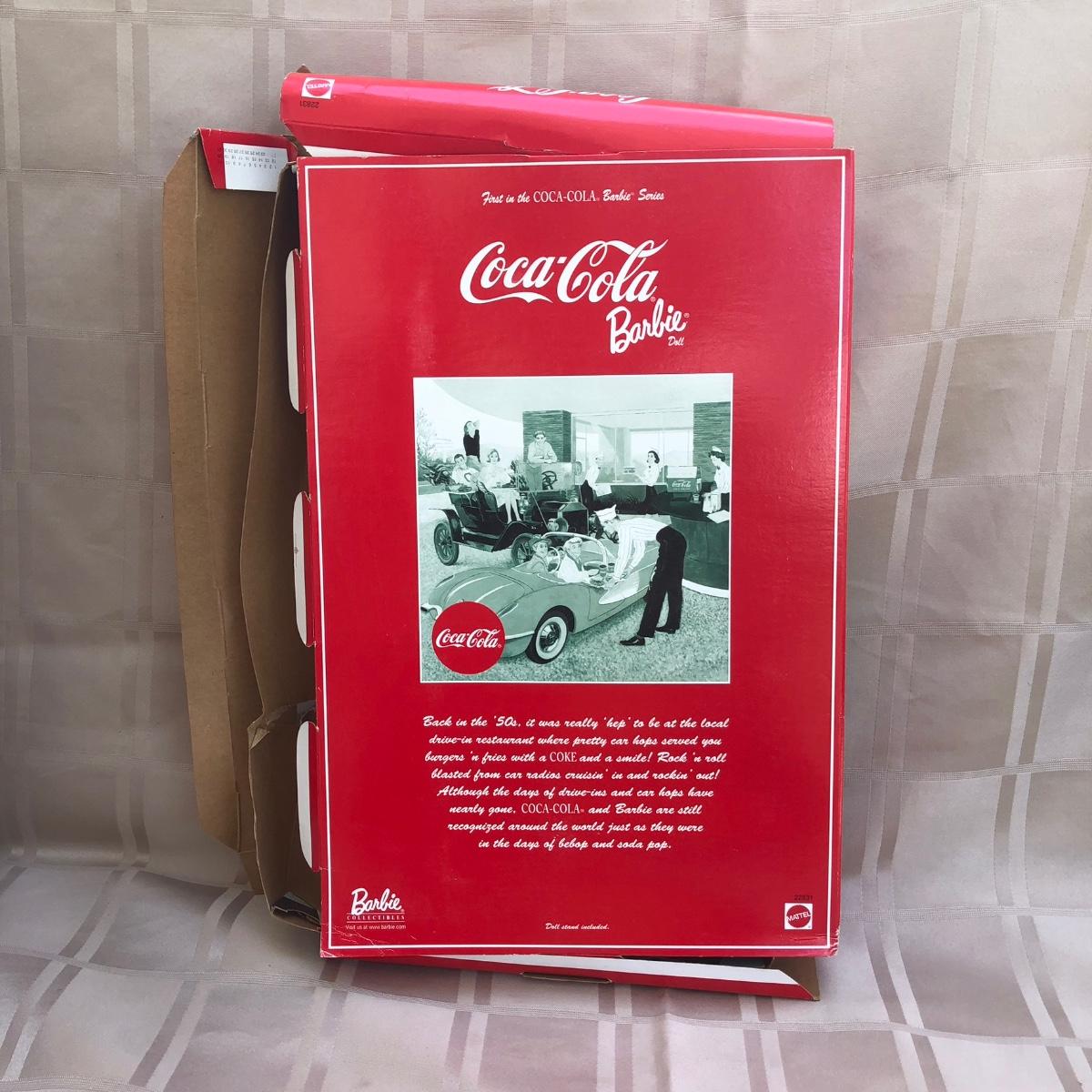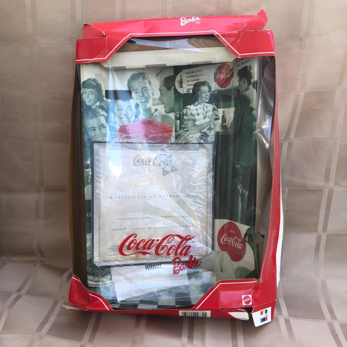 Includes two 11.5 inch dolls, "Barbie" branded display case, accessories, and boxes. Boxes are damaged, see photos. Summer Daydream Barbie has spots on her hat. Accessory tray for Coca-Cola Barbie was taped and does not fit into her ring slot.