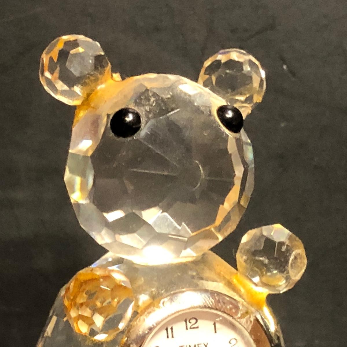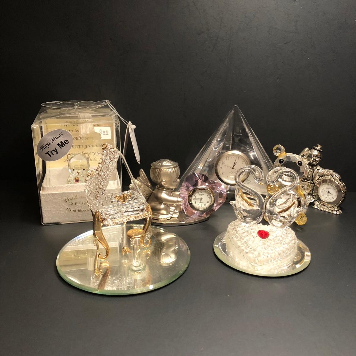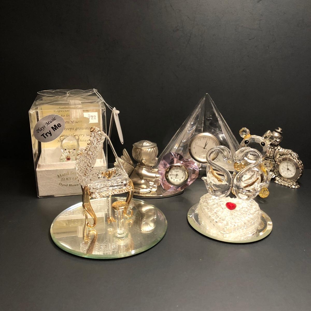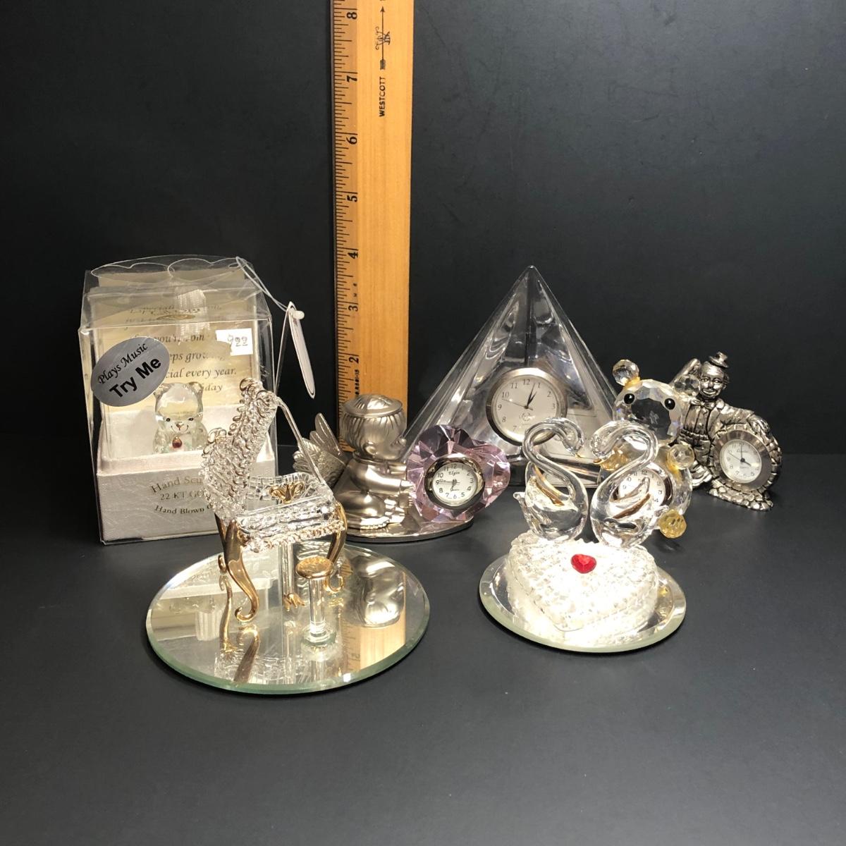 Includes small clocks made with crystal and a silver tone clown clock.