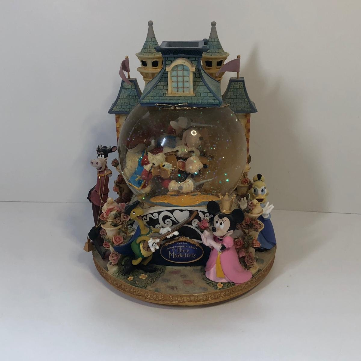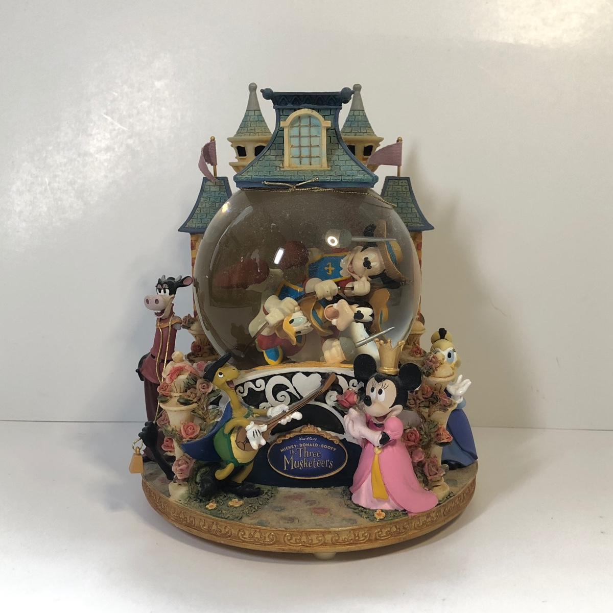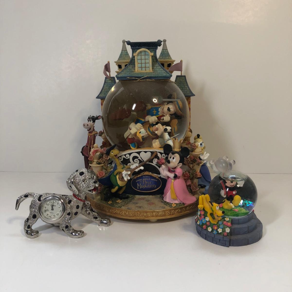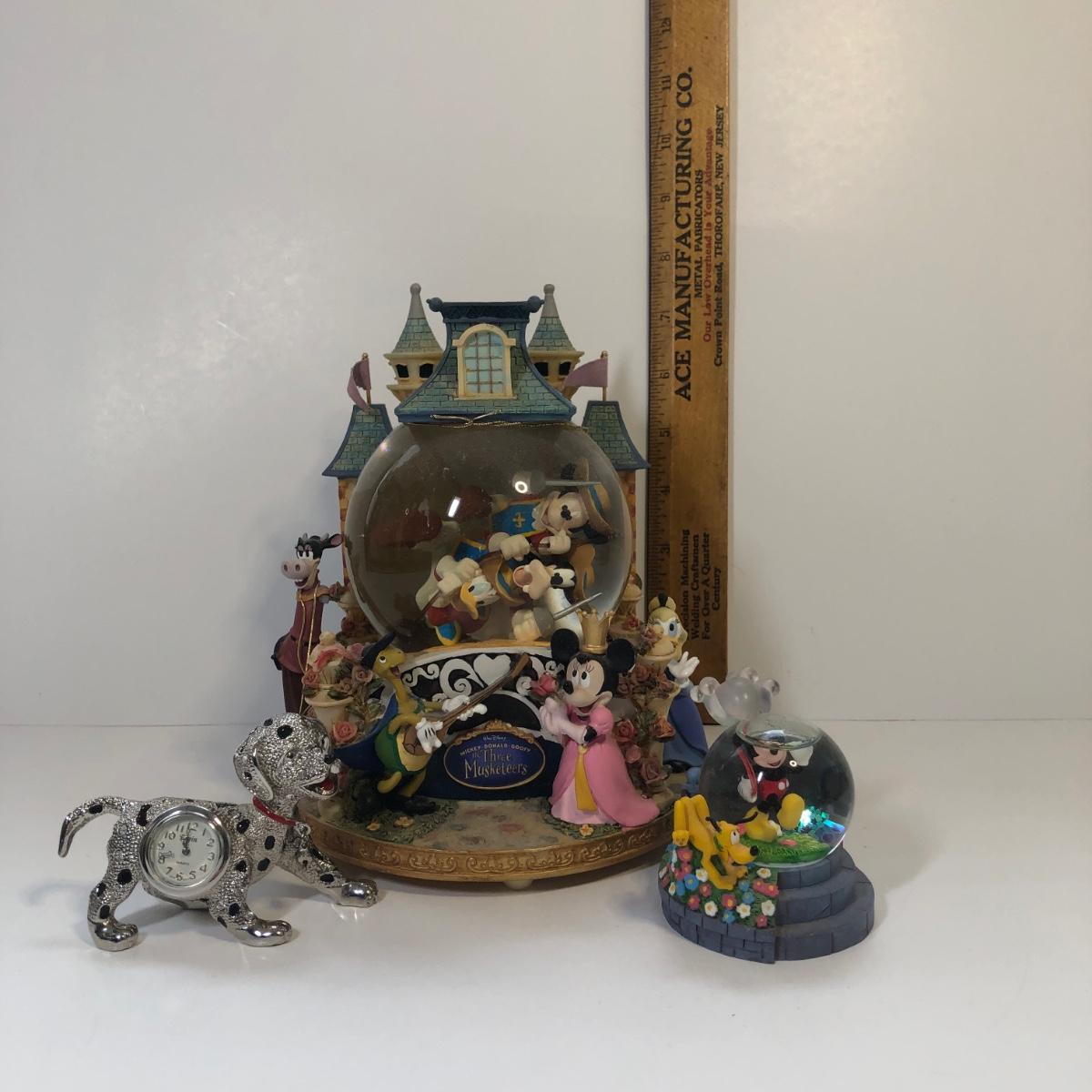 LOT 127M: Three Mousketeers Water Globe/Music Box, Mickey & Pluto Water Globe, Elgin Dalmatian Miniature Clock