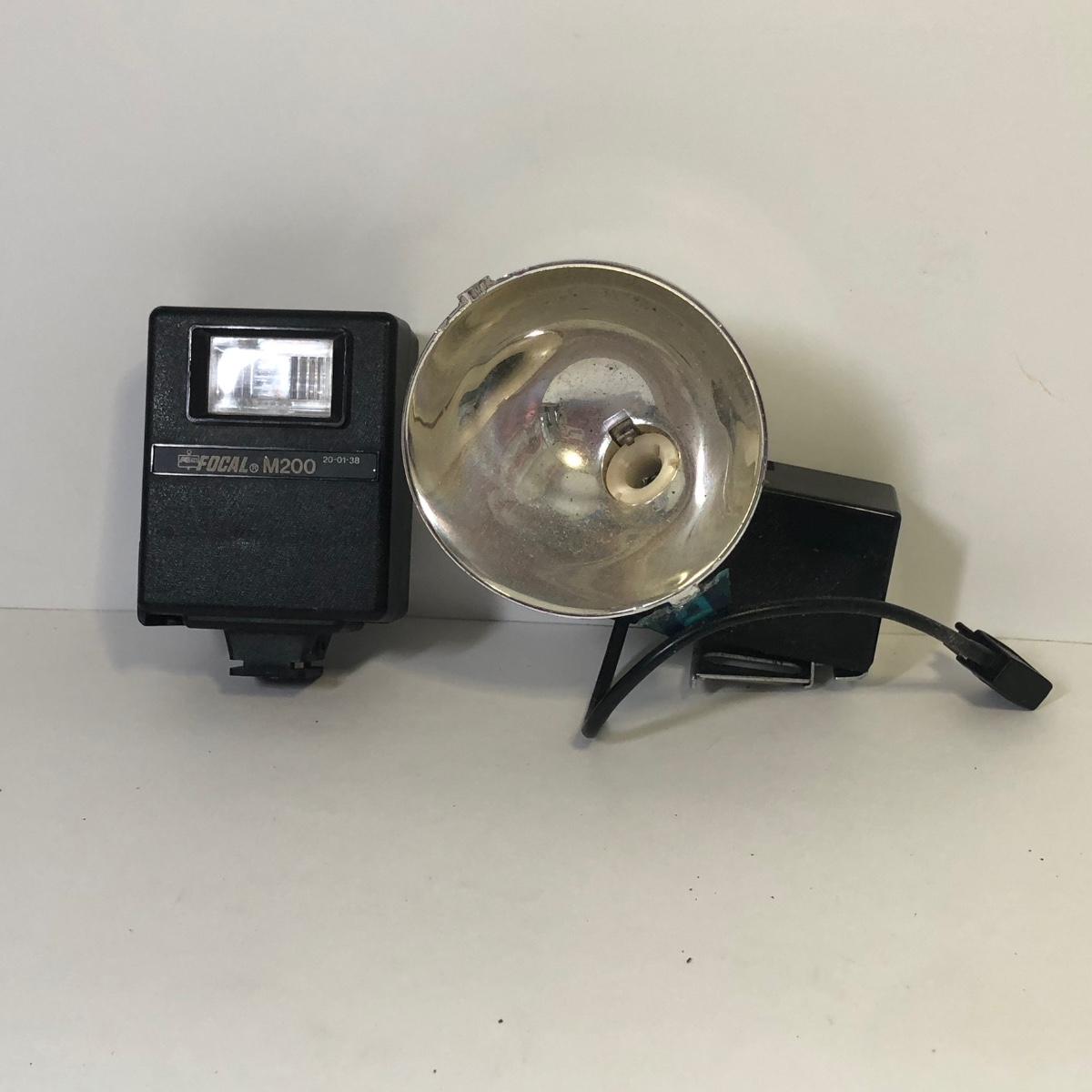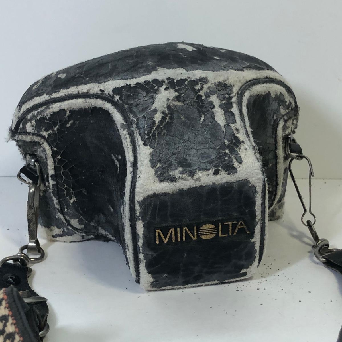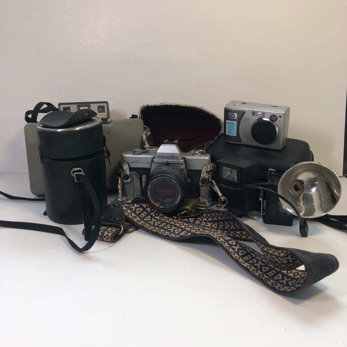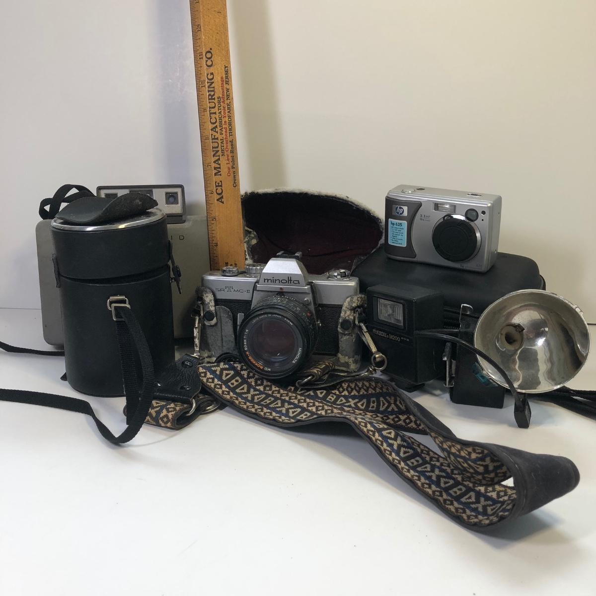 Also includes Polaroid flash and 35mm external flash, along with a camera case and small digital HP camera. Minolta case is crumbling on the outside. Cameras are untested.