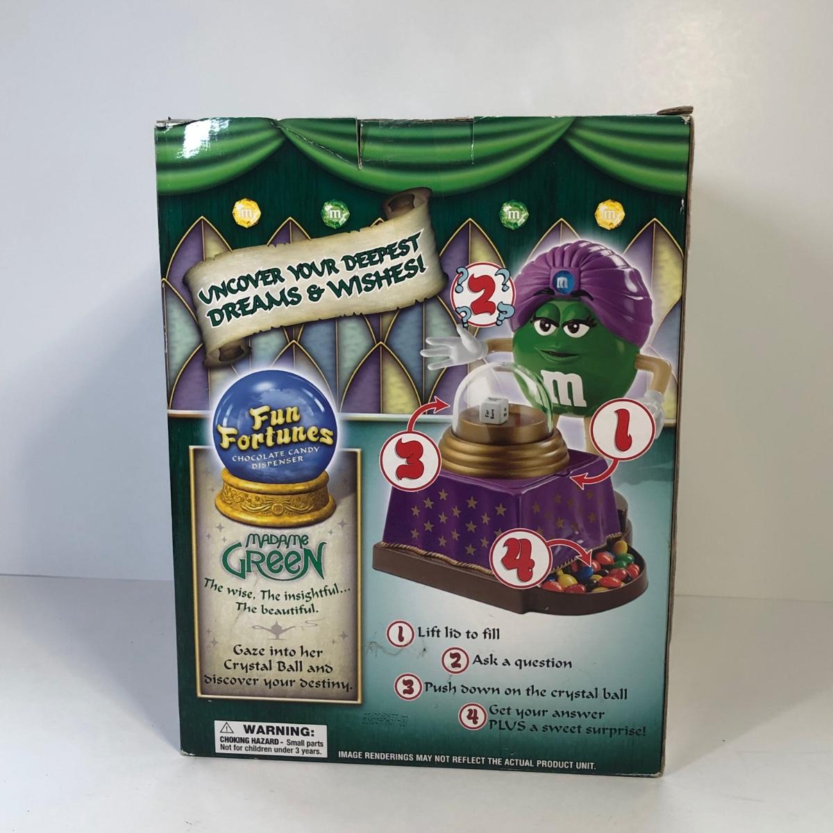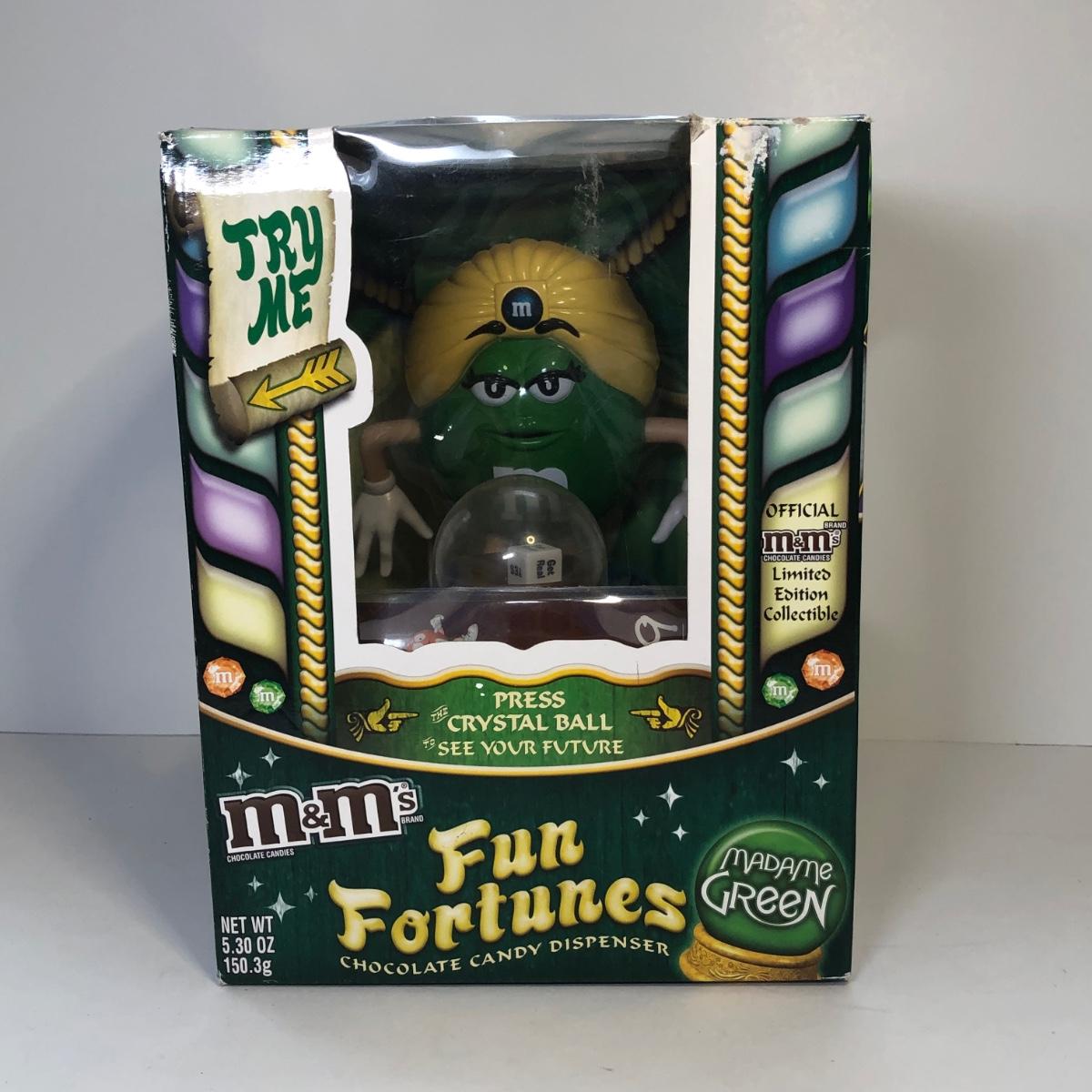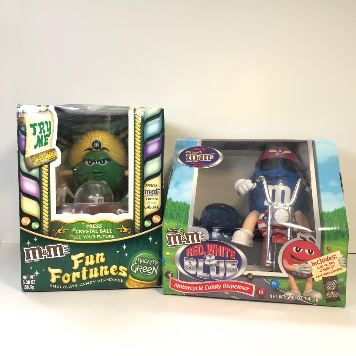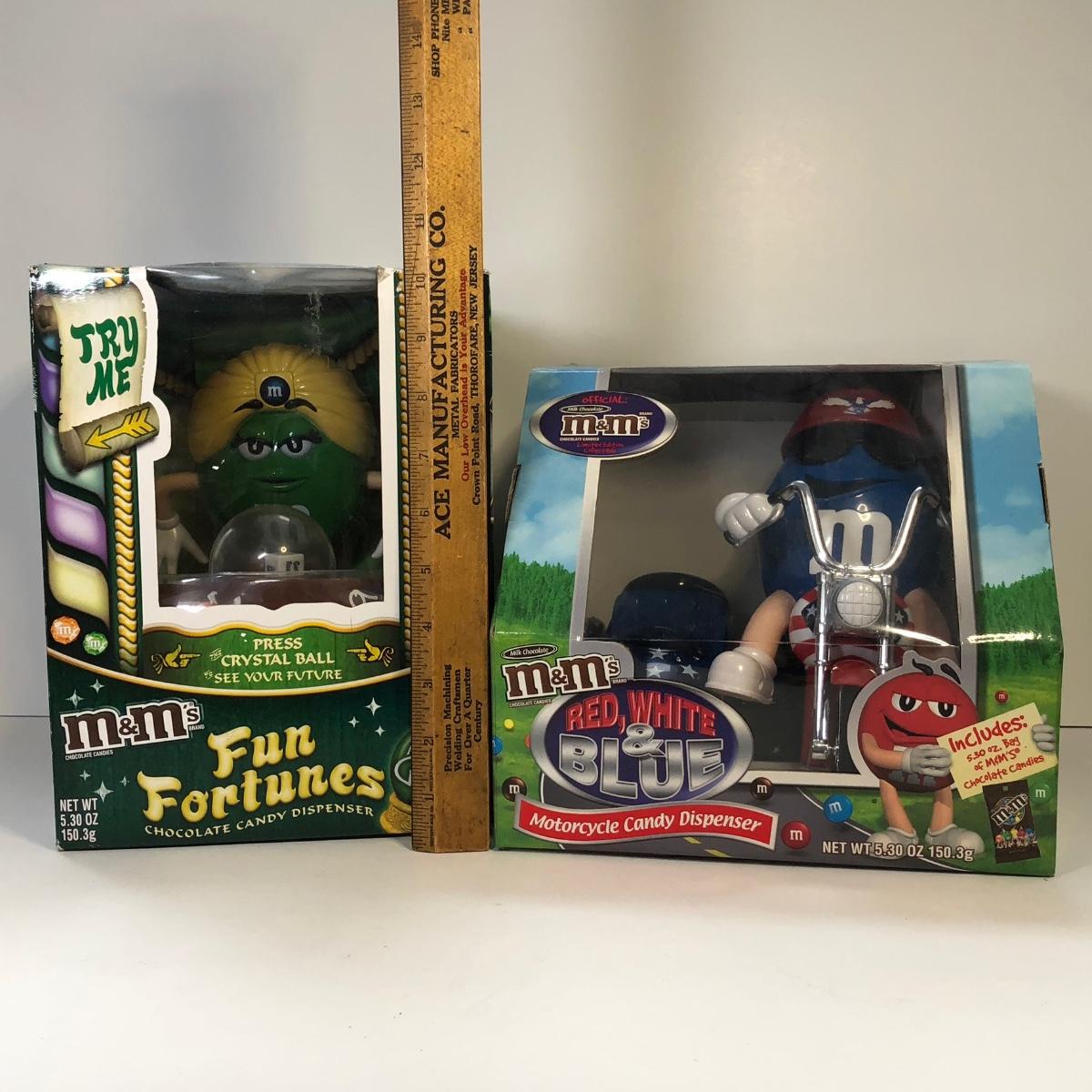 LOT 131M: M&M's Fun Fortunes Madame Green Chocolate Candy Dispenser & Red White & Blue Motorcycle Candy Dispenser NRFB