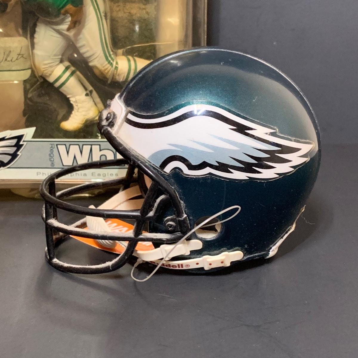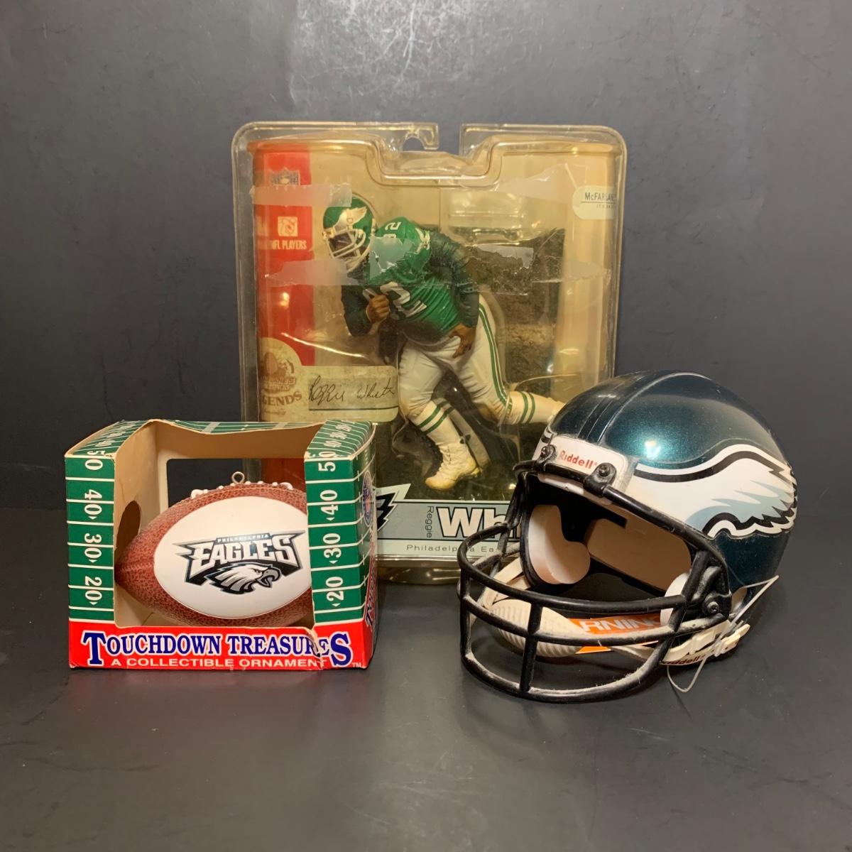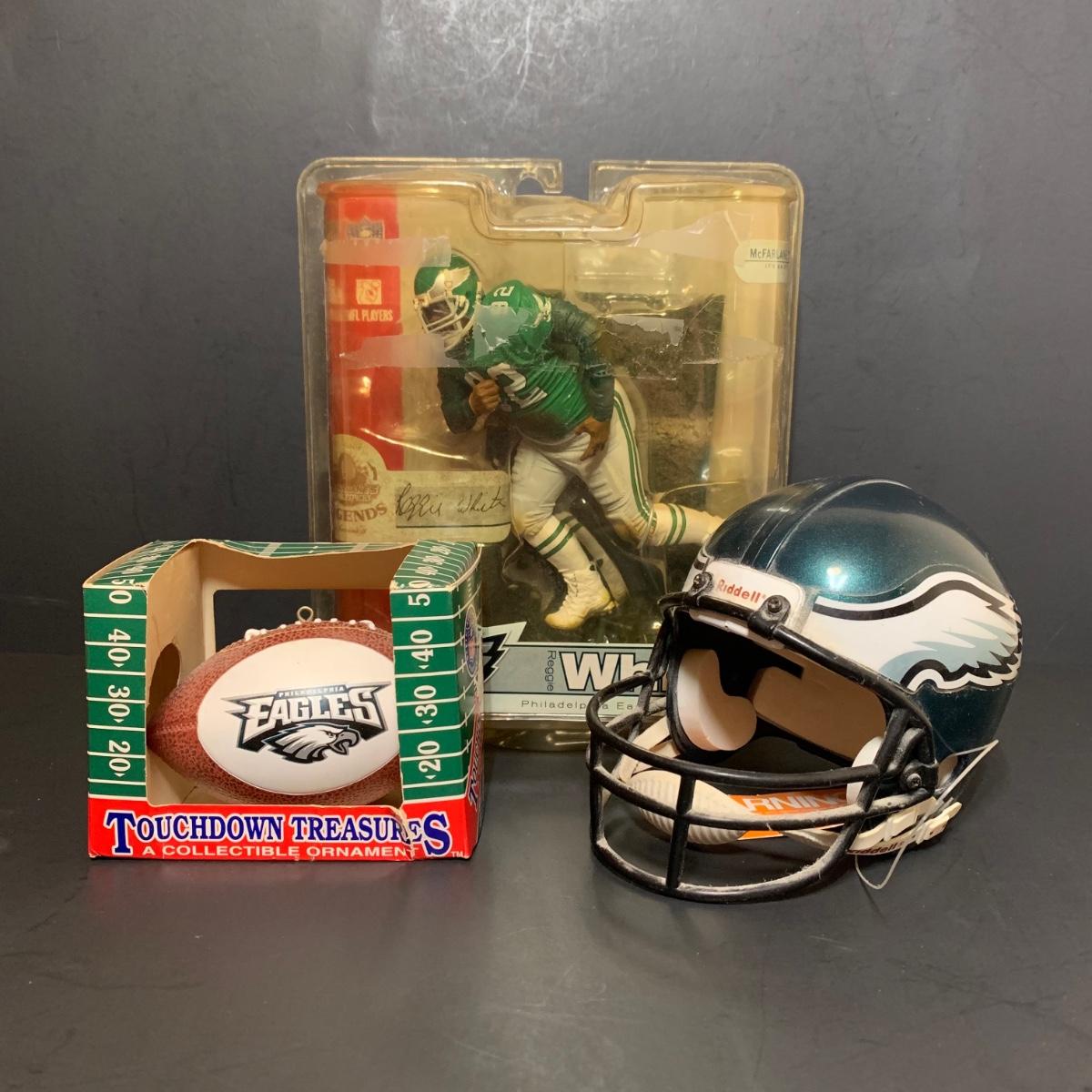 LOT 138: Philadelphia Eagles Collection Including McFarland Reggie White Action Figure, Riddell 2 7/8 Helmet and Football Ornament
