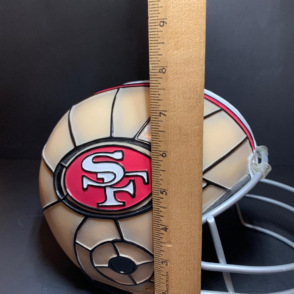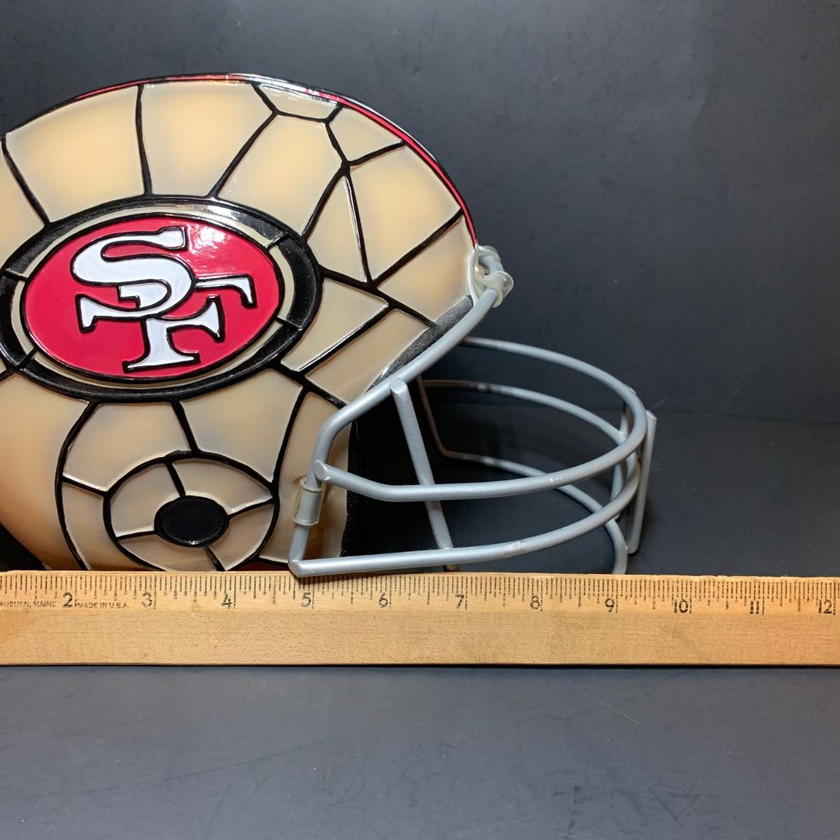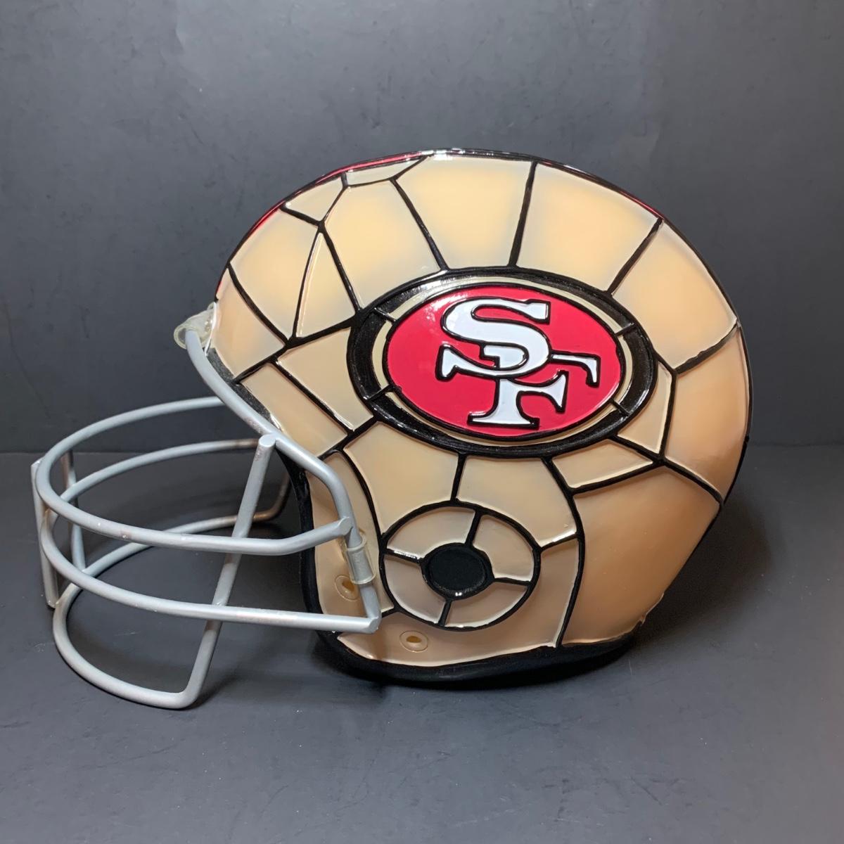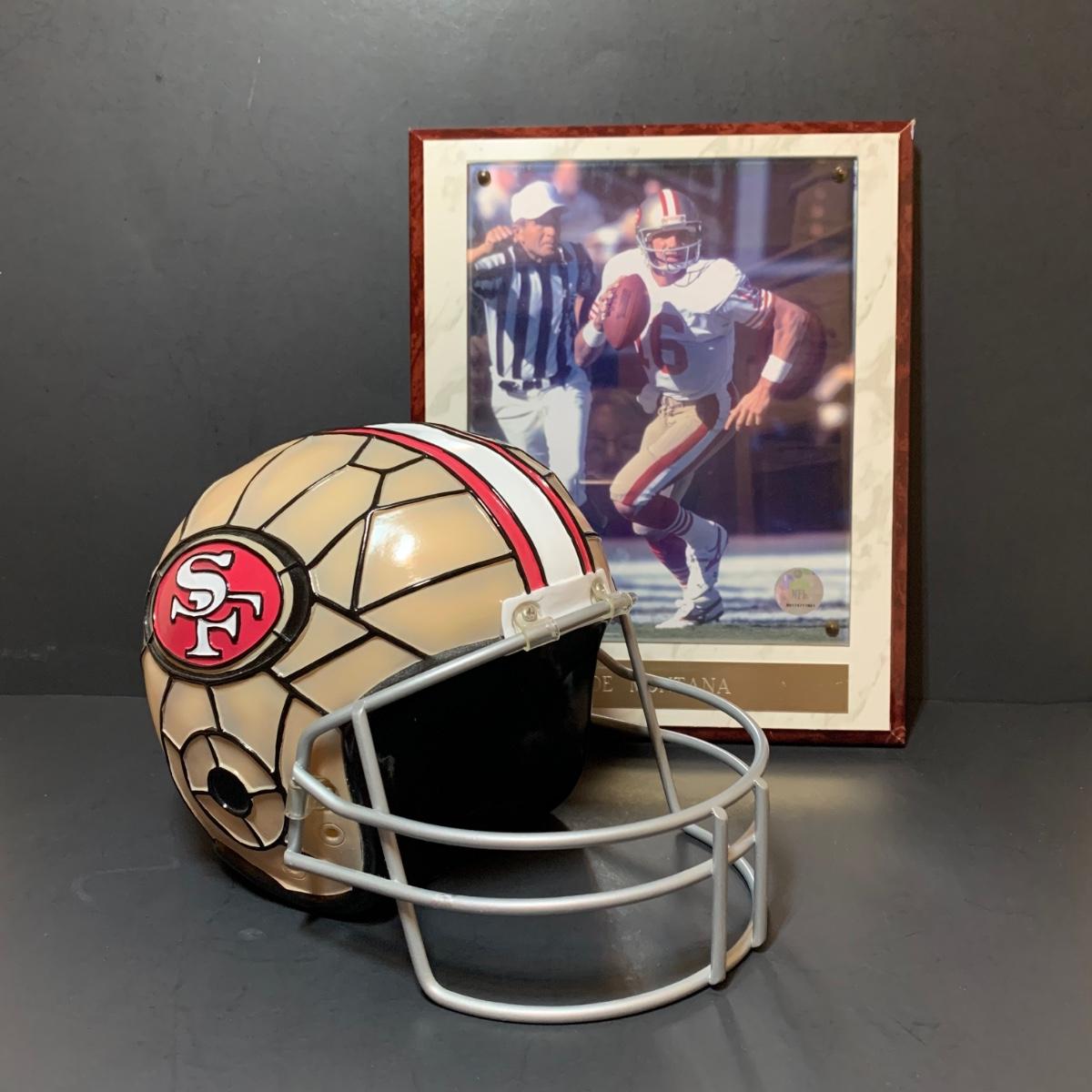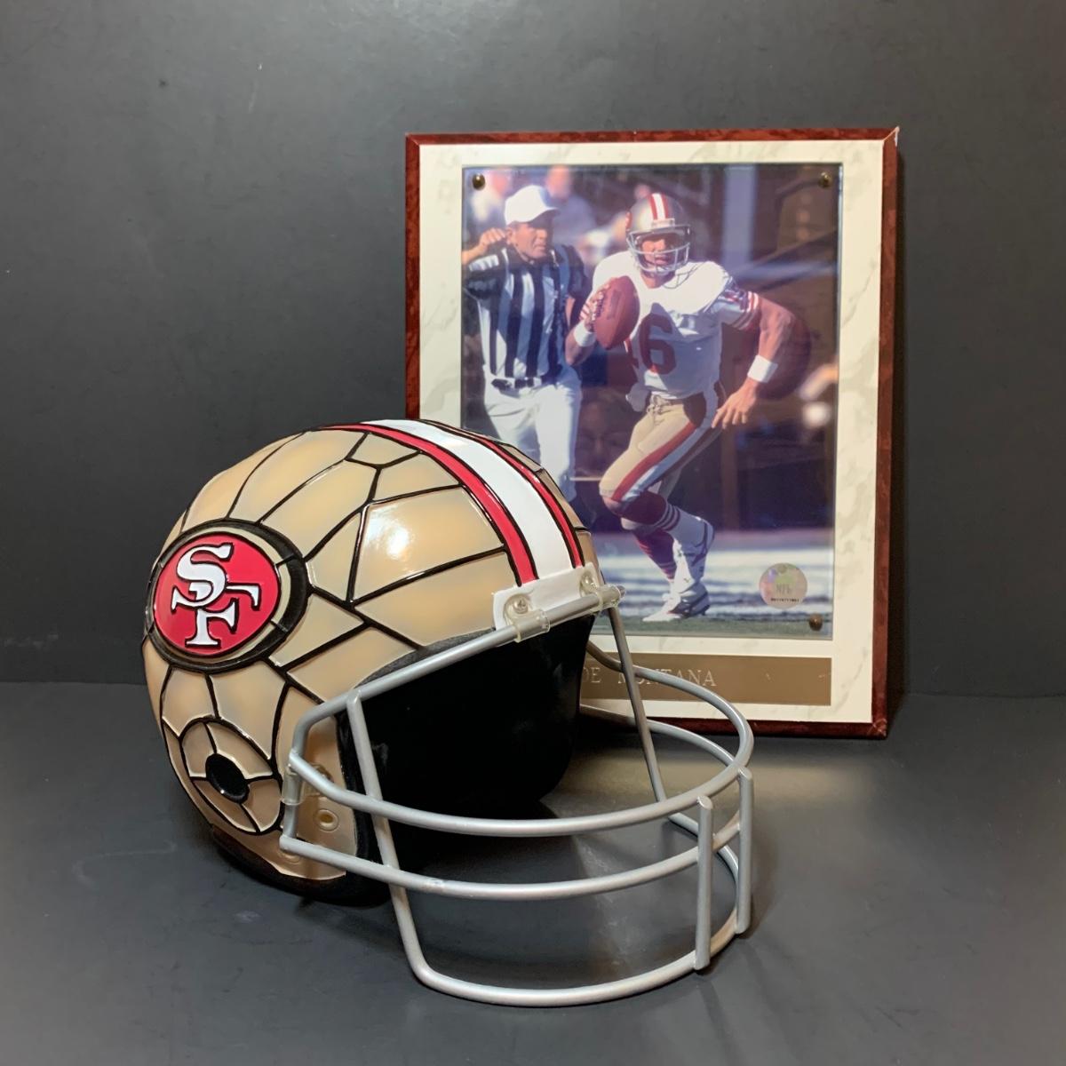LOT 145: Bradford Exchange - San Fransisco 49ers Football Helmet Shaped Stained Glass Accent Lamp with Joe Montana Photo Plaque
