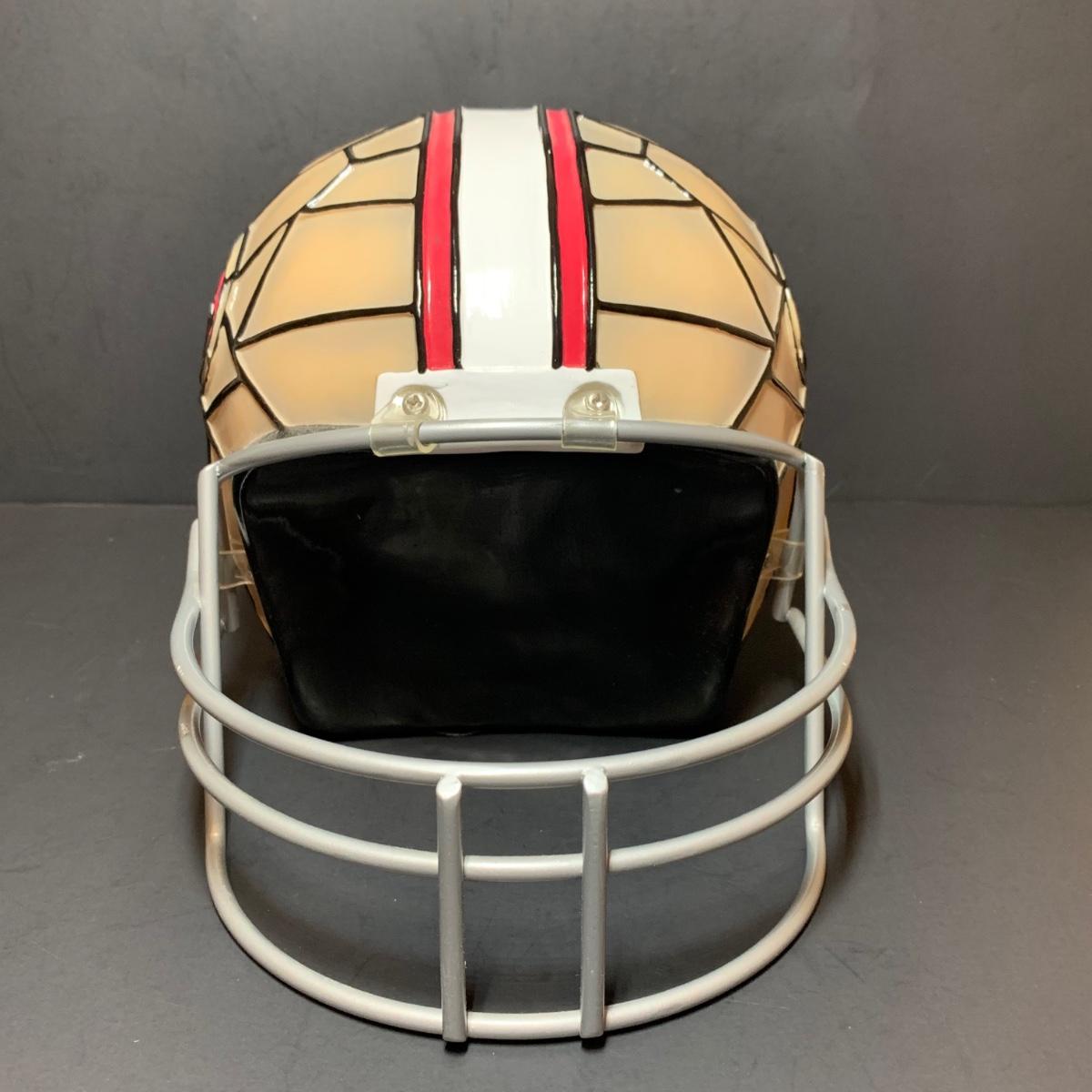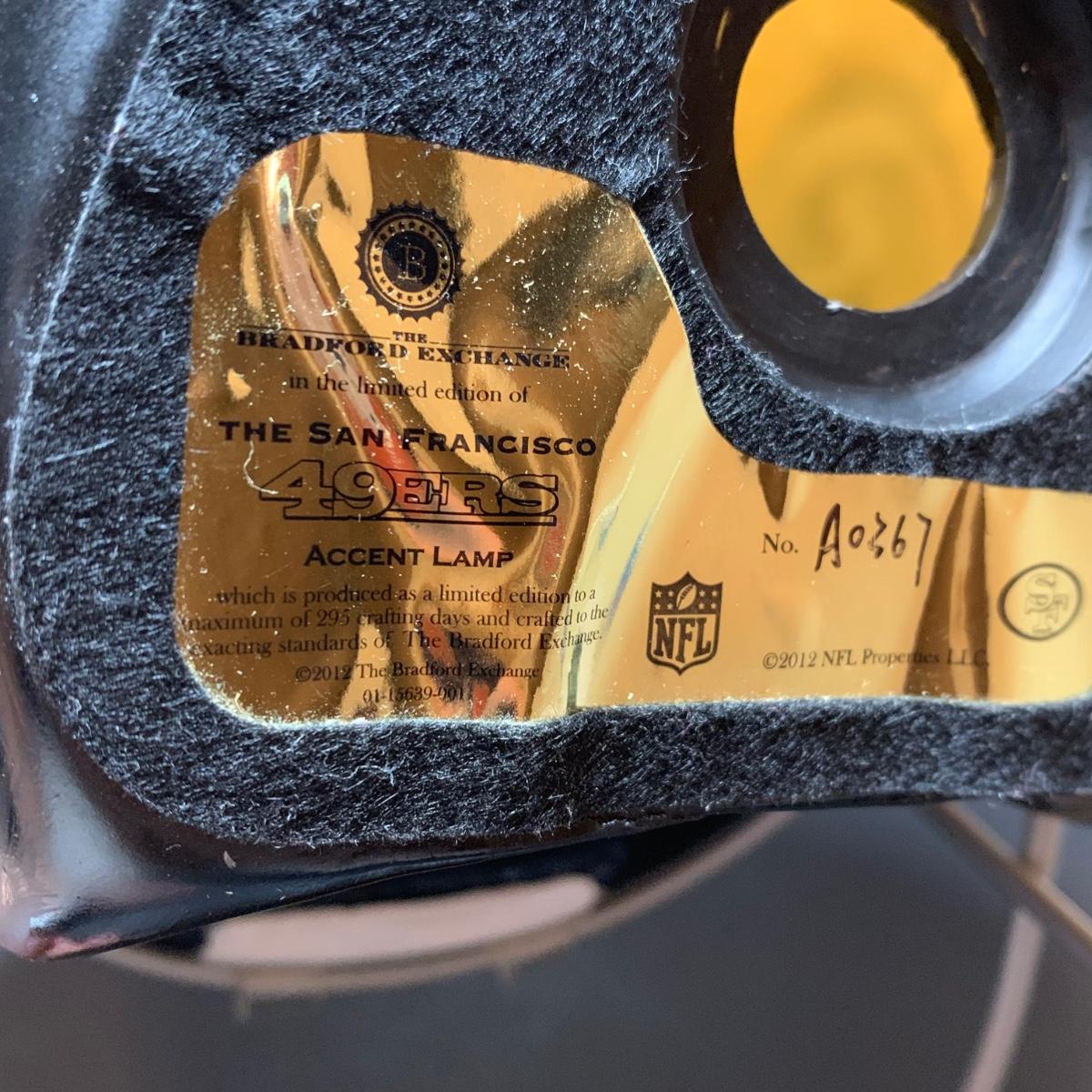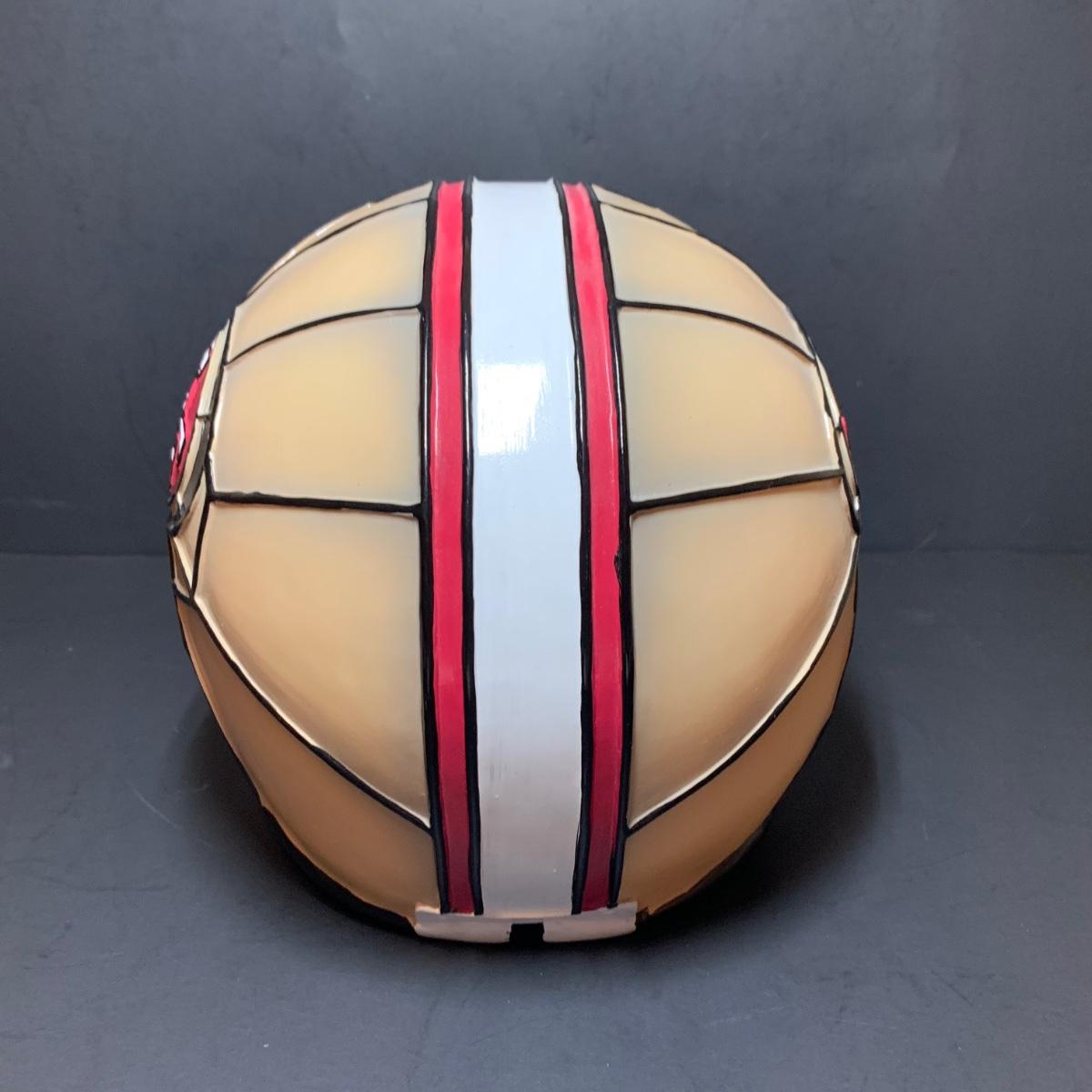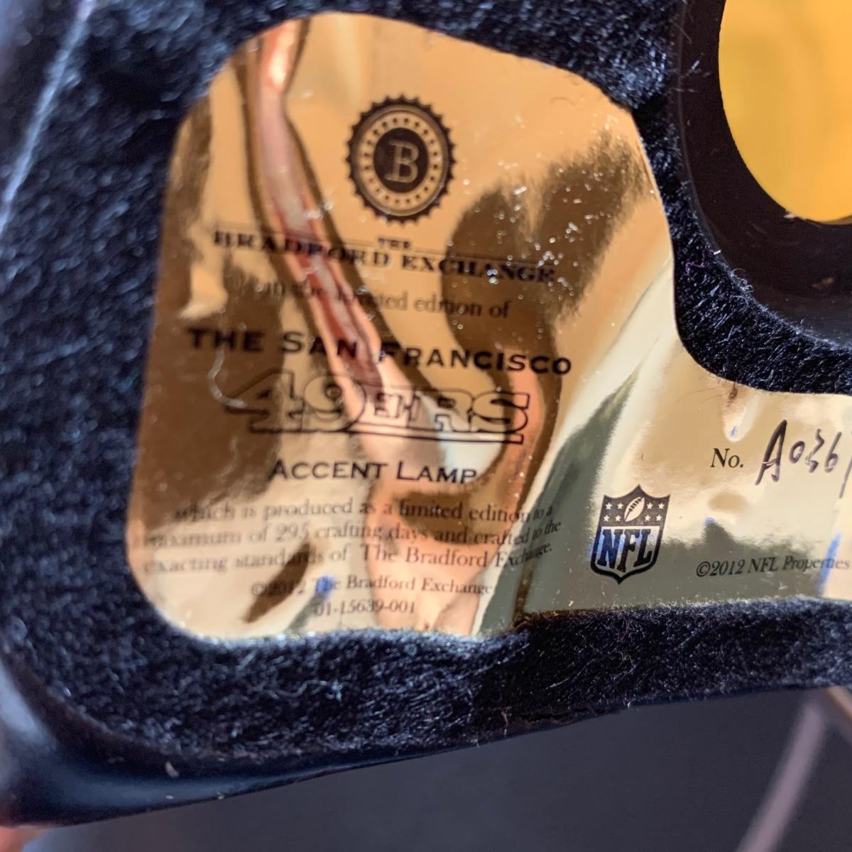LOT 145: Bradford Exchange - San Fransisco 49ers Football Helmet Shaped Stained Glass Accent Lamp with Joe Montana Photo Plaque