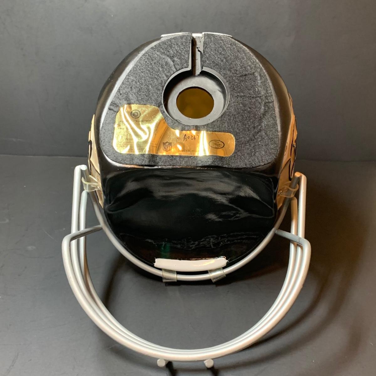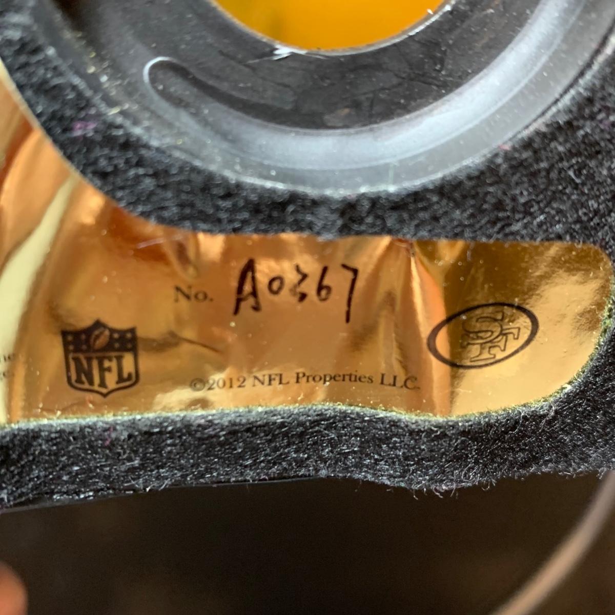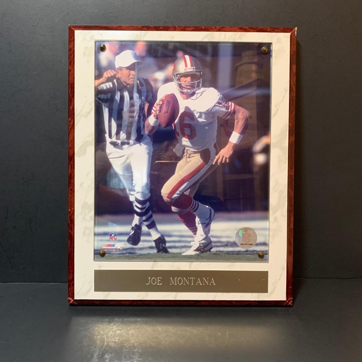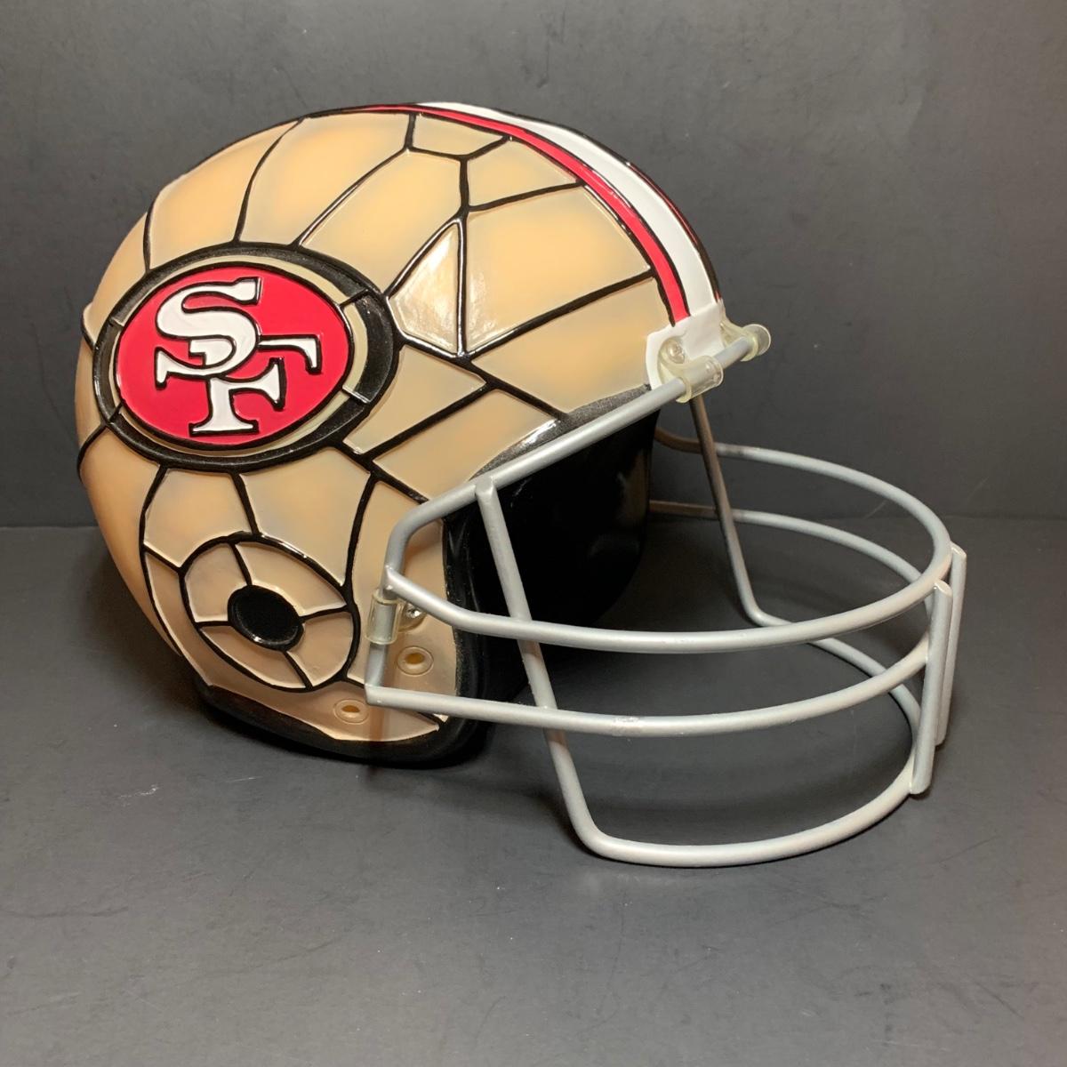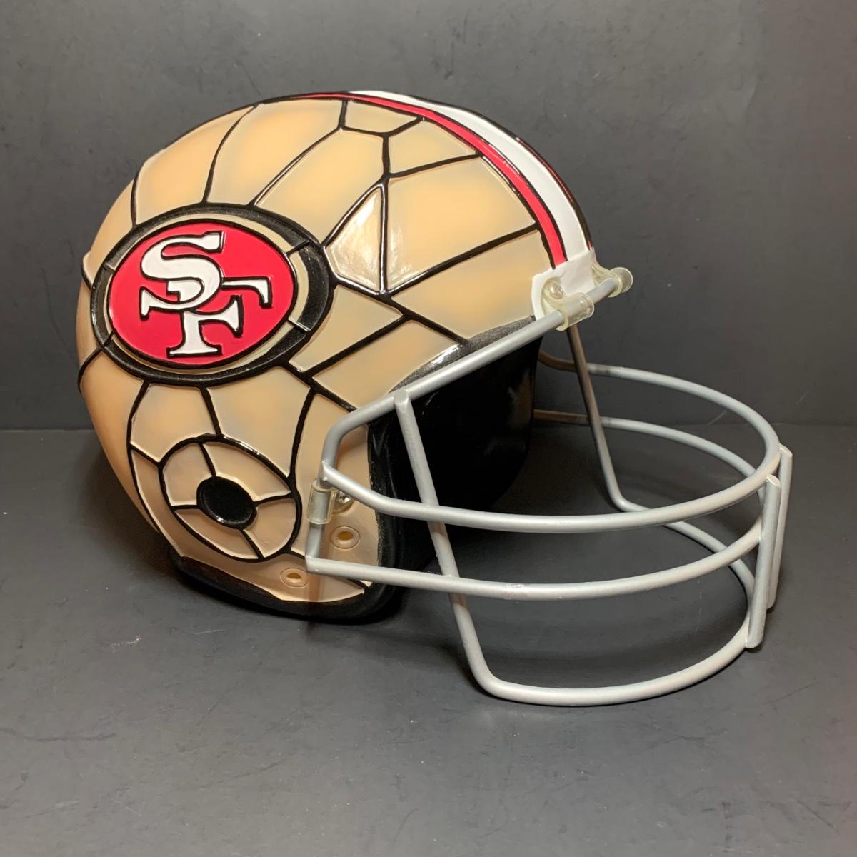 LOT 145: Bradford Exchange - San Fransisco 49ers Football Helmet Shaped Stained Glass Accent Lamp with Joe Montana Photo Plaque