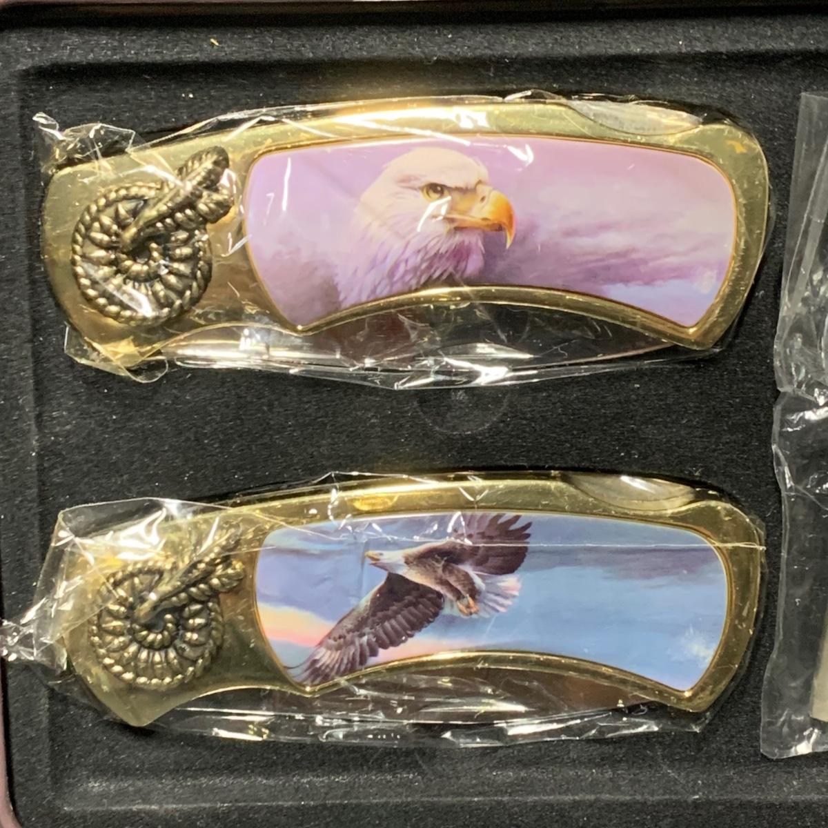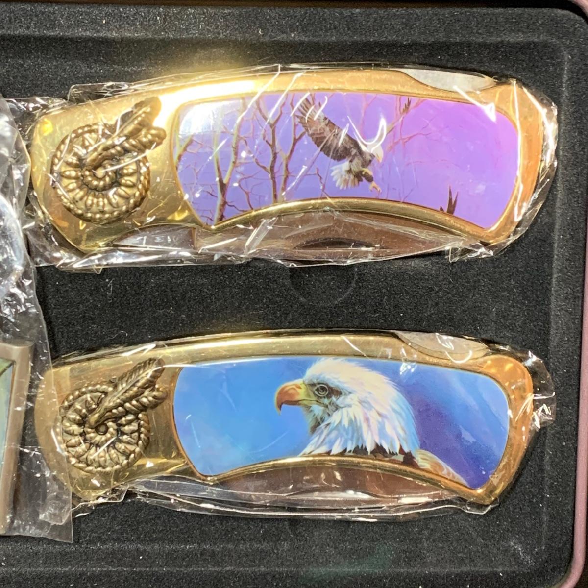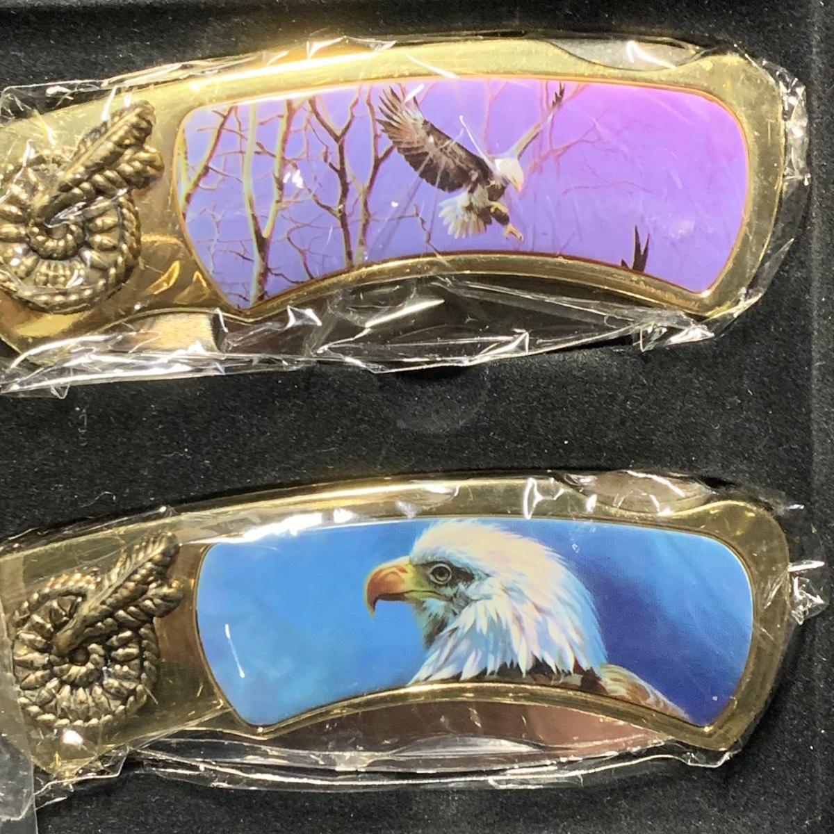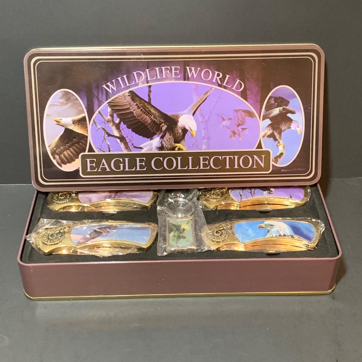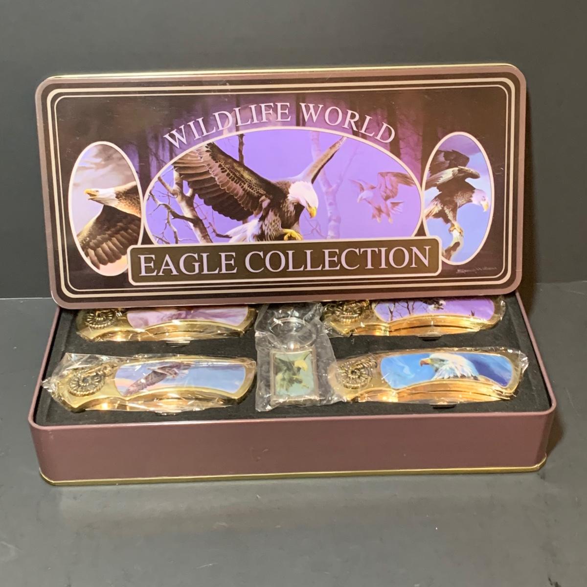 LOT 160: Wildlife World Eagle Collection Folding Pocket 4 Knife Collection with Stainless Steel Case and Key Chain