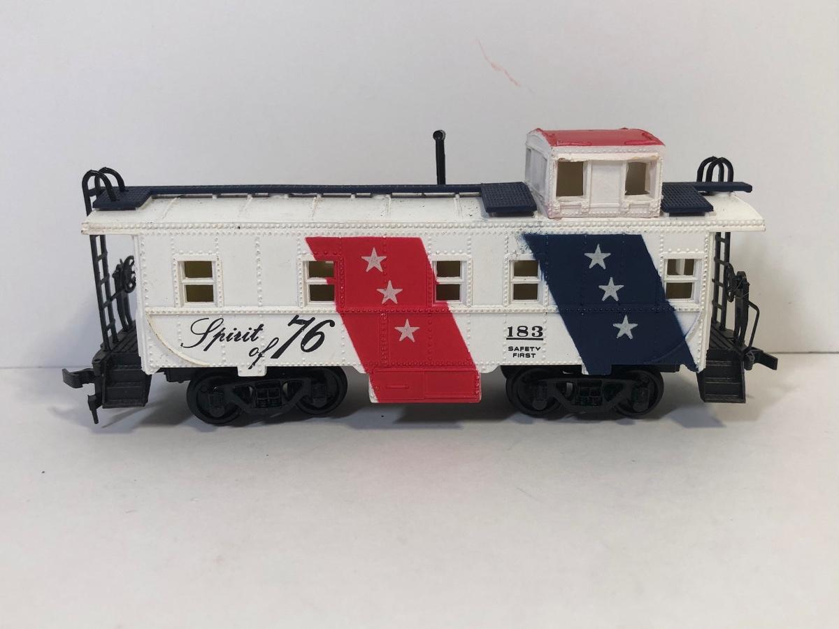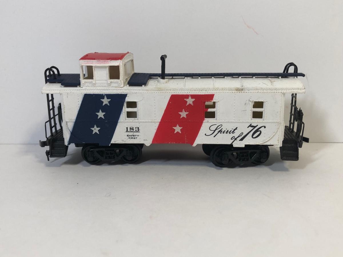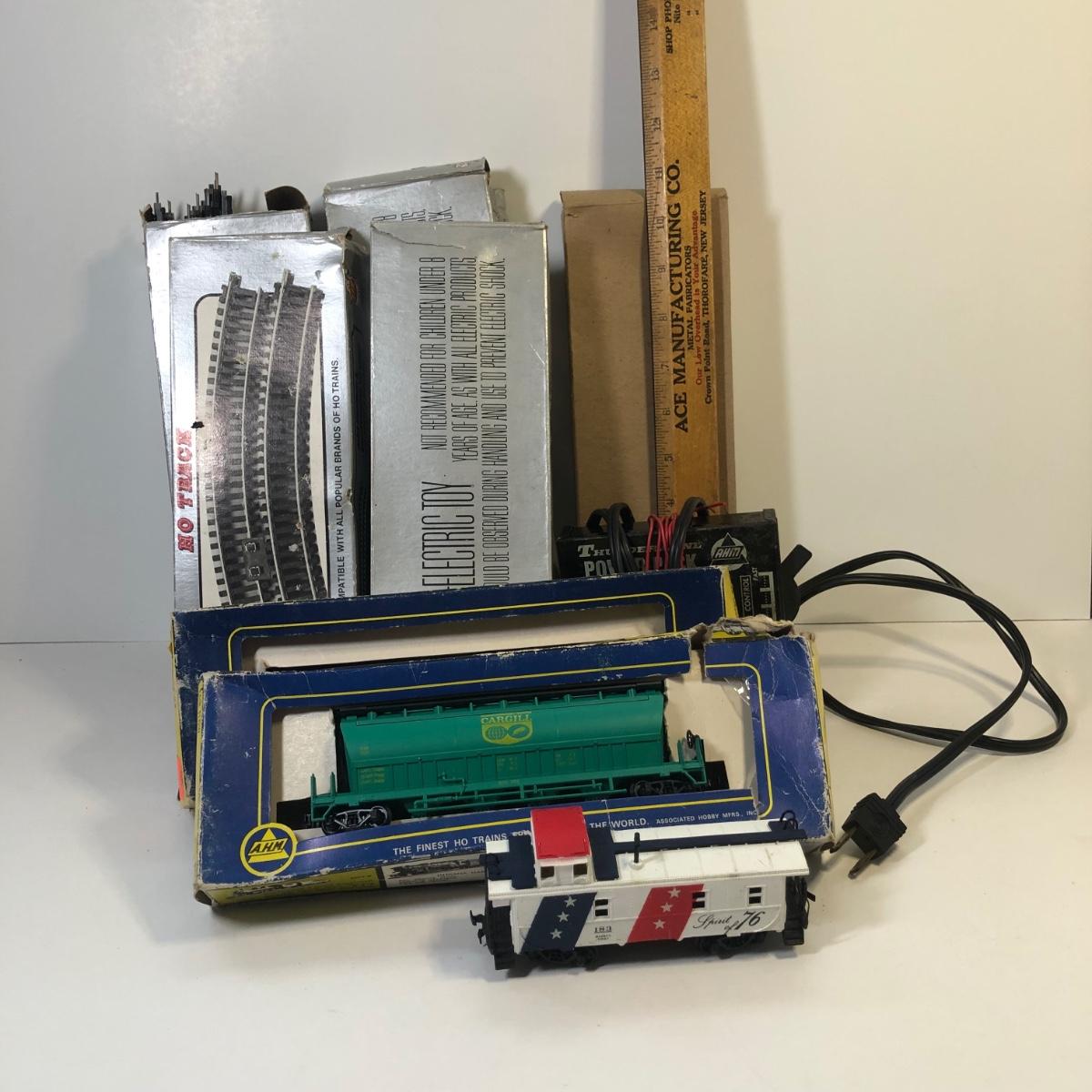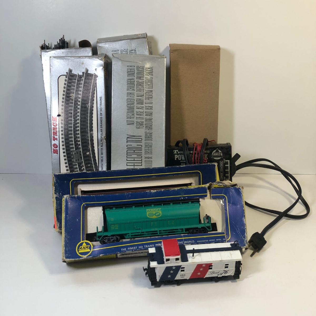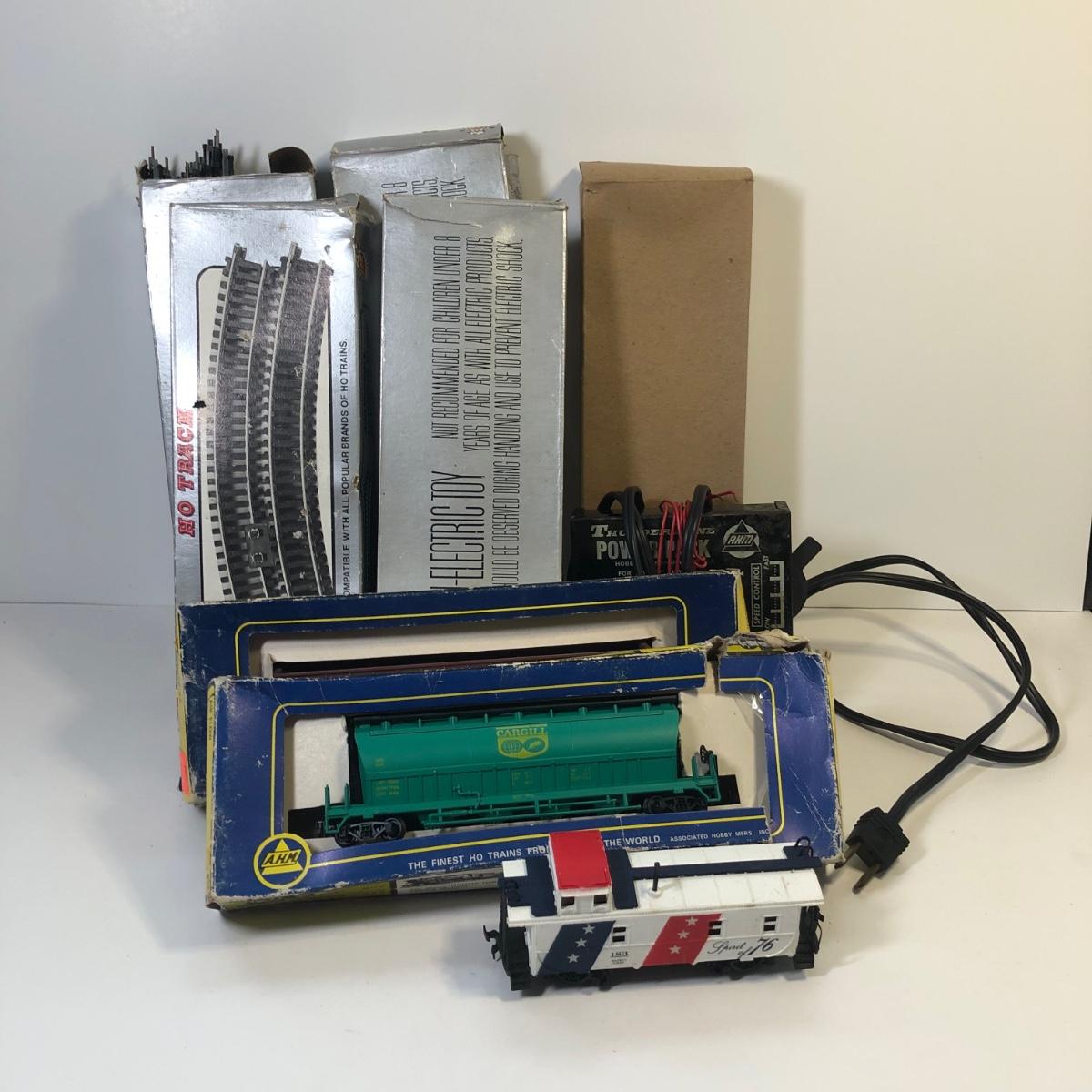 Includes five boxes of track, two boxed AHM cars, a Spirit of '76 train car and an electric box.