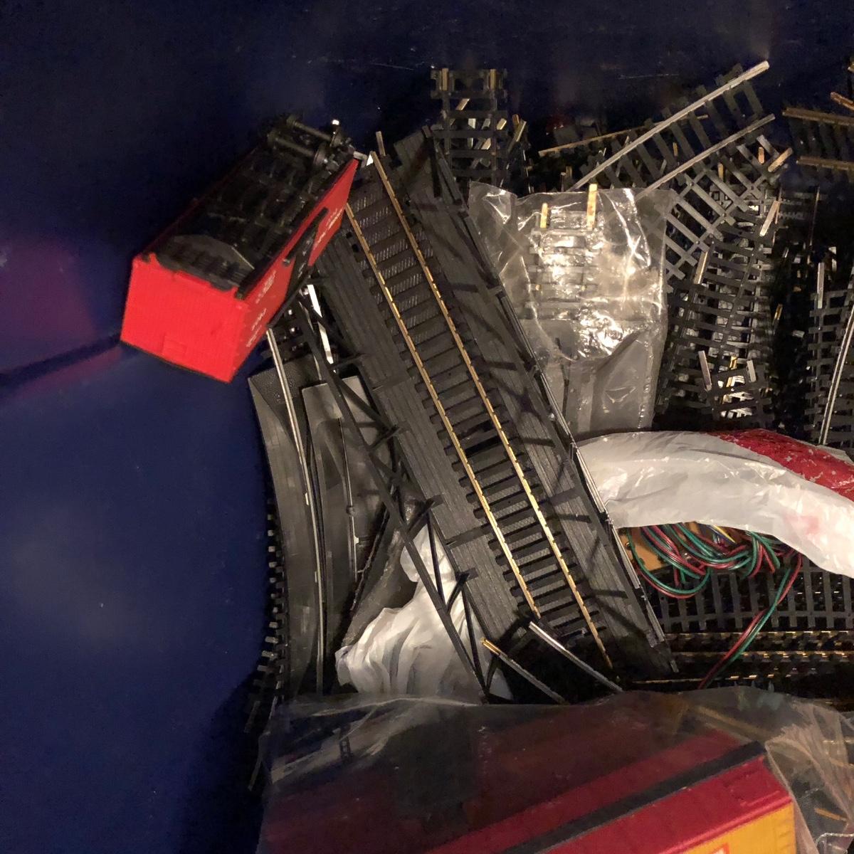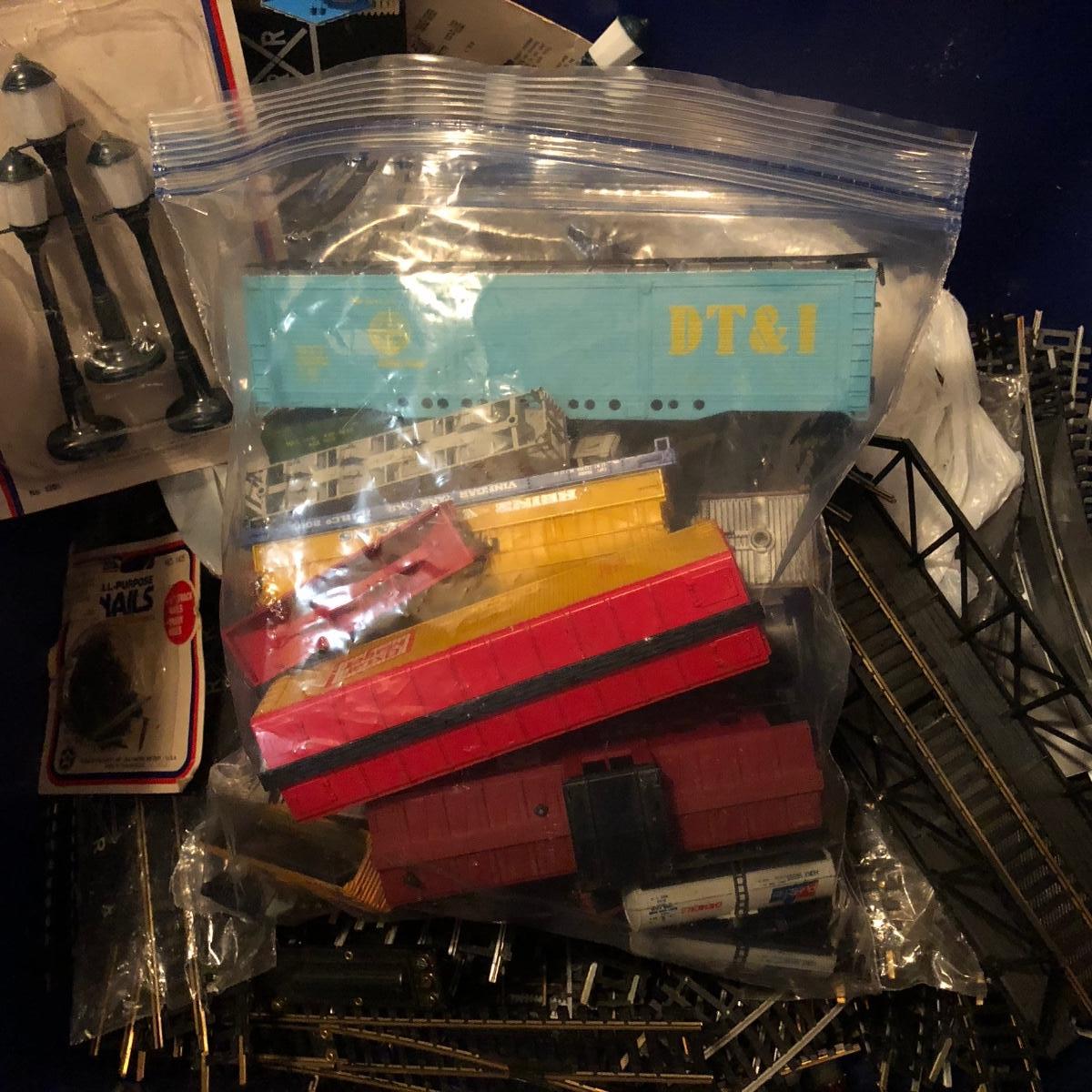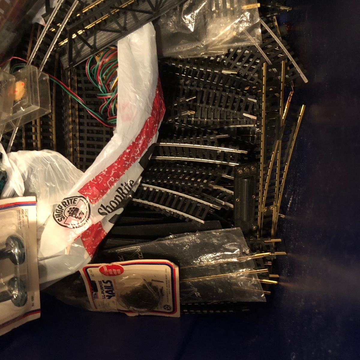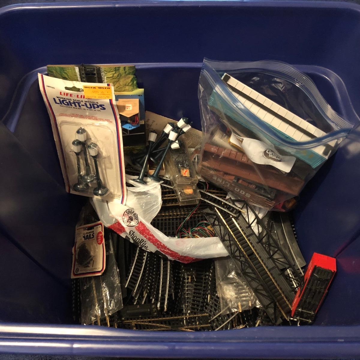 LOT 166M: Box of Train Tracks, Miniature Accessories, & Train Parts