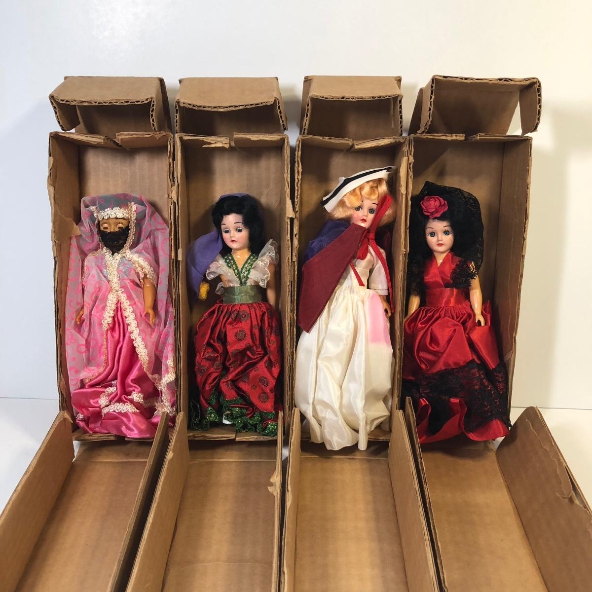 Four dolls with boxes. 7.5 inches tall. Plastic is old and differs from the head to the body, so some dolls have condition issues (see photos).