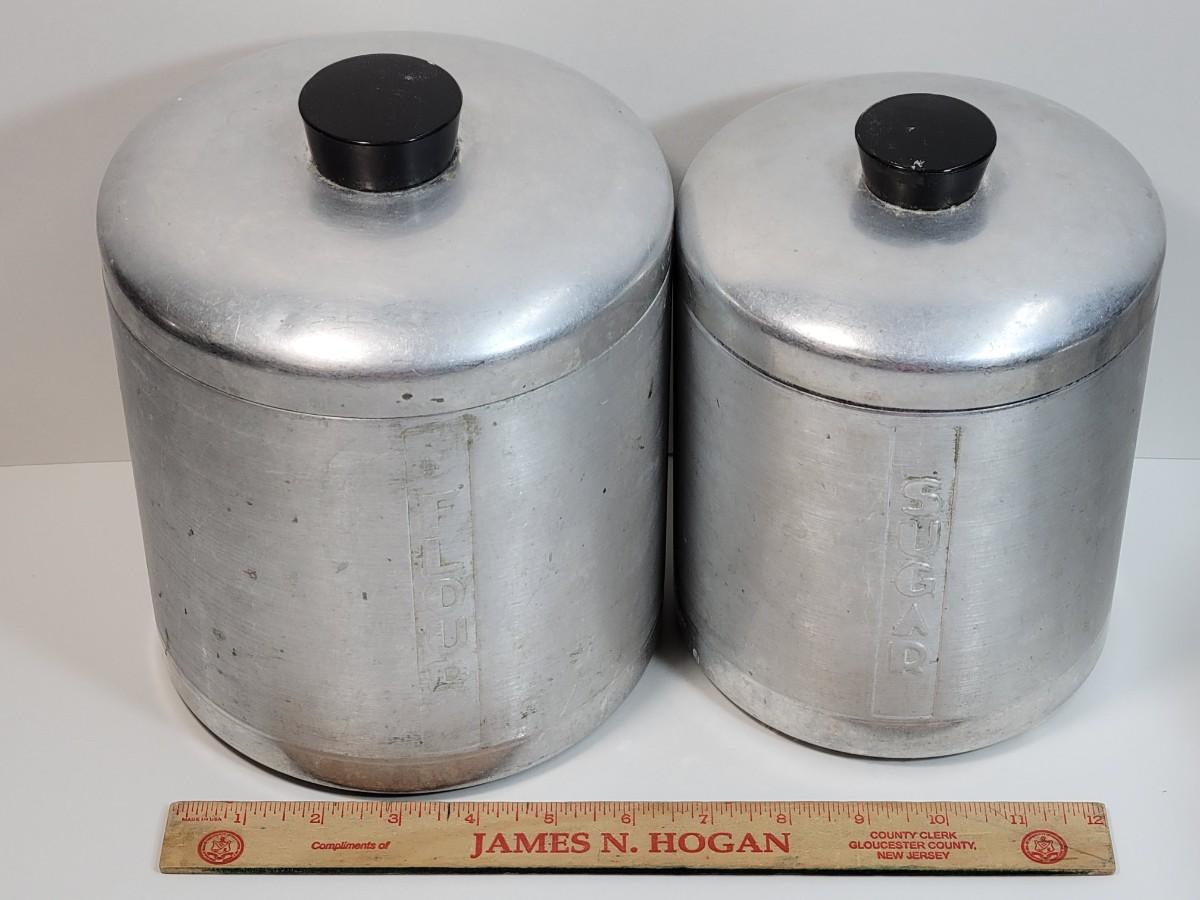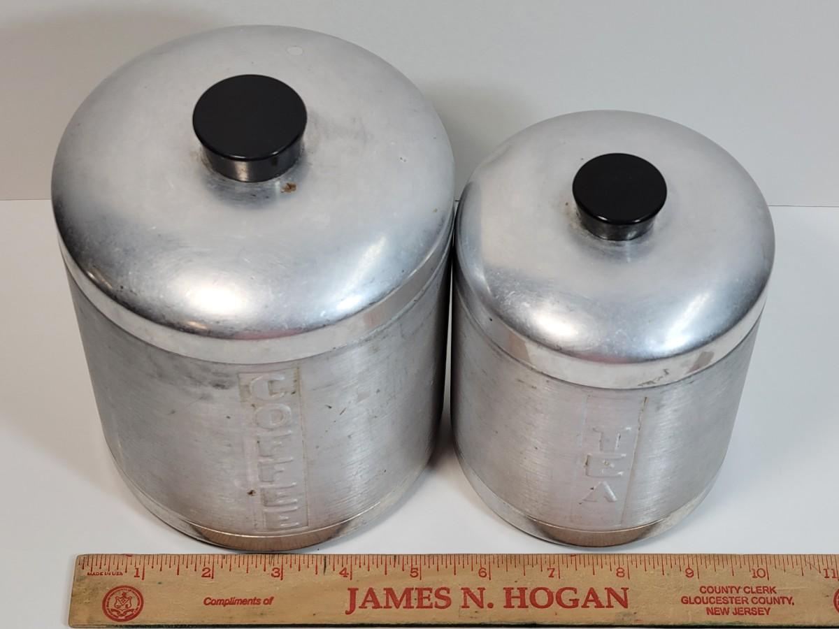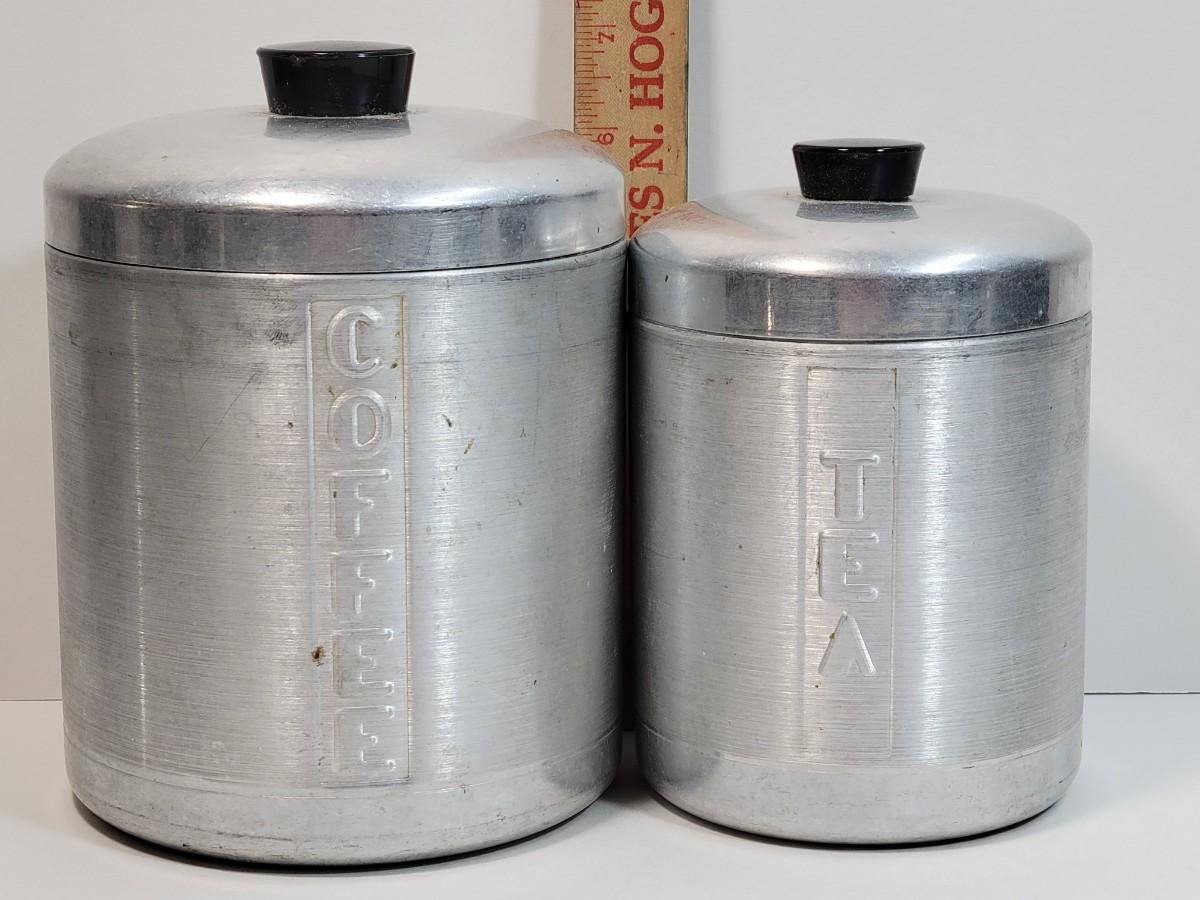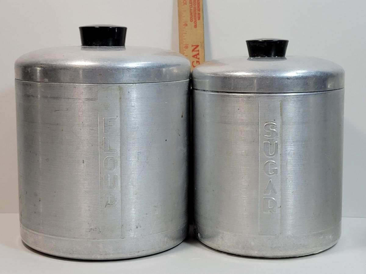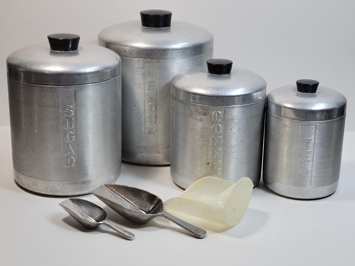 LOT 7: Vintage Spun Aluminum Canisters: Flour, Sugar, Coffee, Tea with 3 scoops