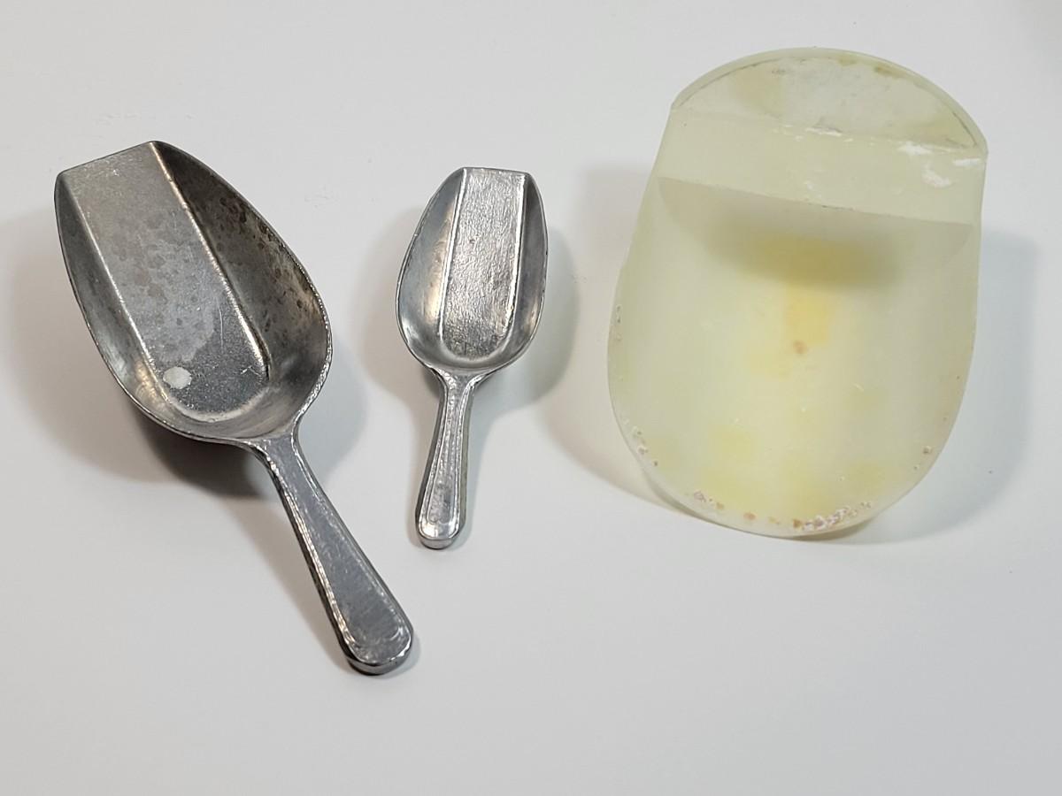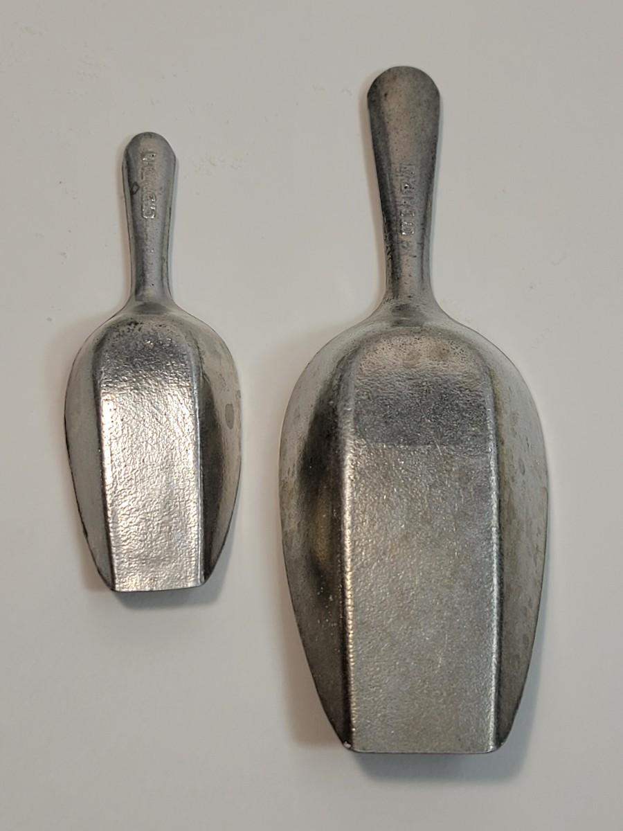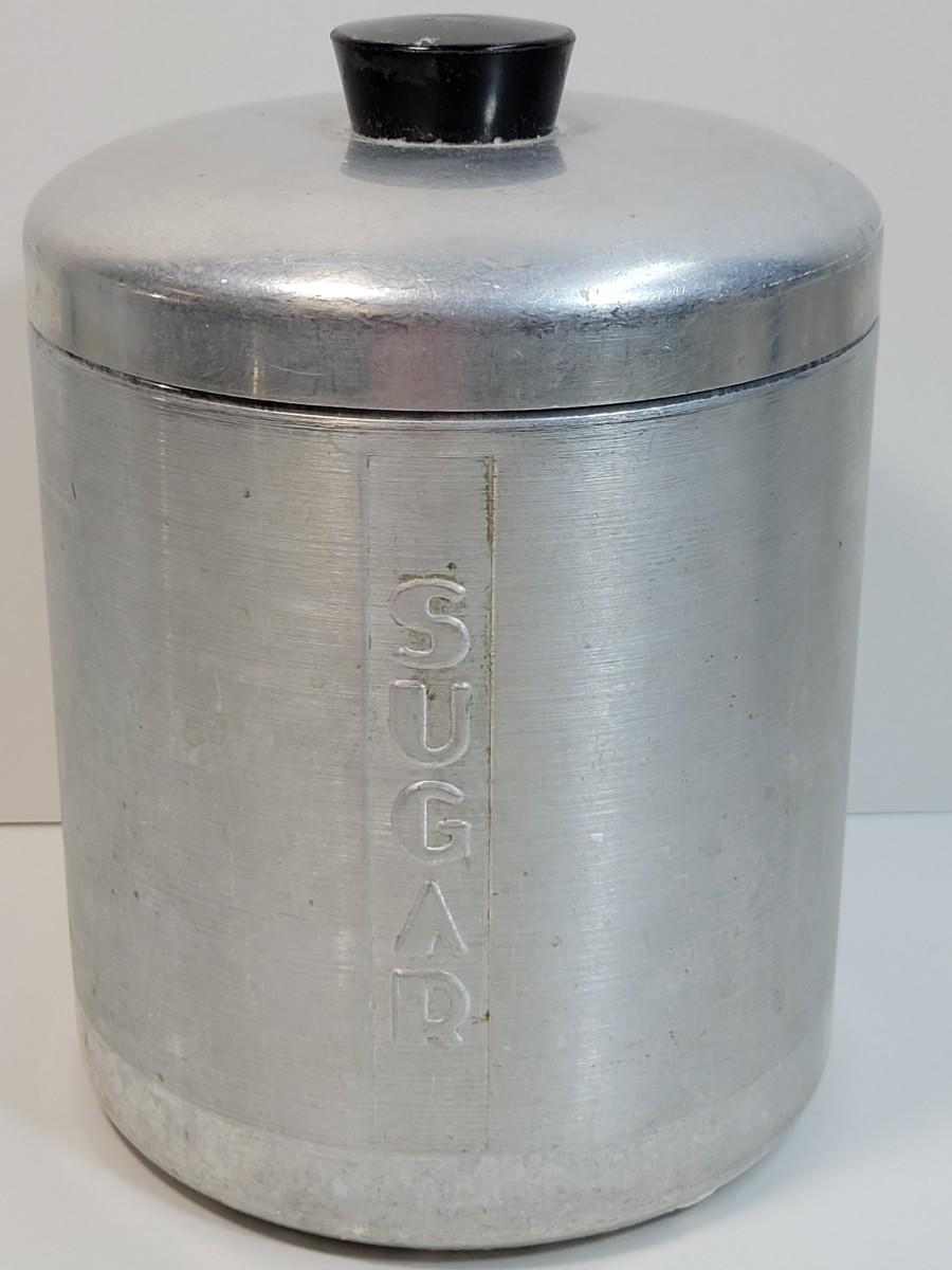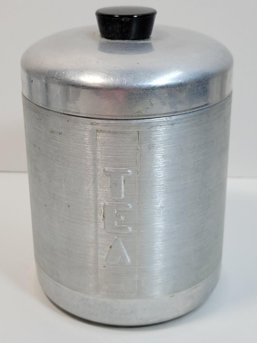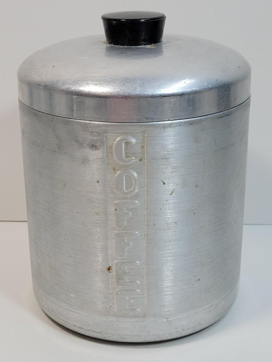 LOT 7: Vintage Spun Aluminum Canisters: Flour, Sugar, Coffee, Tea with 3 scoops