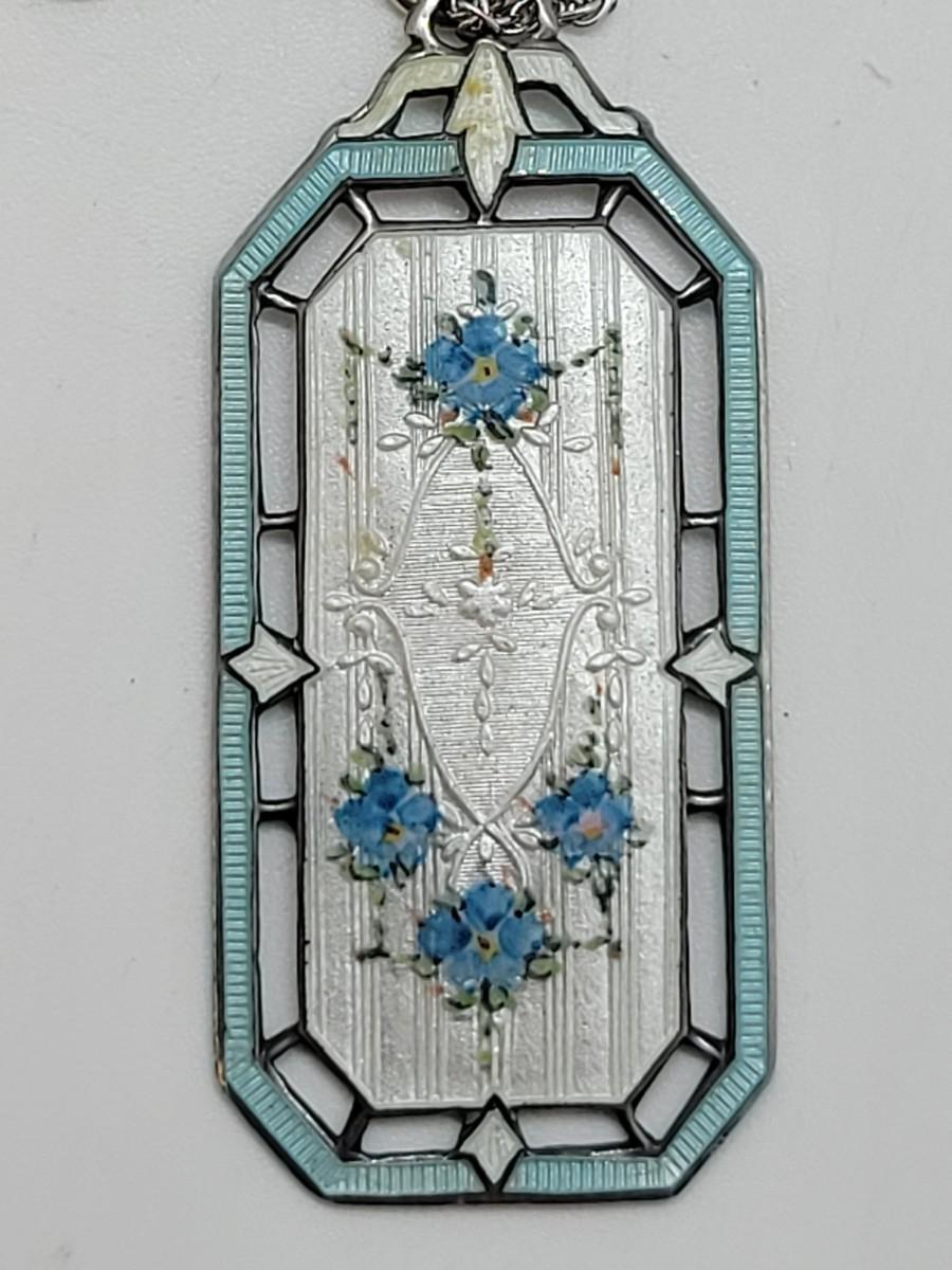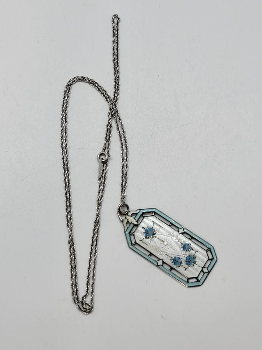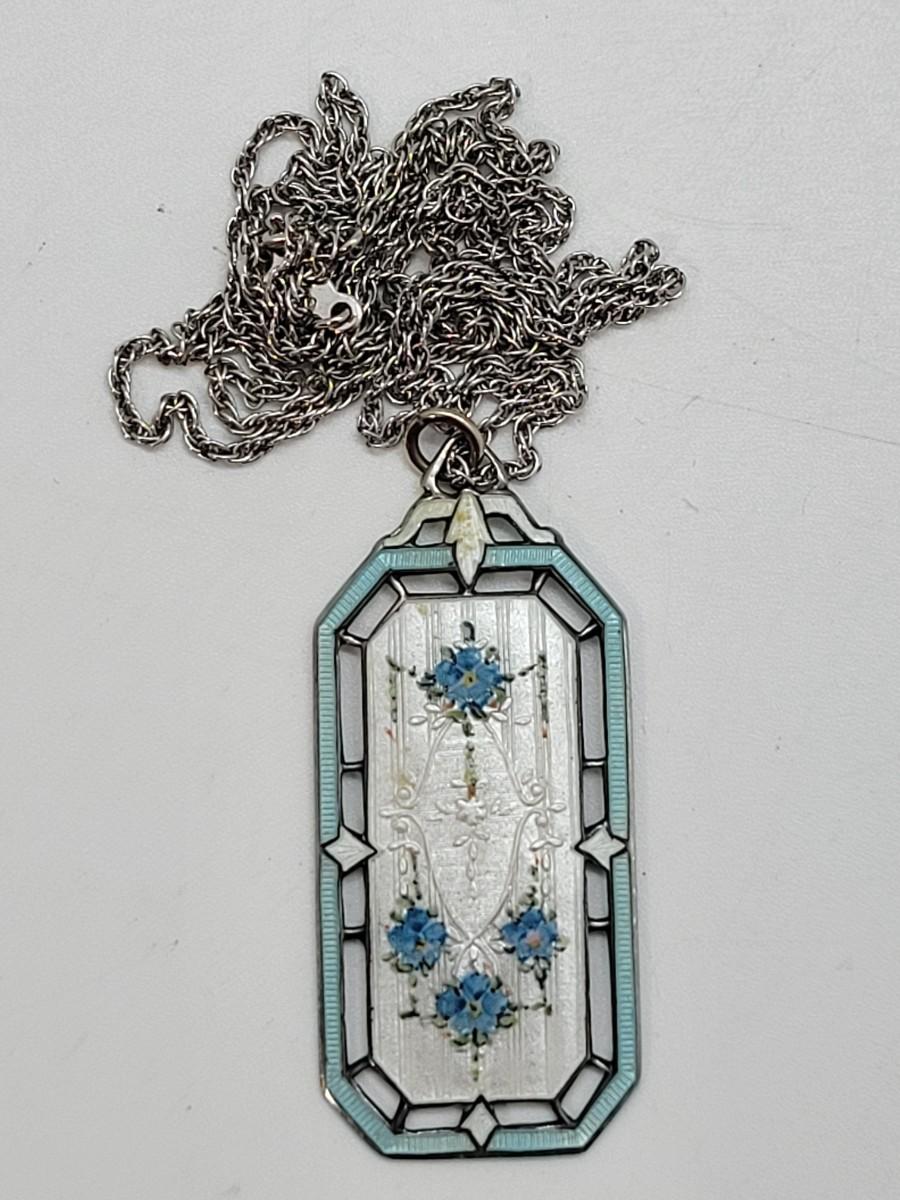 LOT 74: Antique Sterling Silver & Enamel Floral Pendant on B.A.B. Sterling 24" Chain