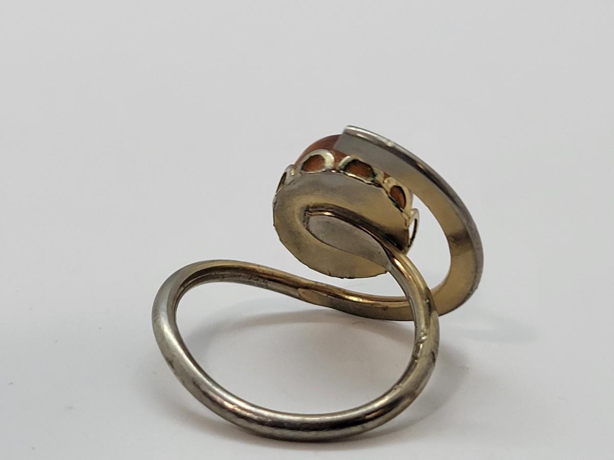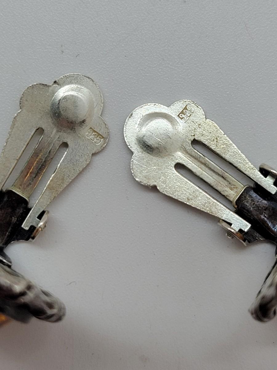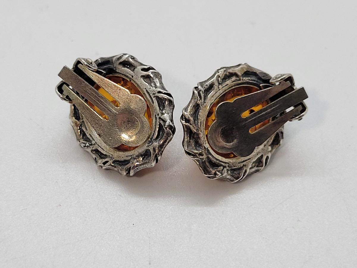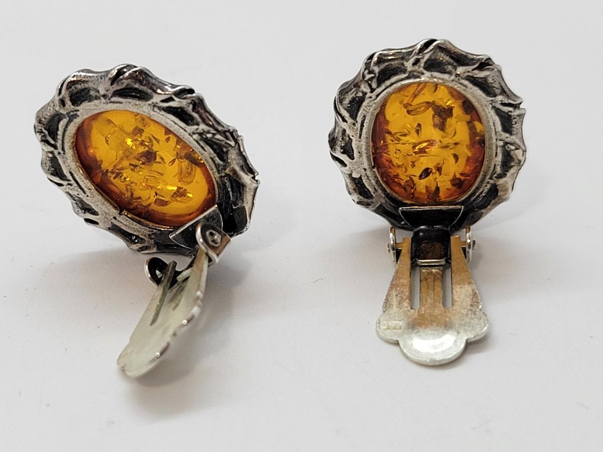 LOT 79: 925 Sterling Silver Amber Clip-Onn Earrings & Silvertone Amber Ring - Size 5.5
