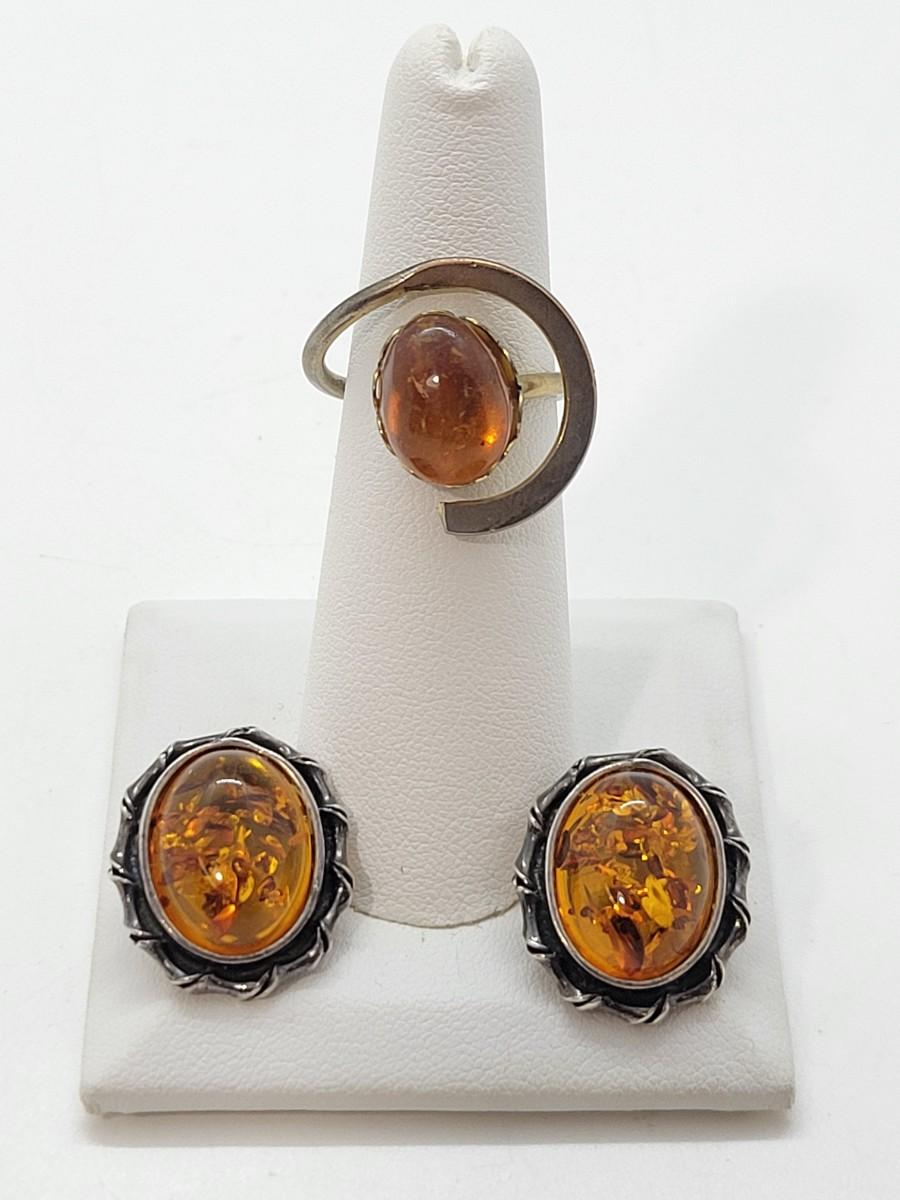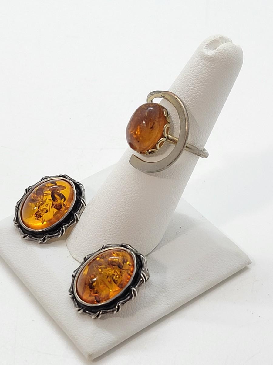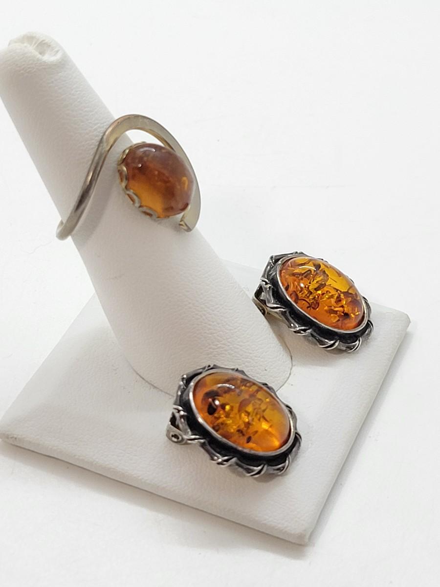 LOT 79: 925 Sterling Silver Amber Clip-Onn Earrings &  Silvertone Amber Ring - Size 5.5