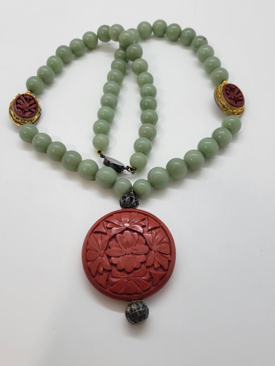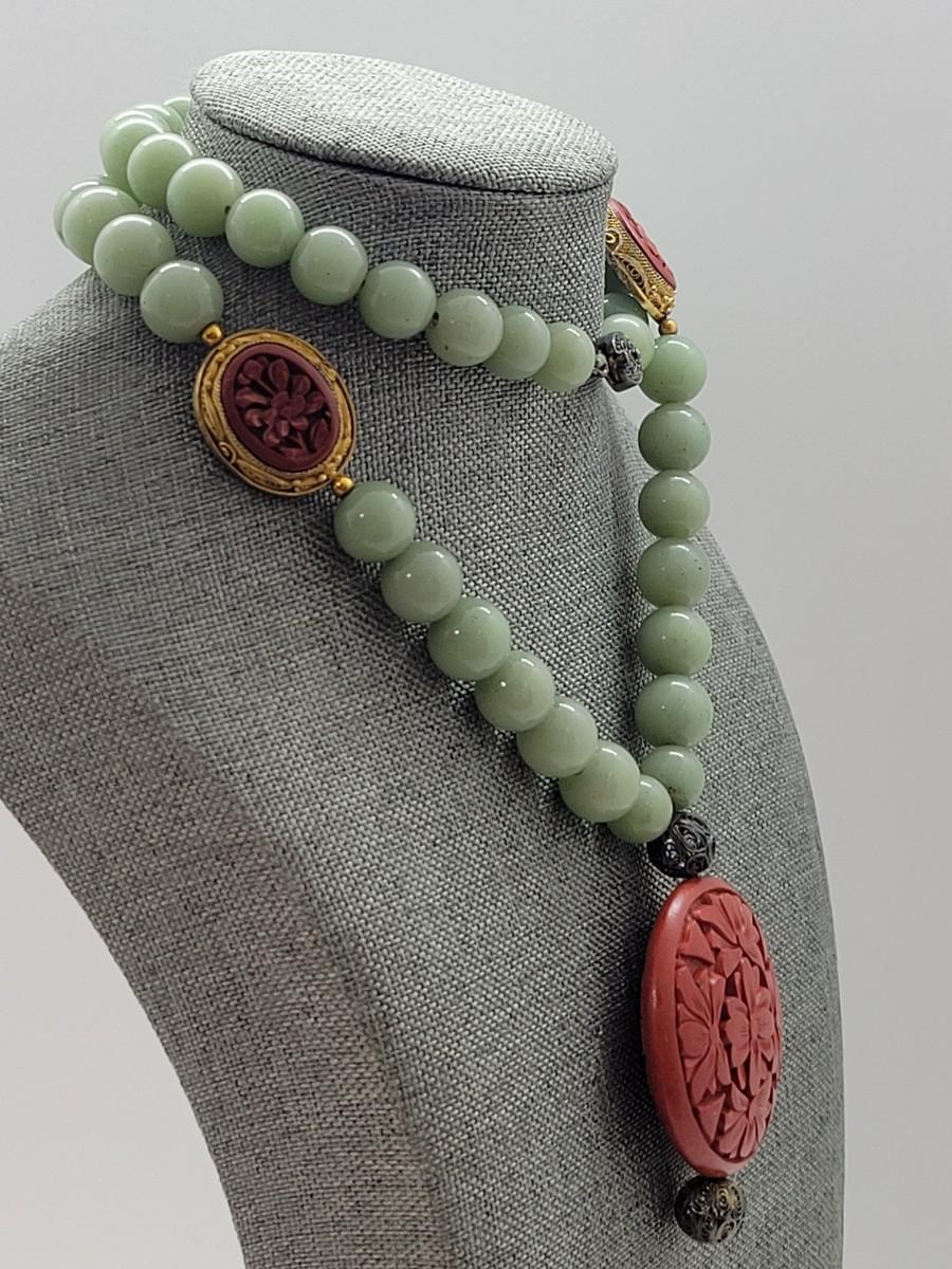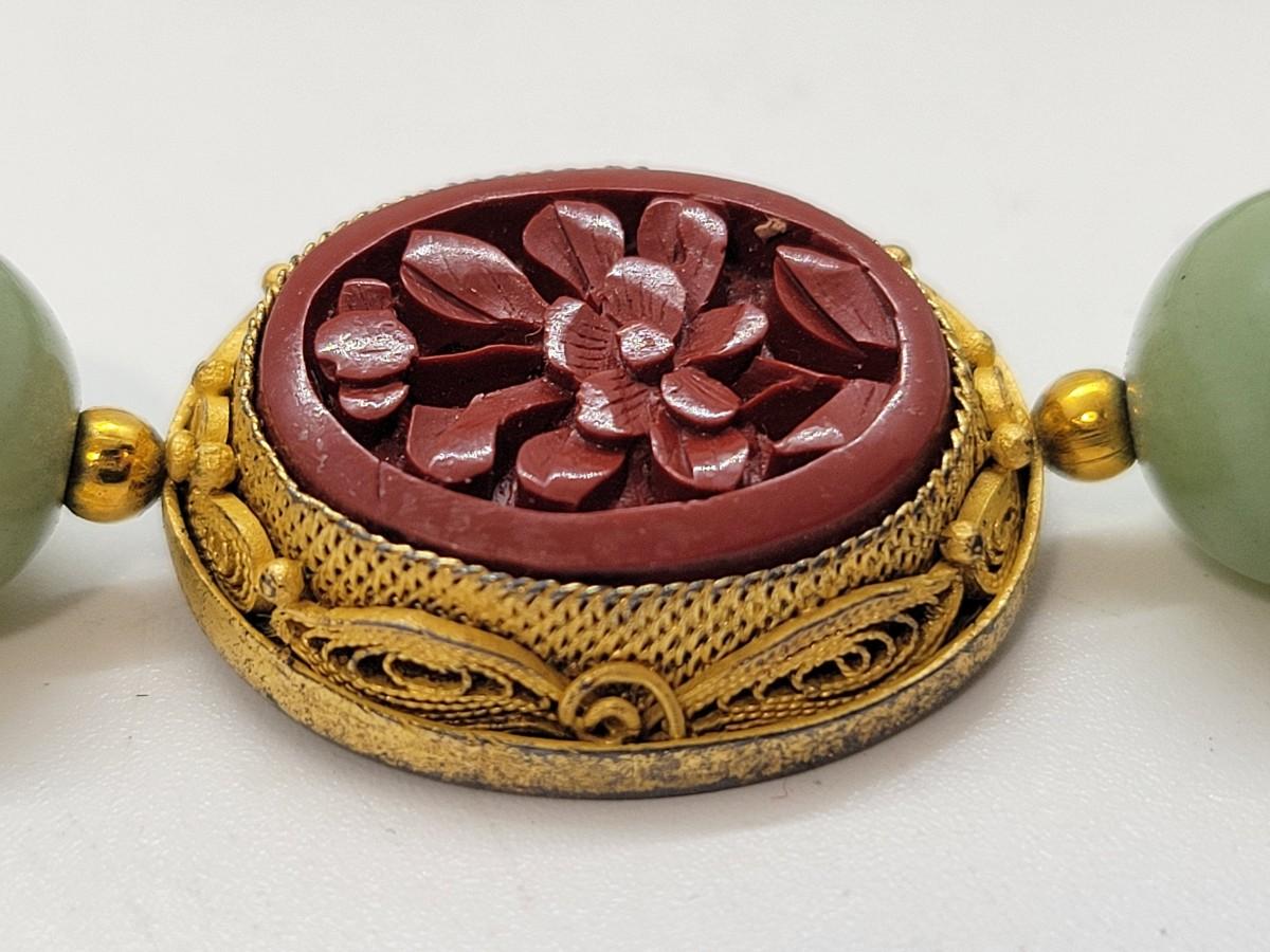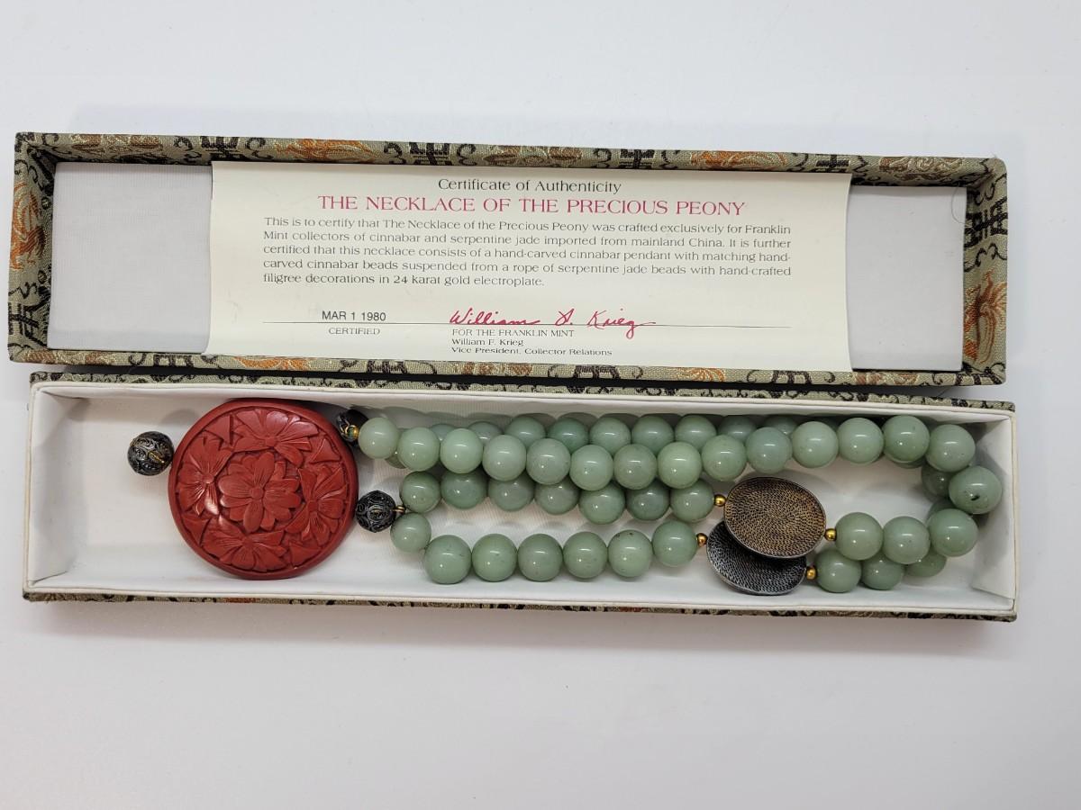 LOT 89: Franklin Mint - "The Necklace of the Precious Peony" Cinnabar & Serpentine Jade with 24K Gold Electroplate Accents