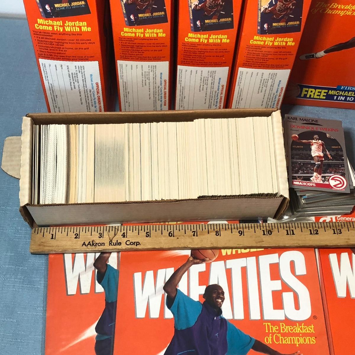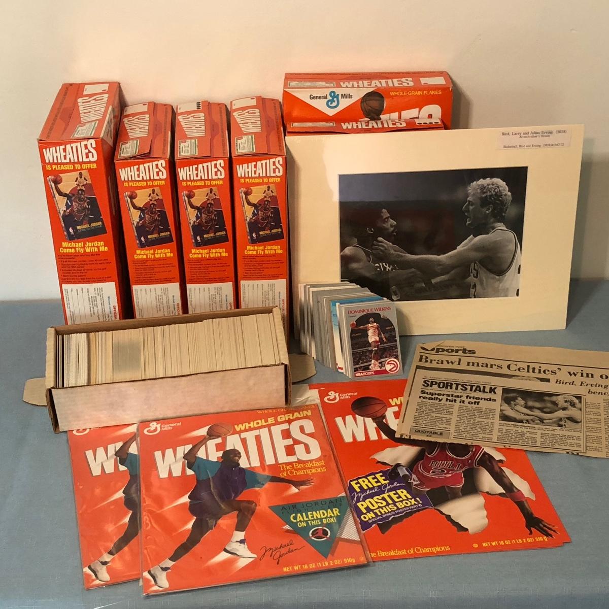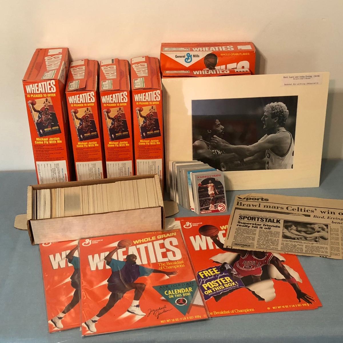 LOT 47M: Michael Jordan Wheaties Boxes & Posters, Mixed Basektball Cards, Photo of Larry Bird & Julius Erving