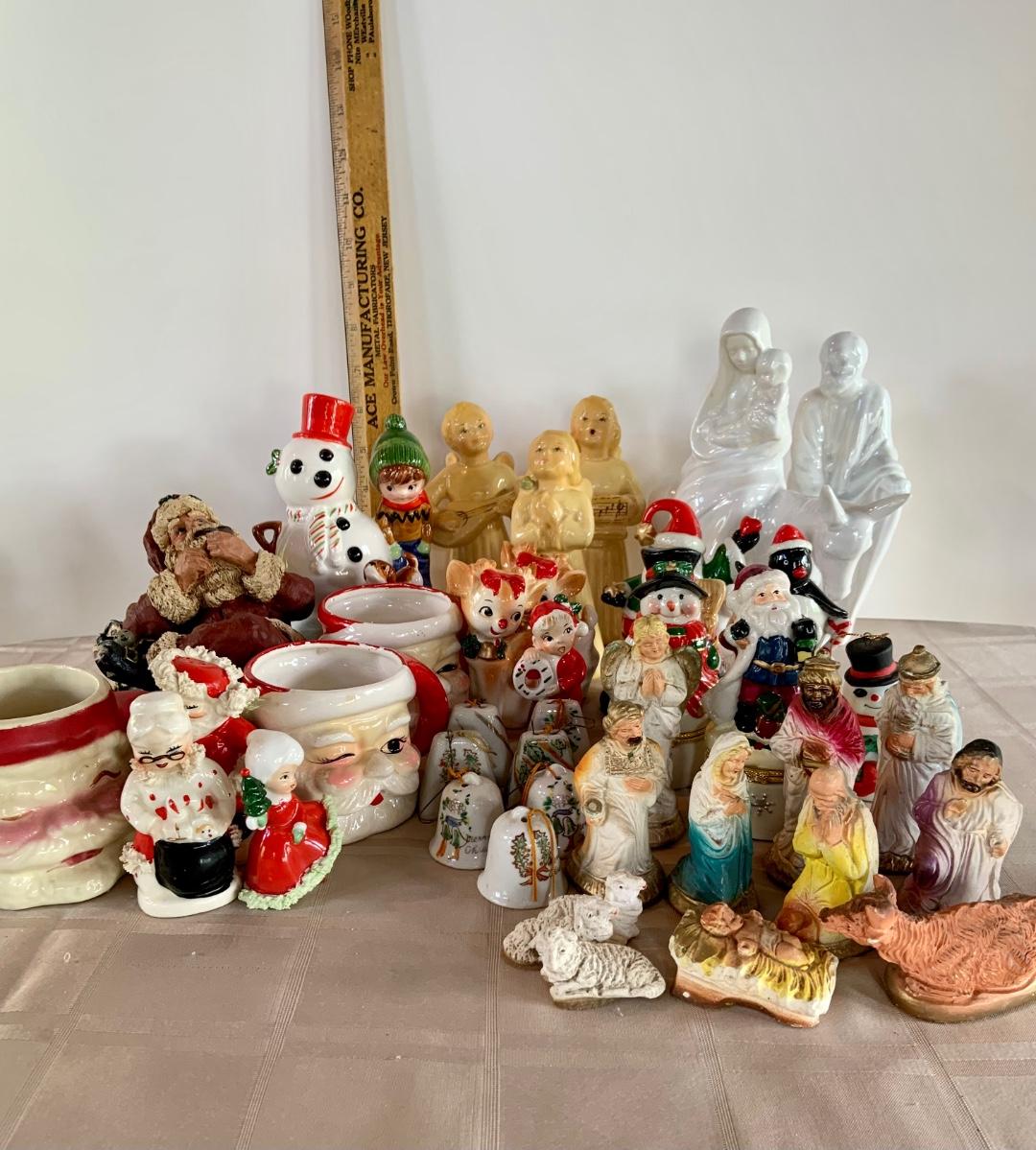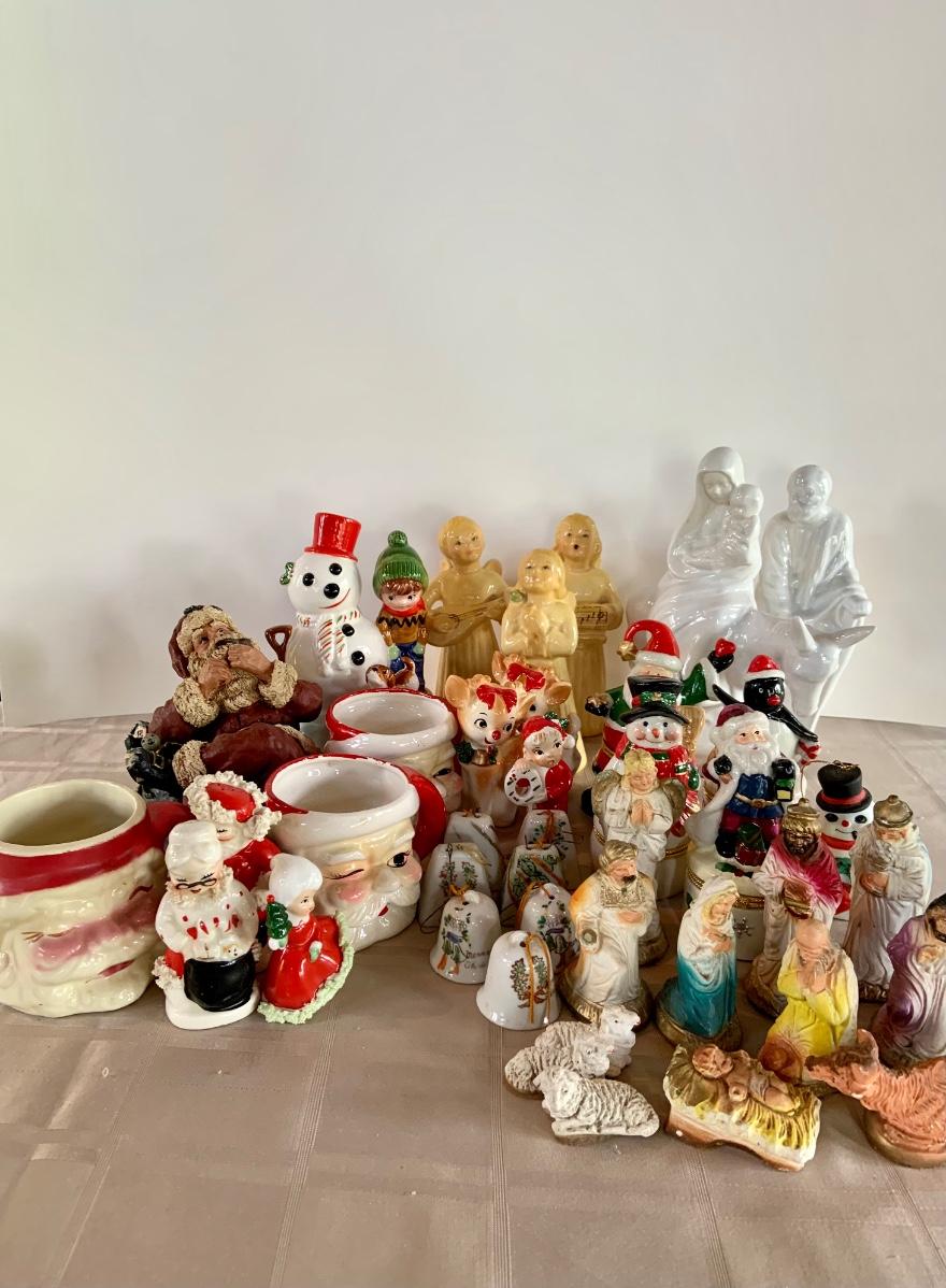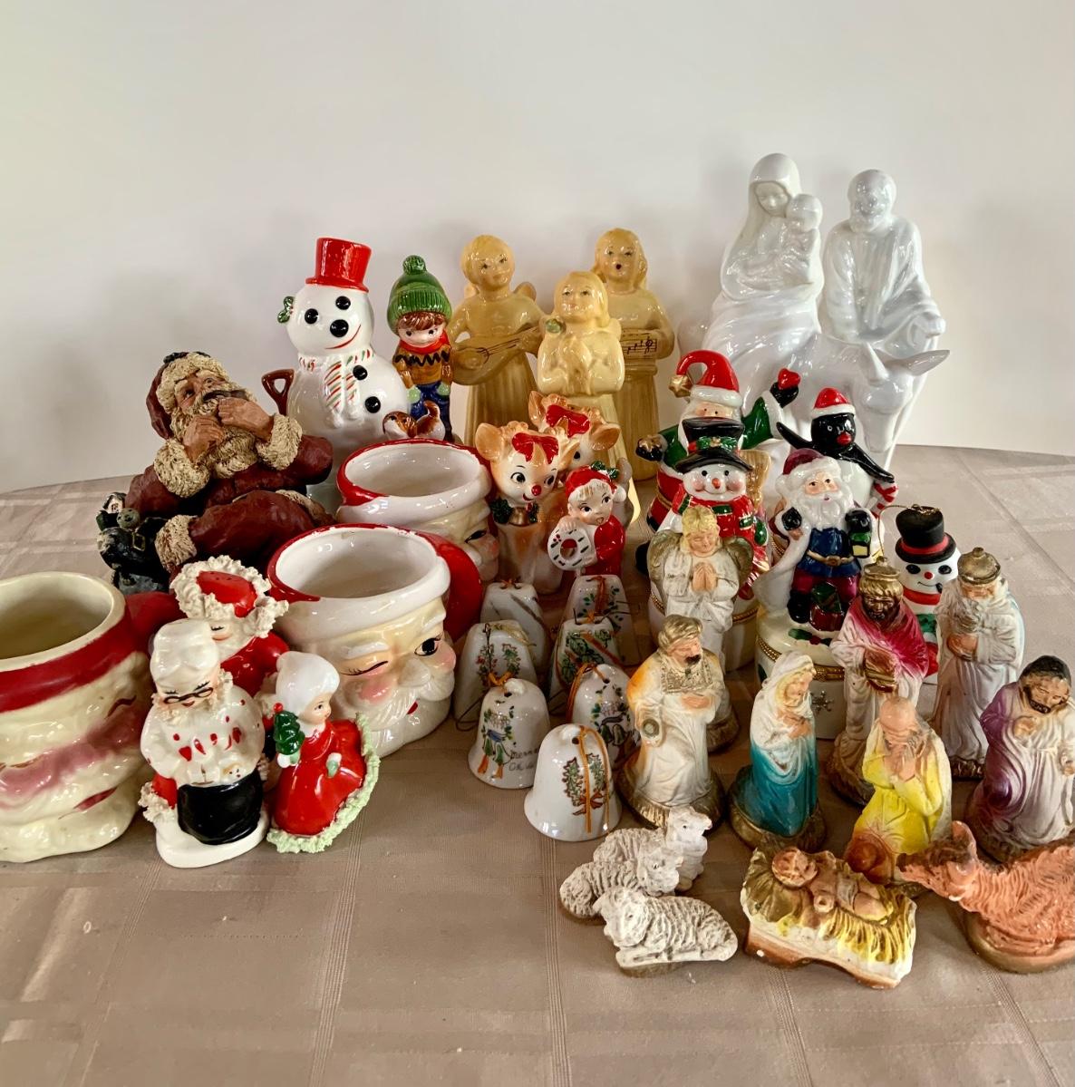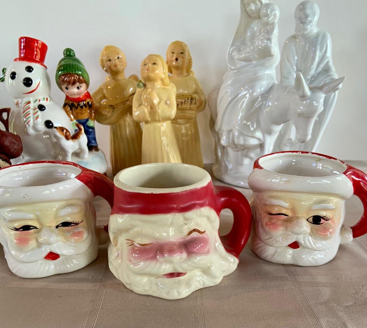 LOT:56G: Vintage Christmas: Nativity Set & Figures, Santa Mugs, Angels, Snowmen, Bells and More.