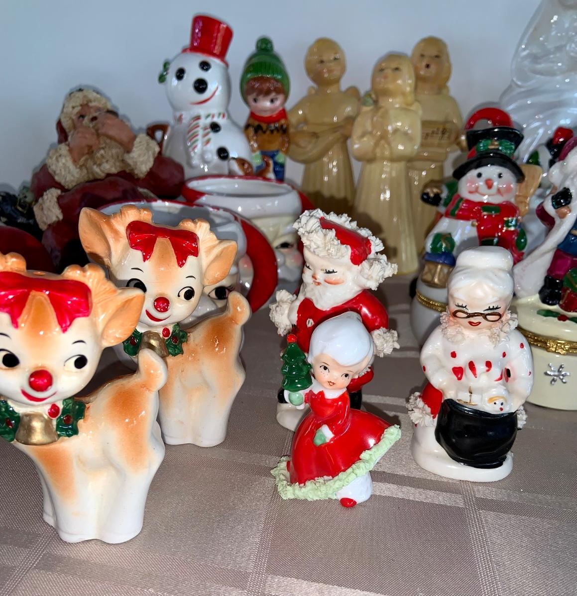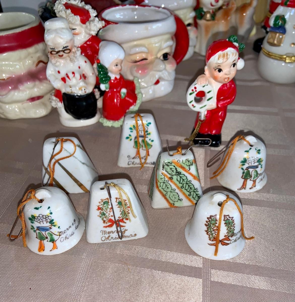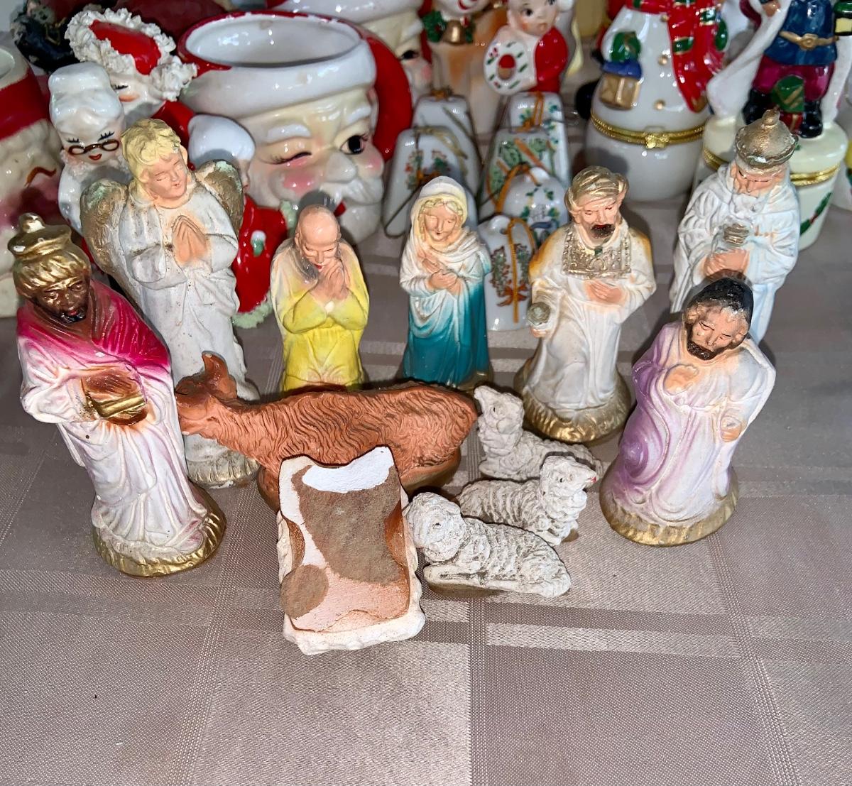 LOT:56G: Vintage Christmas: Nativity Set & Figures, Santa Mugs, Angels, Snowmen, Bells and More.