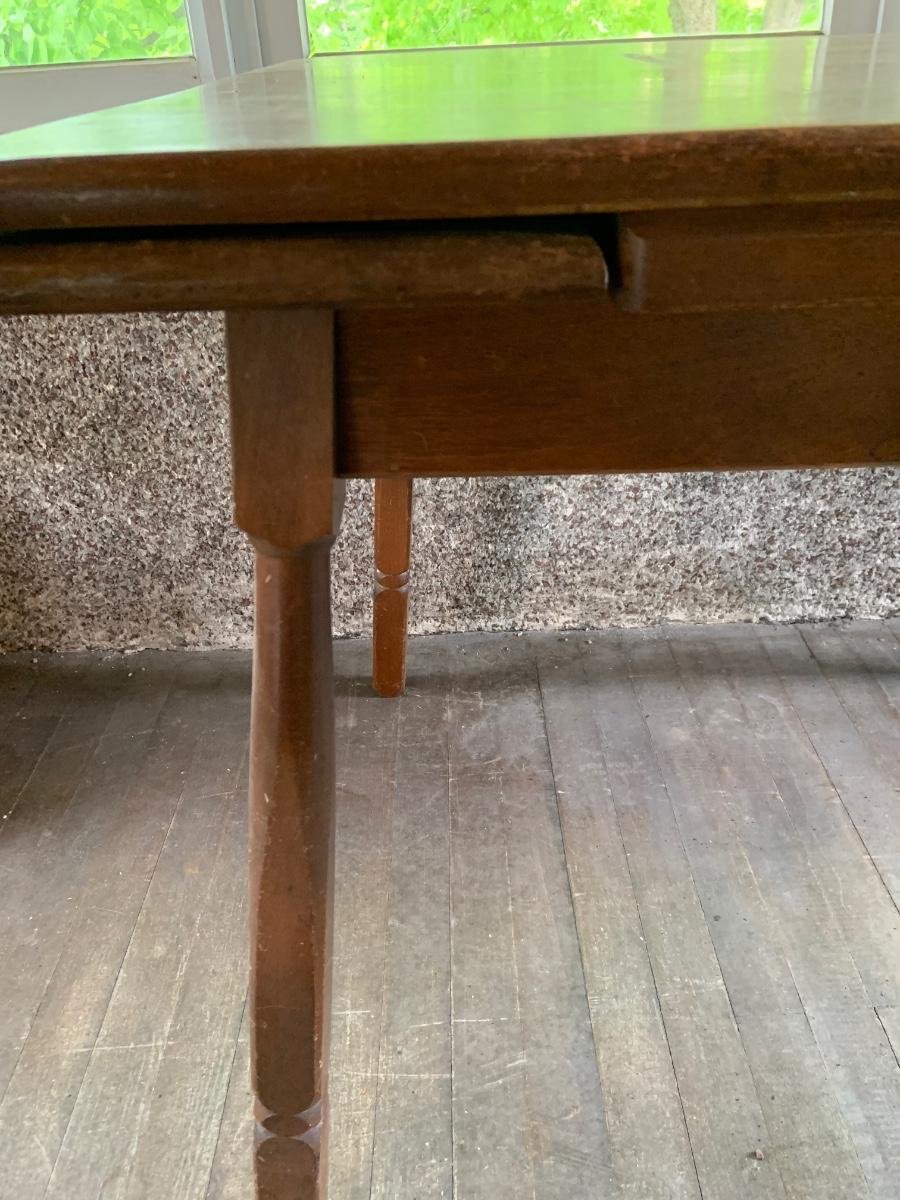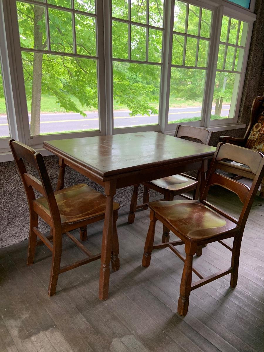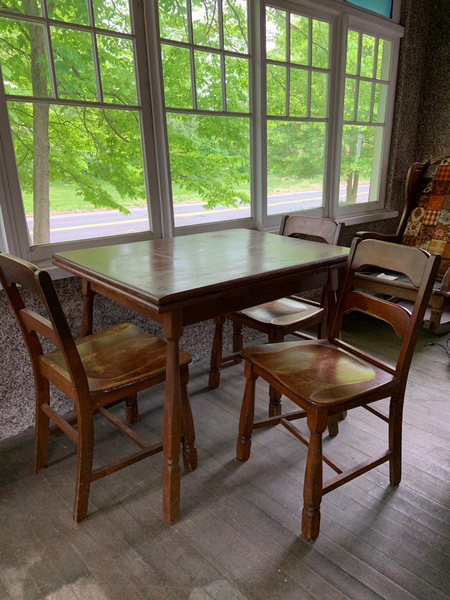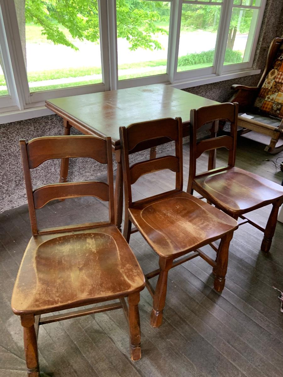 The table measure approximatly 38" x 28" x 30" - 56" with leaf. The chairs are 17" x 15" x 22" .Please see all pictures as they are the best representation of the items. The pictures show condition, measurements if taken, and what is included in the lot. Due to the large amount that we photograph and the time frame, we are not always able to take measurements. All items unless noted, are pre-owned and have been used. If you purchased furniture, you must bring help. We do not allow one person to carry large furniture out on their own. Bring help, tools and a truck for the safety of our client’s homes, and your personal safety. Any damages that result to the property including walls, and floors due to moving of the furniture will be charged to the buyer. Company policy. Thank you.