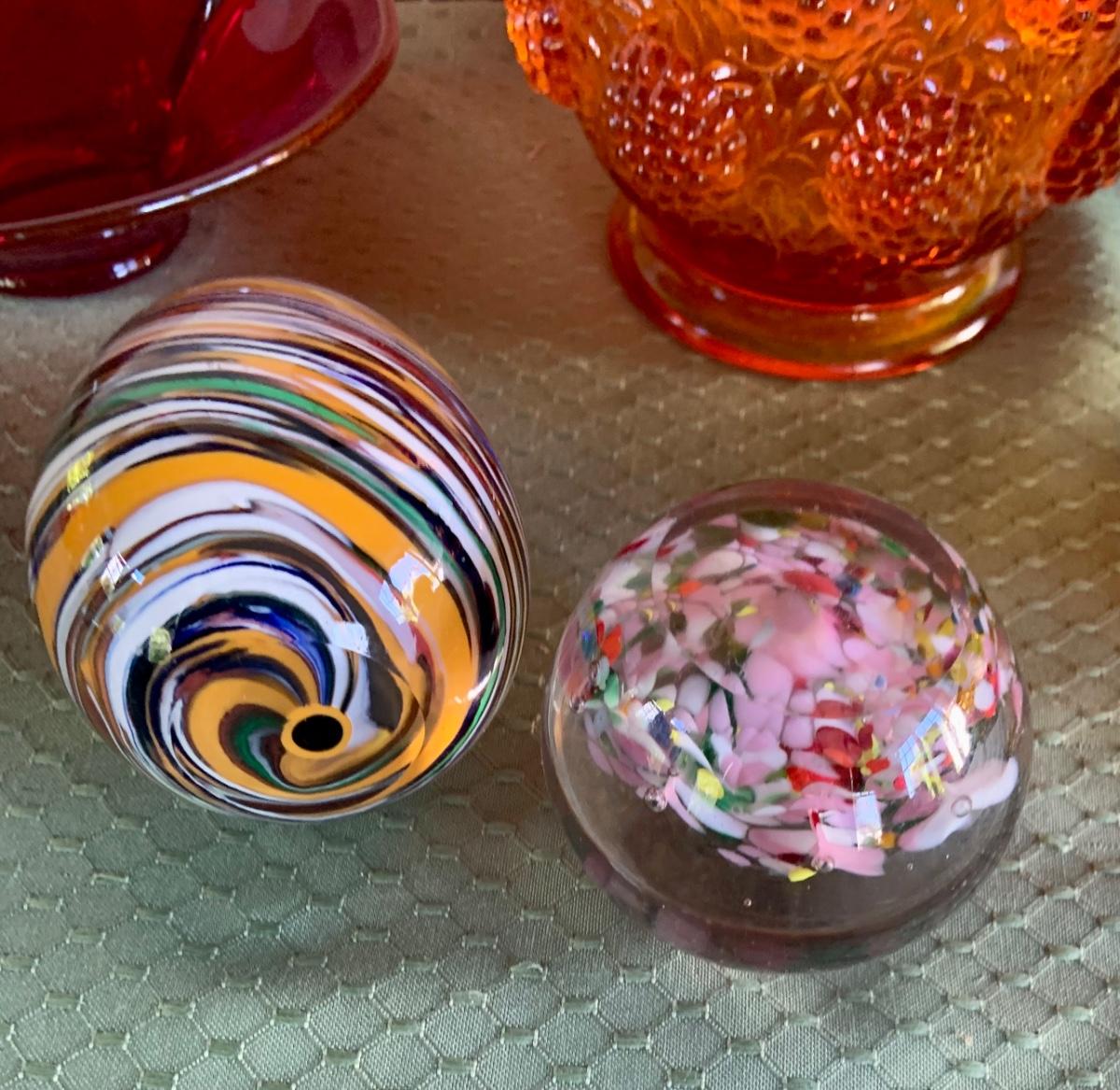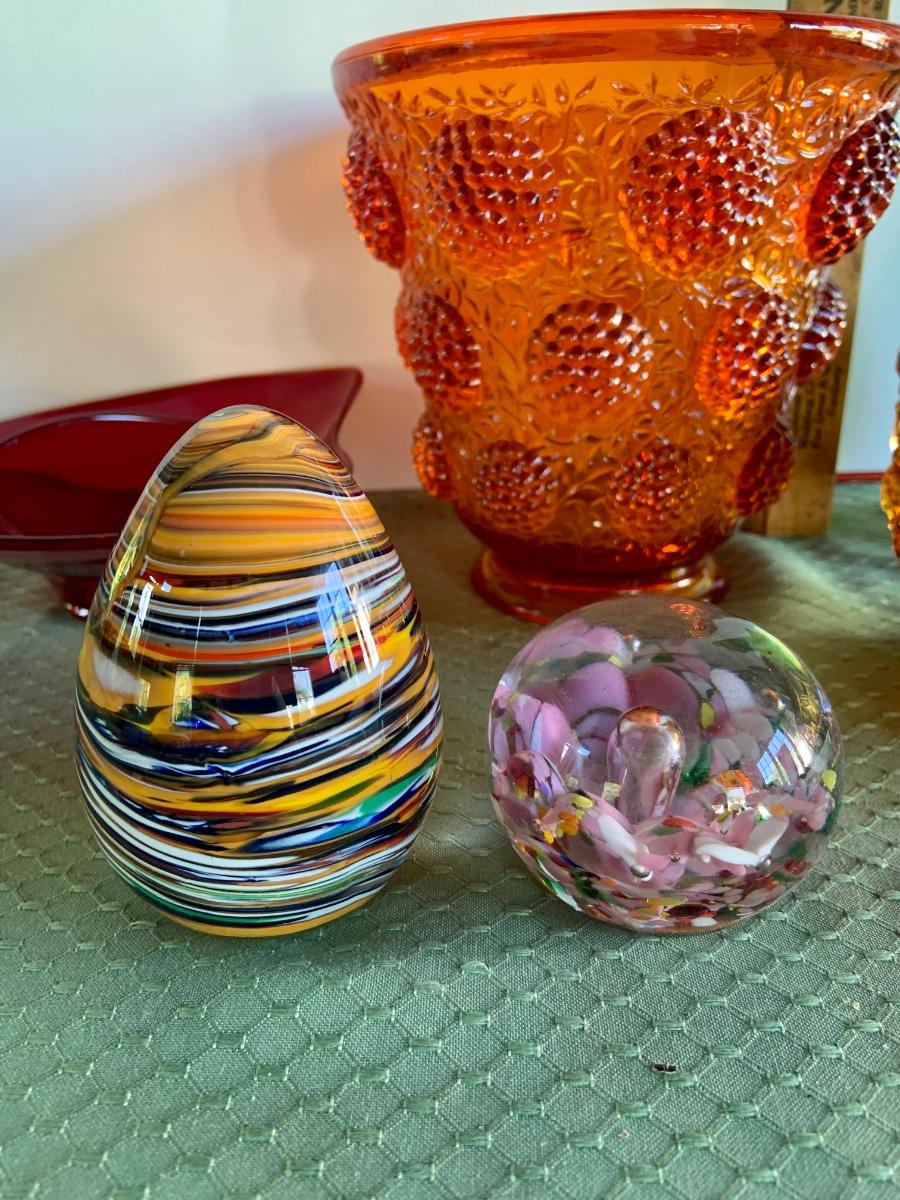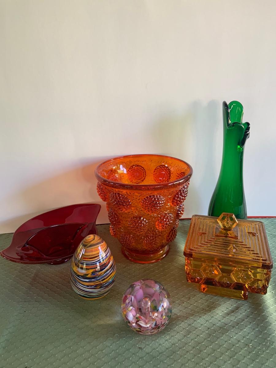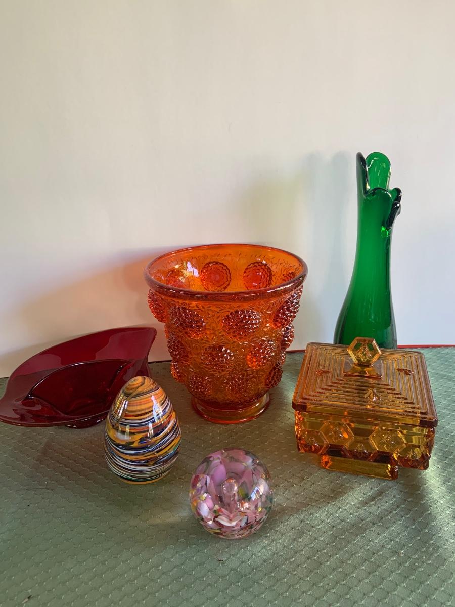 Great collection of Art Glass. Two of the pieces are attributed to Fenton but marks were not noted. One is the amber glass honeycomb and bee patterned candy dish that sells between $50 and $100 online, the other is the orange vase that also sells for $50-$100. Also included are two paperweights, divided ruby red candy dish, and green MCM vase. Please see all pictures as they are the best representation of the items. The pictures show condition, measurements if taken, and what is included in the lot. Due to the large amount that we photograph and the time frame, we are not always able to take measurements. All items unless noted, are pre-owned and have been used. If you purchased furniture, you must bring help. We do not allow one person to carry large furniture out on their own. Bring help, tools and a truck for the safety of our client’s homes, and your personal safety. Any damages that result to the property including walls, and floors due to moving of the furniture will be charged to the buyer. Company policy. Thank you.