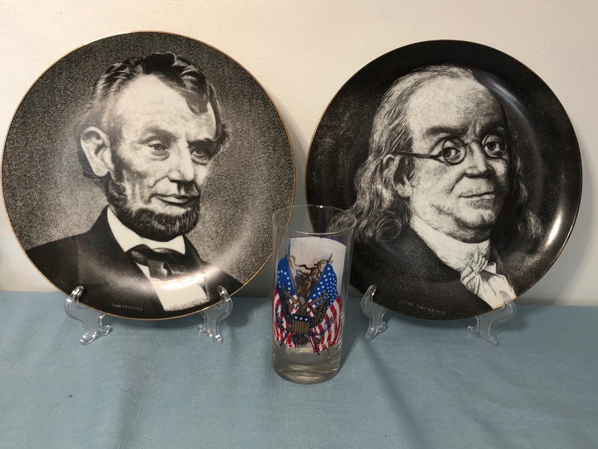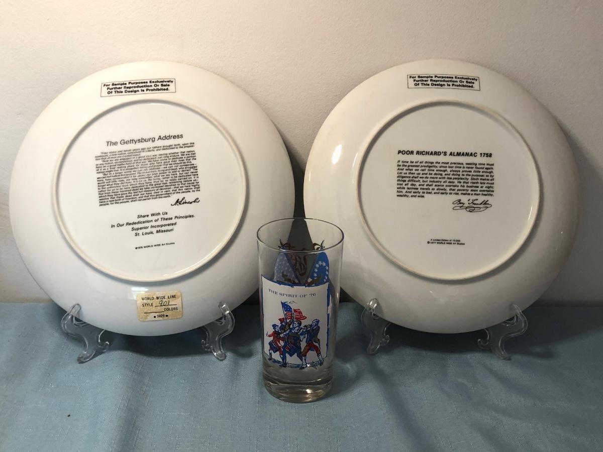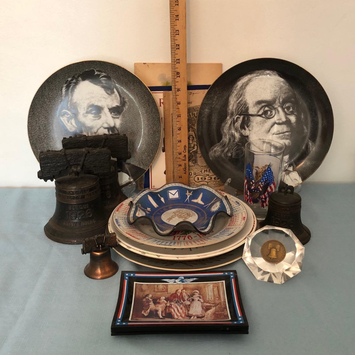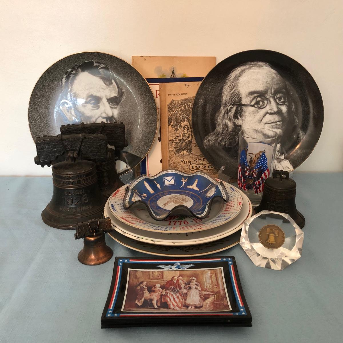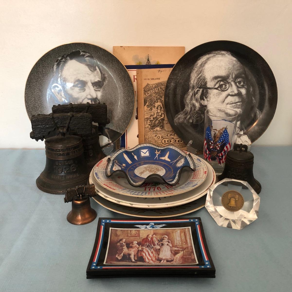 Includes several commemorative plates, Liberty Bell memorabilia, a Spirit of '76 glass, small glass dishes and some books.