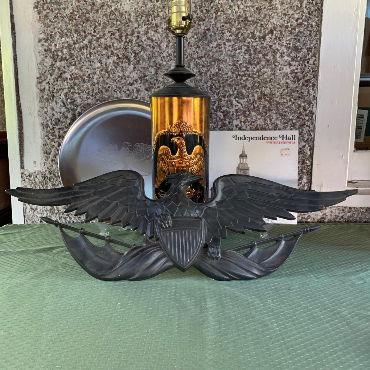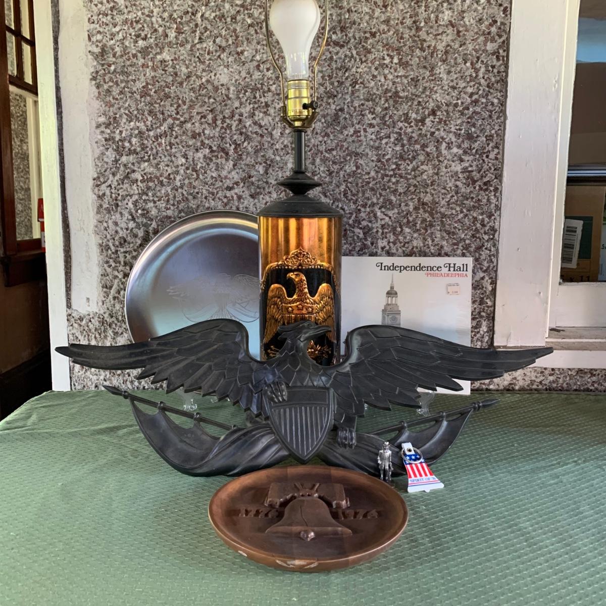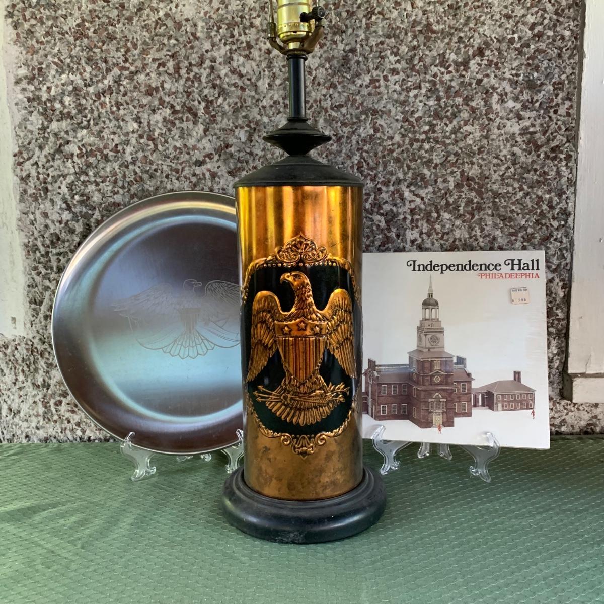 LOT 157R: Vintage Tin Eagle Lamp, Sexton Cast Aluminum Eagle, Fame' Walnut Liberty Plate, Independence Hall Model Kit & More