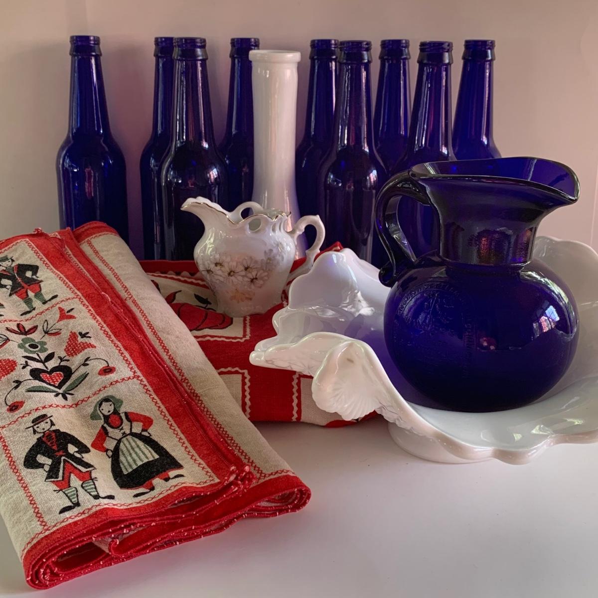 LOT 161R: Milk Glass, Cobalt Blue Pitcher, Folk Art Linens, Brunswick, Germany Creamer/Pitcher & More
