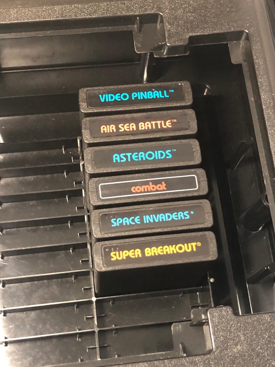 Includes an organizer/case for the Atari and its games, wires, and paddles. When closed with the Atari and accessories inside, the case measures 17 x 12 x 10 inches. Untested, power cord included.