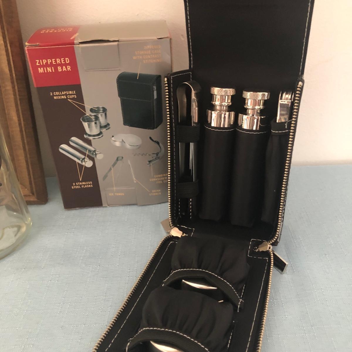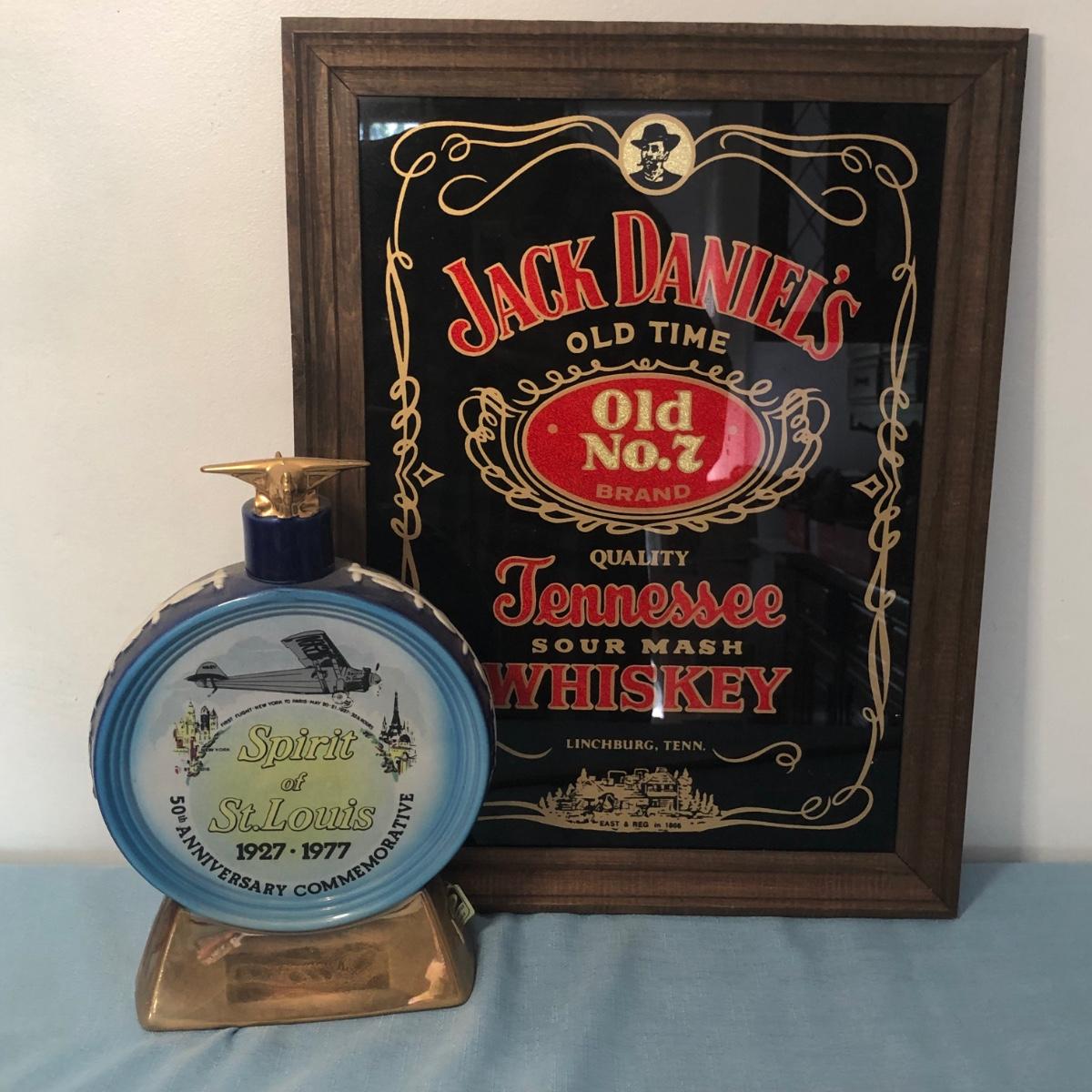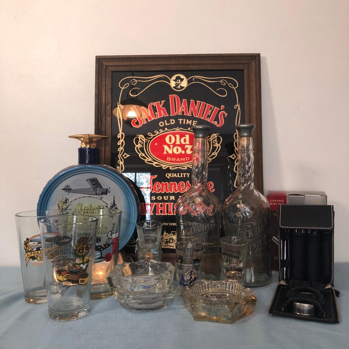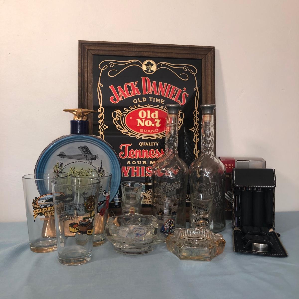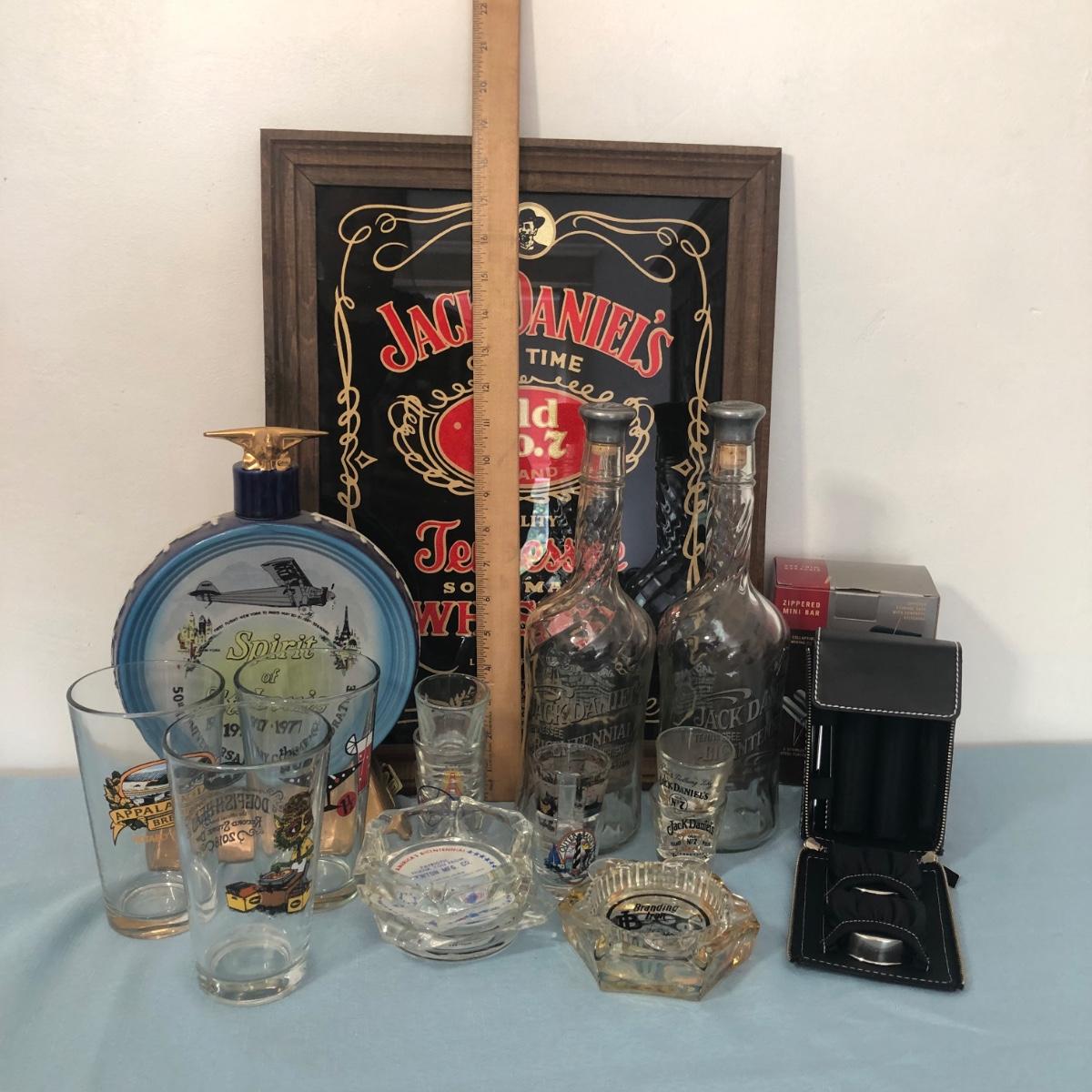 LOT 171M: Bar Collection - Jack Daniels Wall Hanging, Decanters & Shot Glasses, Glass Ash Trays, Pocket Bar Kit