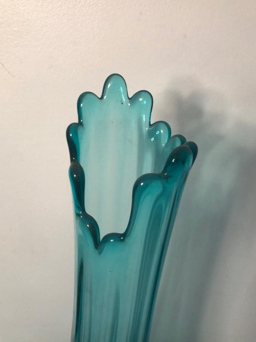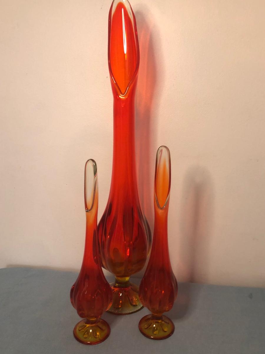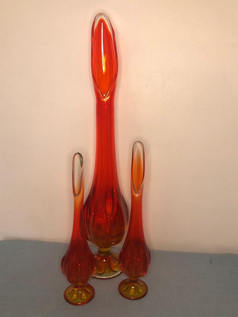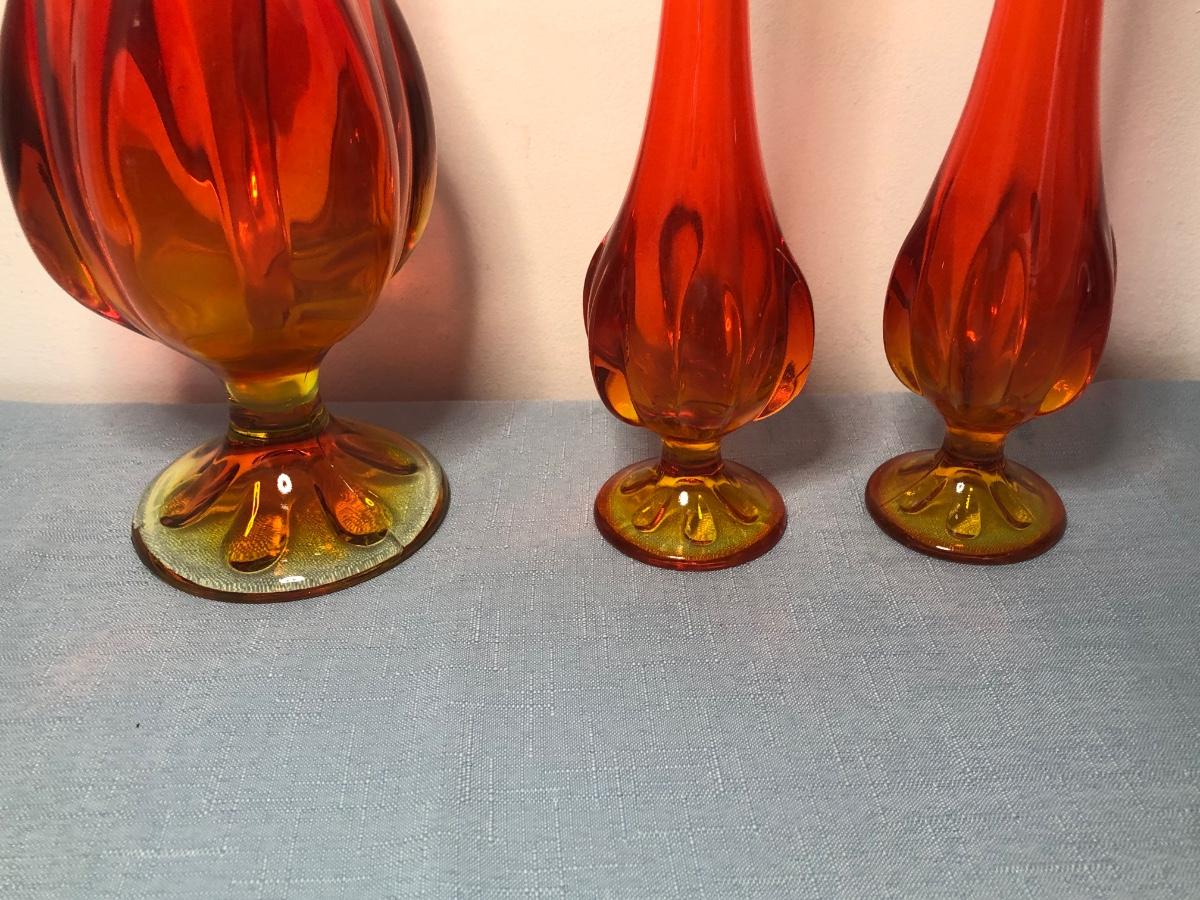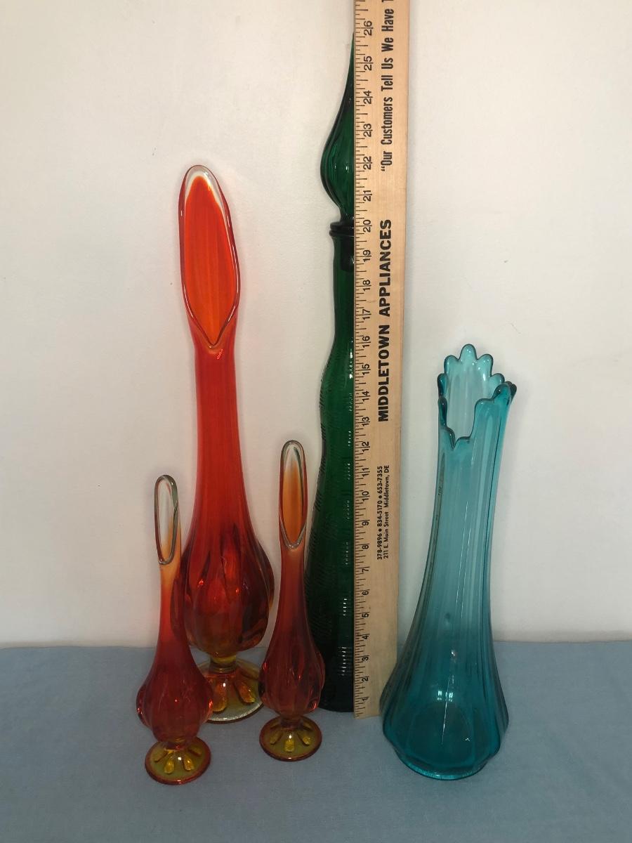Amazing collection of MCM art glass. The tall green decanter vase is unmarked but has been attributed as an Empoli Decanter. Please do your own research to confirm, it is unmarked so we can't guarantee maker. It is 20" without the swirled stopper. The three amberina (persimmon) swung glass vases are attributed to Viking and all have the same petal circle base. and are unmarked. Also included is a blue art glass vase. Please see all pictures as they are the best representation of the items. The pictures show condition, measurements if taken, and what is included in the lot. Due to the large amount that we photograph and the time frame, we are not always able to take measurements. All items unless noted, are pre-owned and have been used. If you purchased furniture, you must bring help. We do not allow one person to carry large furniture out on their own. Bring help, tools and a truck for the safety of our client’s homes, and your personal safety. Any damages that result to the property including walls, and floors due to moving of the furniture will be charged to the buyer. Company policy. Thank you.