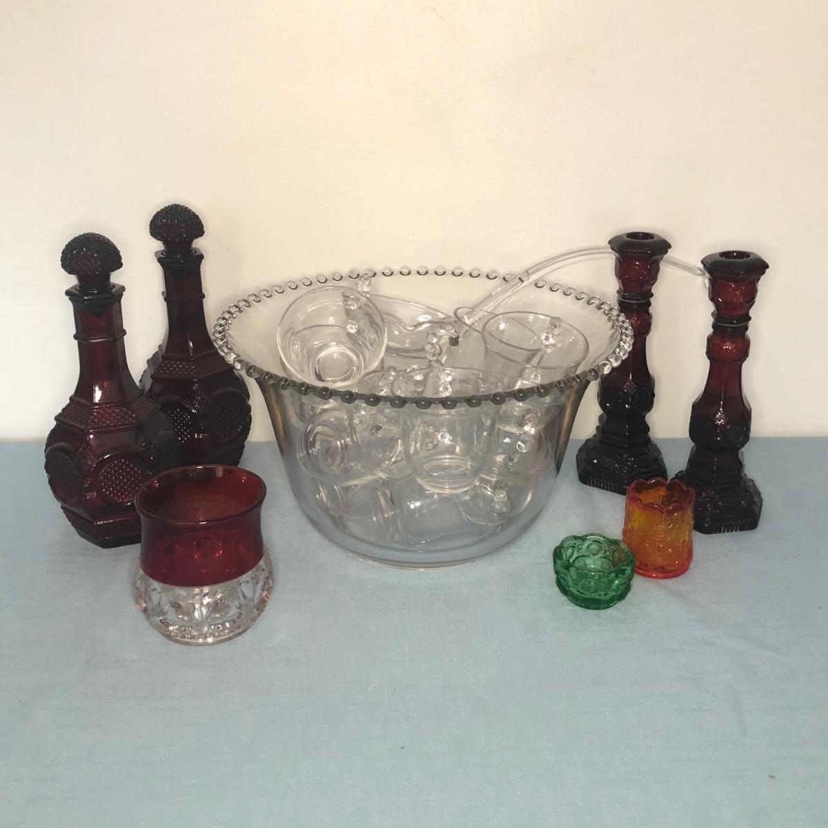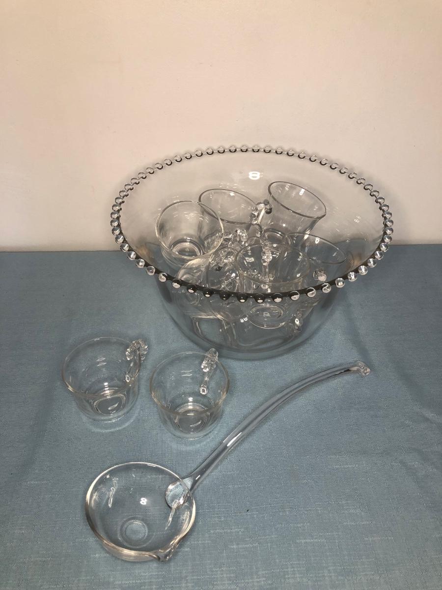 LOT 179M: Large Glass Punch Bowl w/ Serving Spoon & 8 Cups, Avon Cape Cod Collection & More
