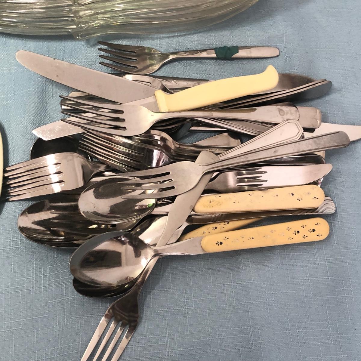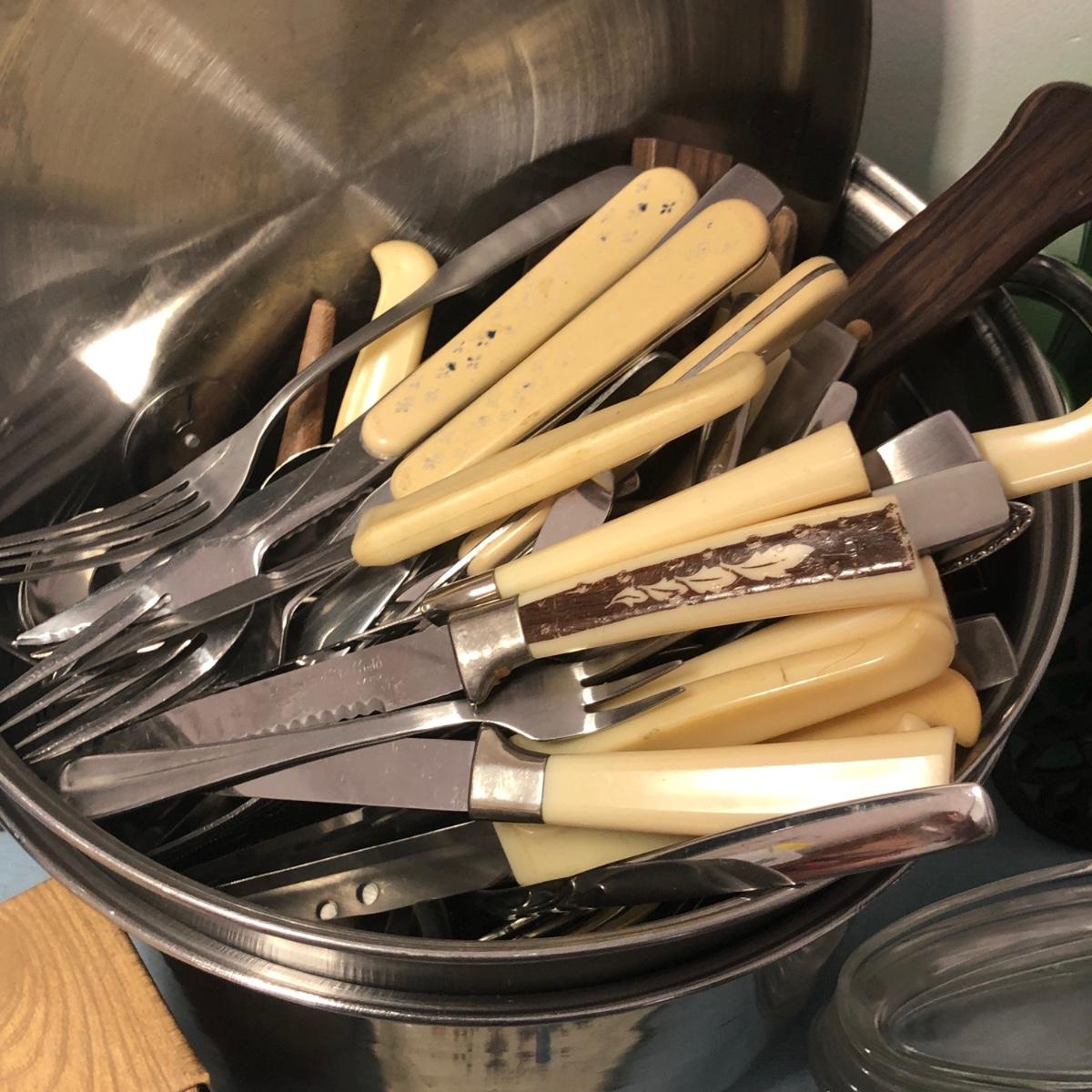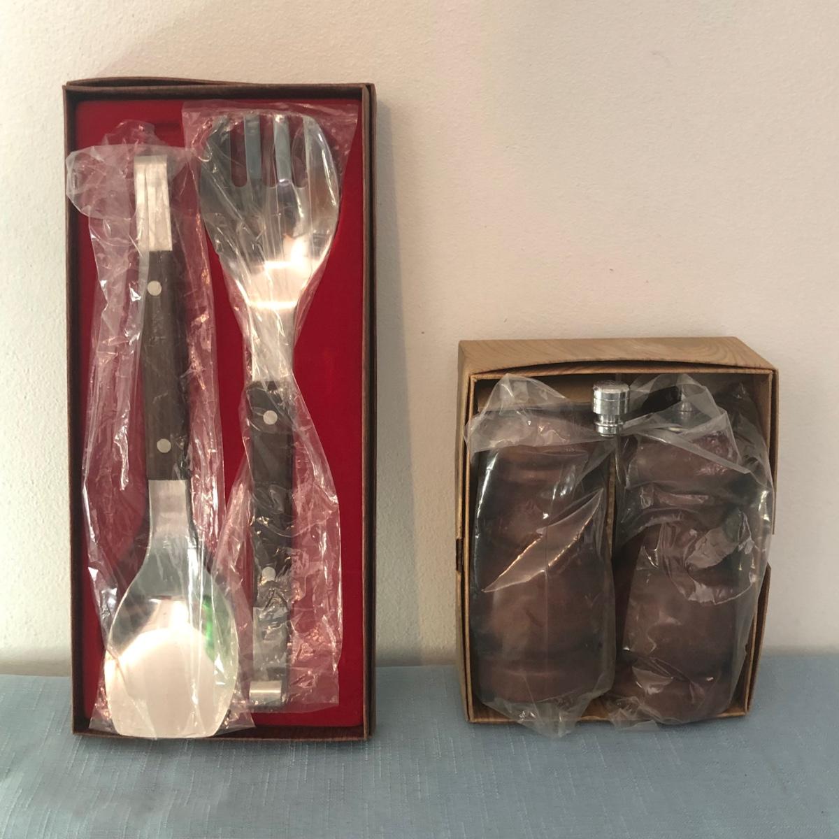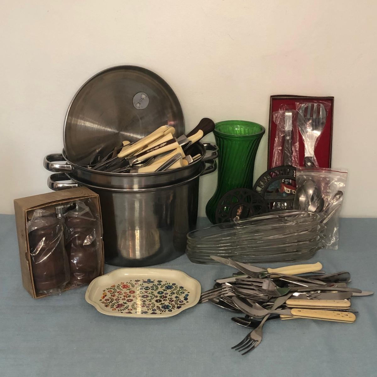 LOT 188M: Kitchen Collection - Wooden S&P Shakers, Tongs, Pot w/ Strainer, Hoosier Glass Vase, Corn Plates, Silverware & More