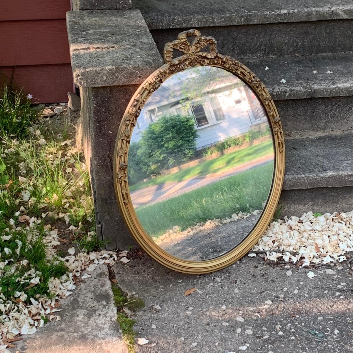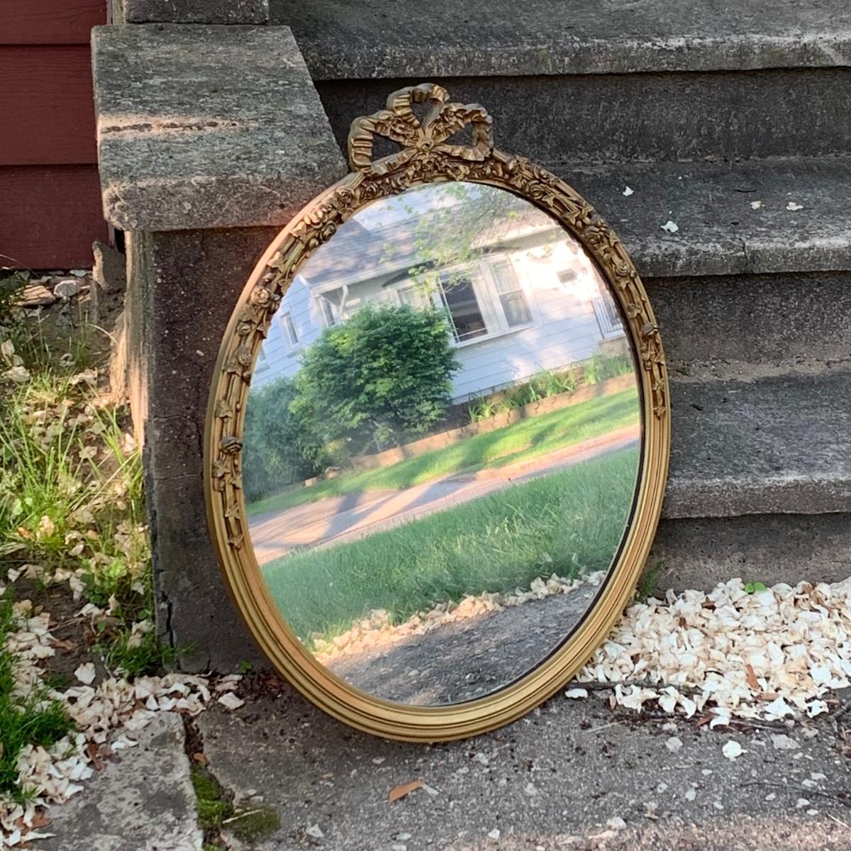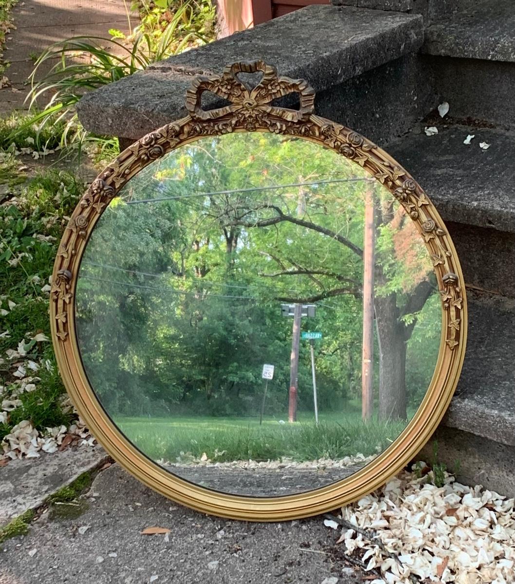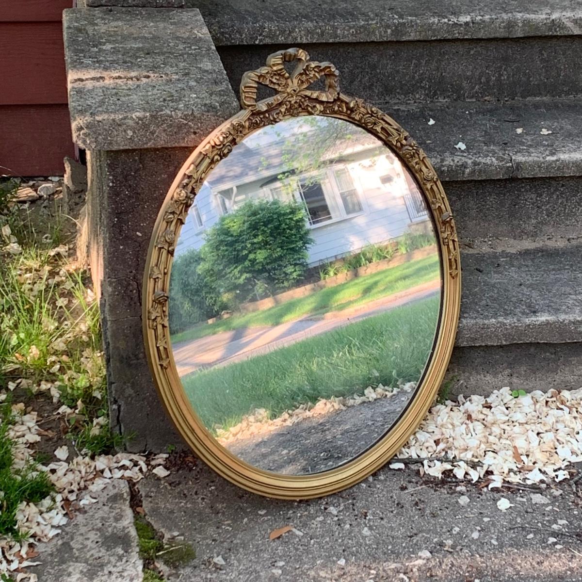 LOT 197R: Vintage Intaglio Round Wall Mirror with Gold Colored Frame with Roses and Bow