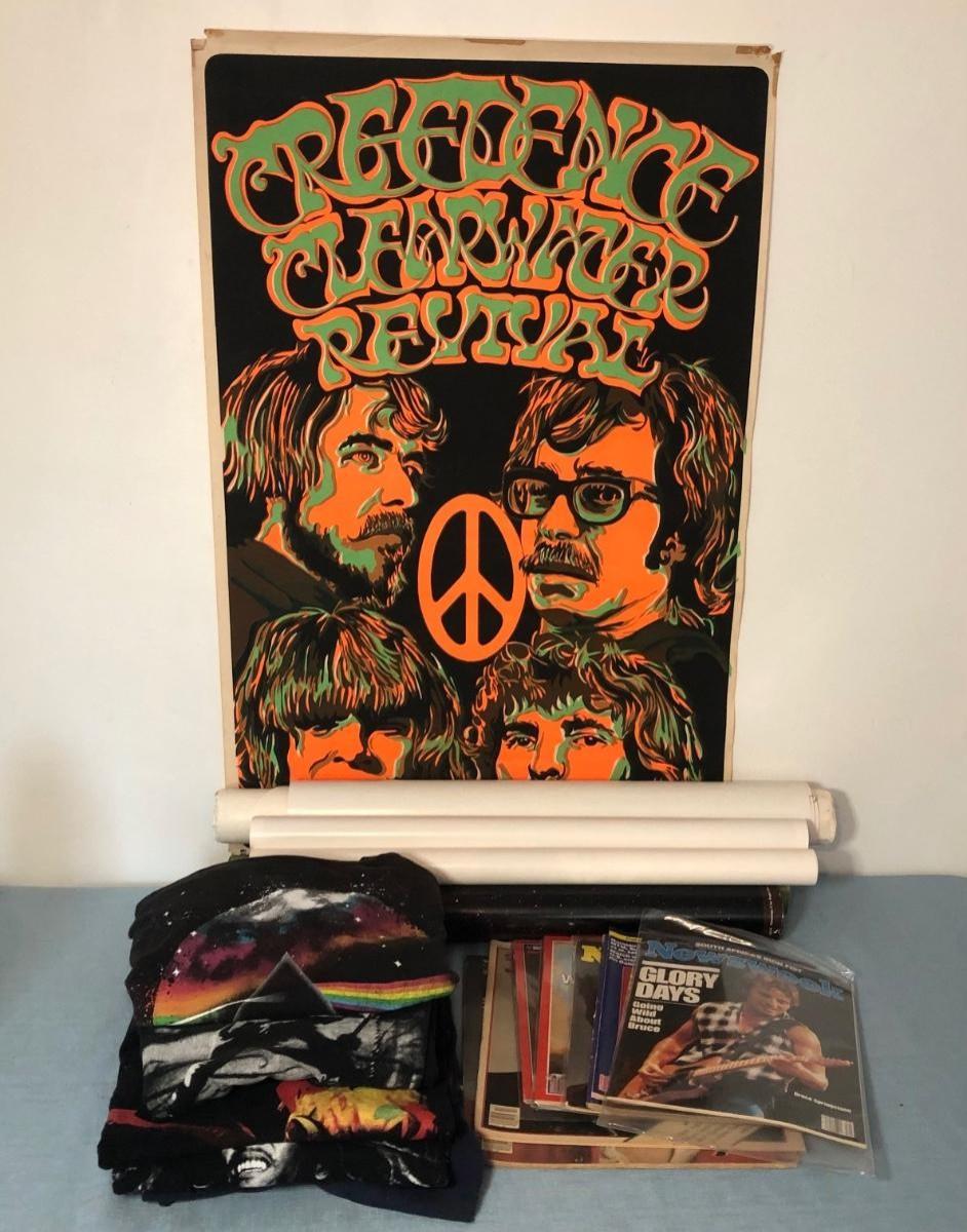 Includes 6 Classic Rock posters, T-shirts in sizes L and XL, and an assortment of magazines. Creedence Clearwater Revival poster measures 22.5 x 35 inches.